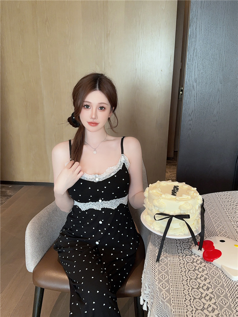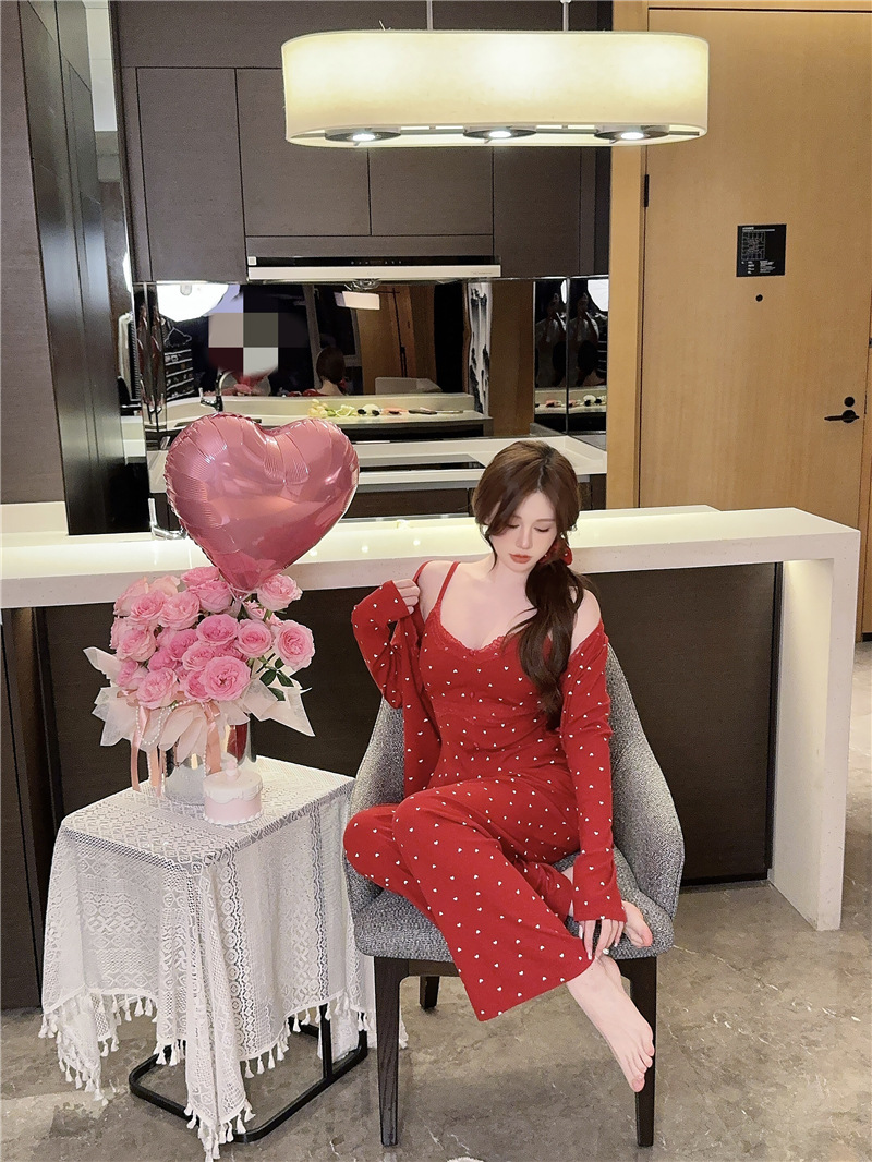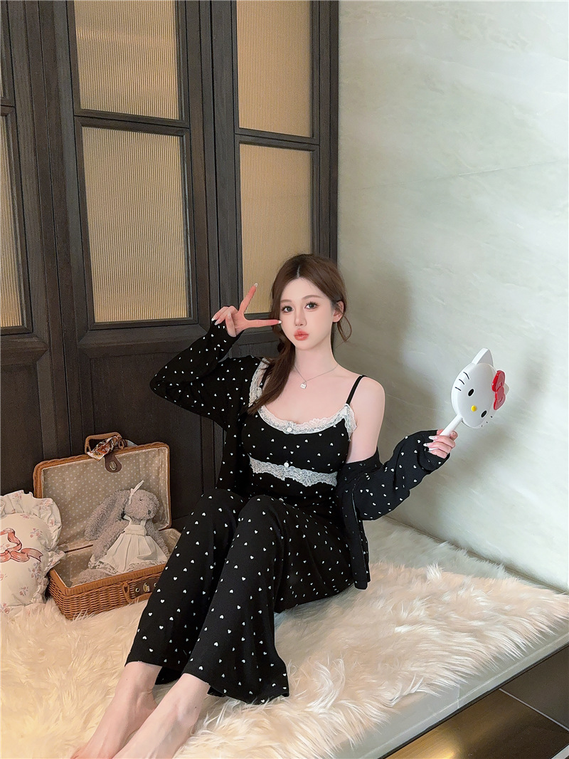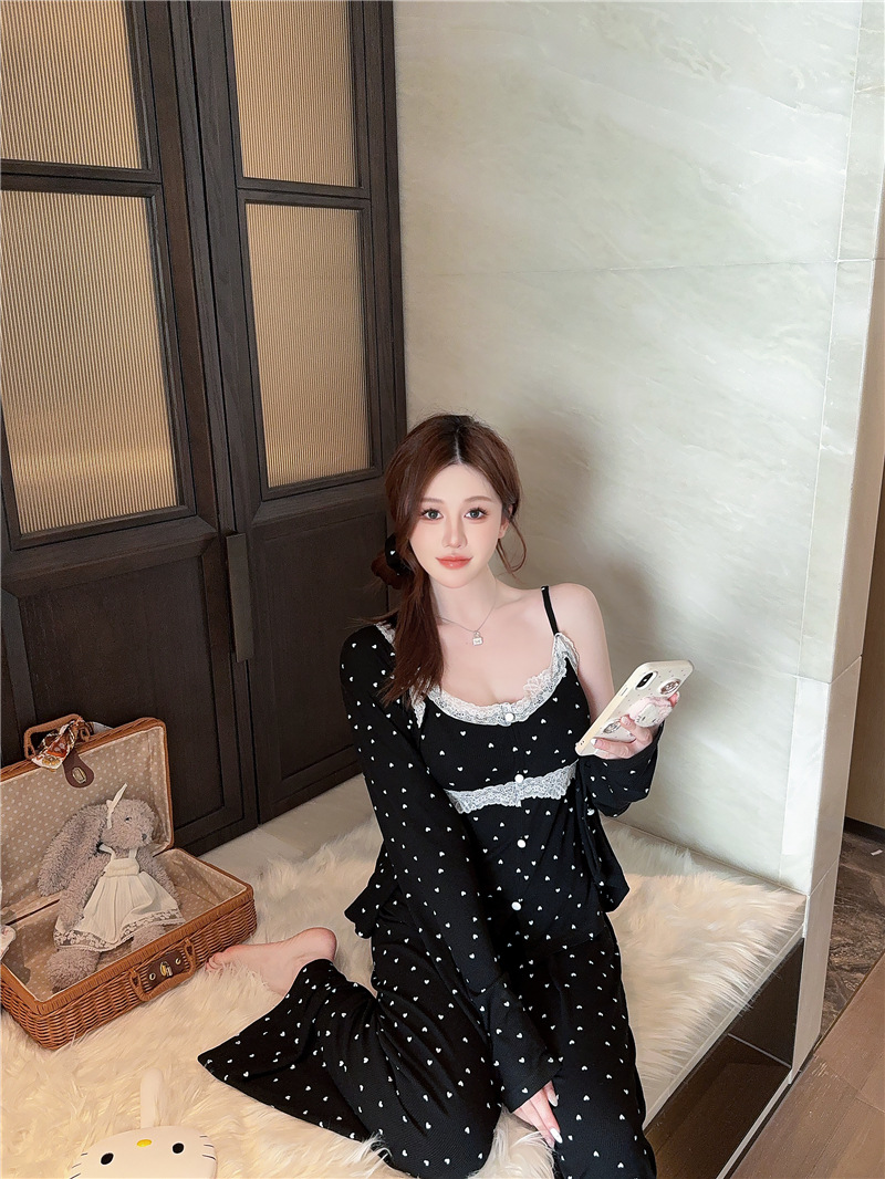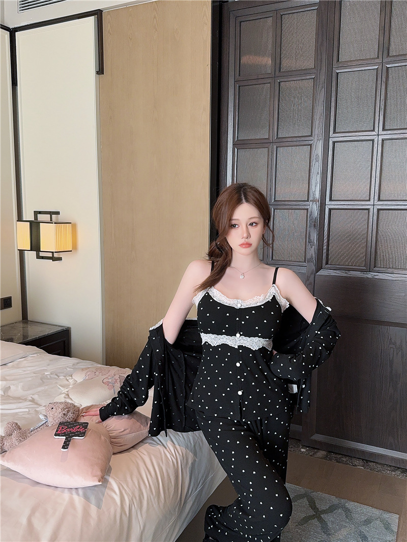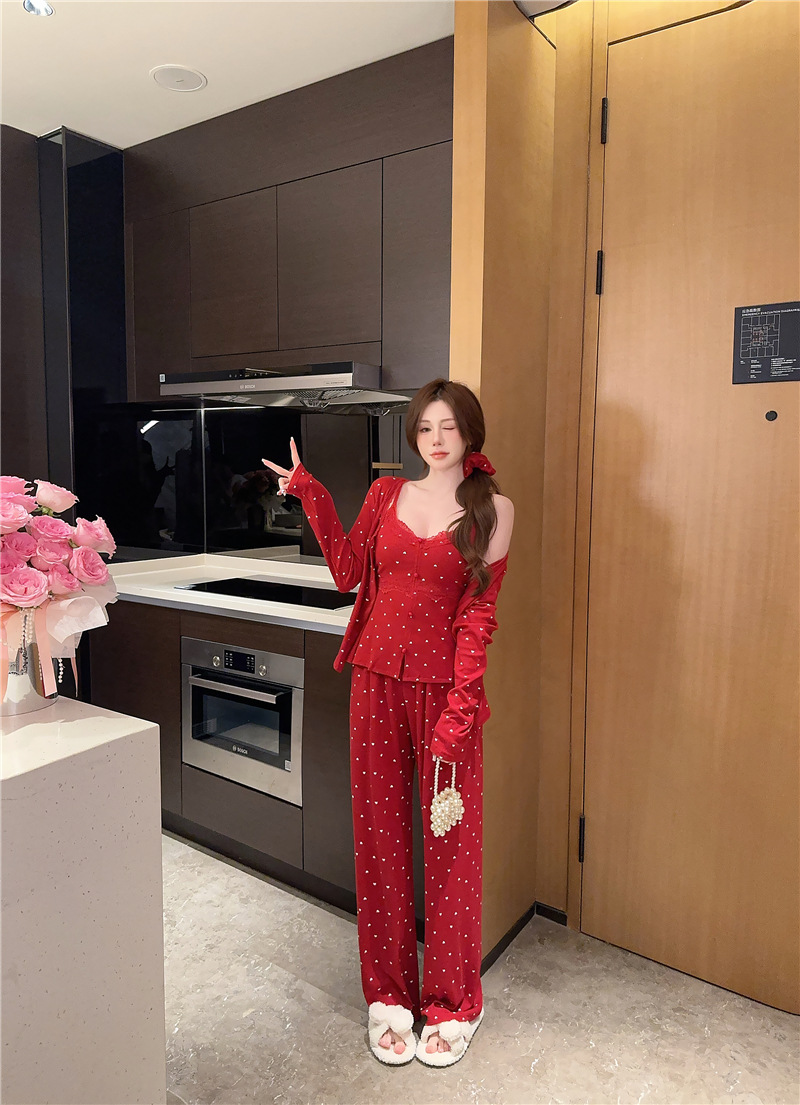 잠옷 여성의 봄과 가을 모달 양면 복숭아 하트 인쇄 긴 소매 바지 슬링 3 피스 세트 플러스 유방면 헤어 벨트