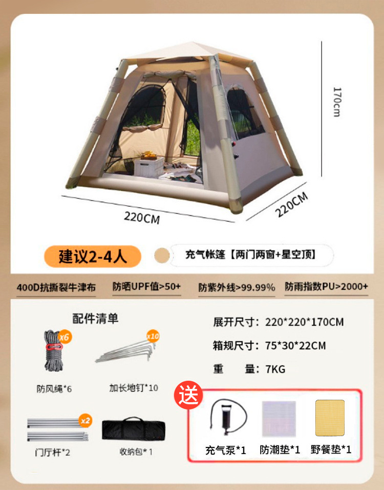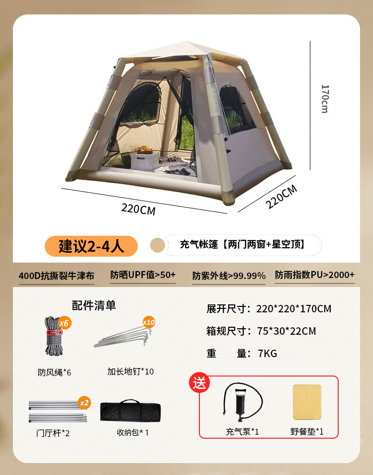 • 팽창식 텐트(수동 공기 펌프 + 방습 매트 + 피크닉 매트 포함)