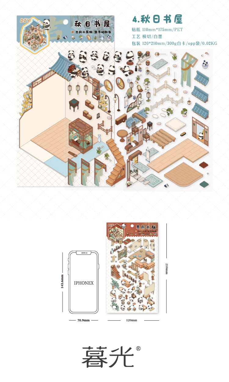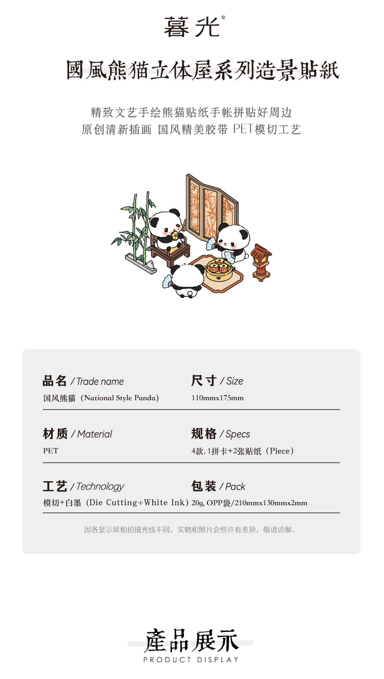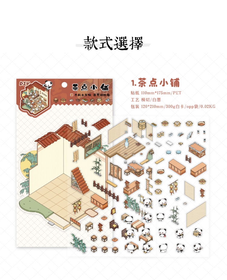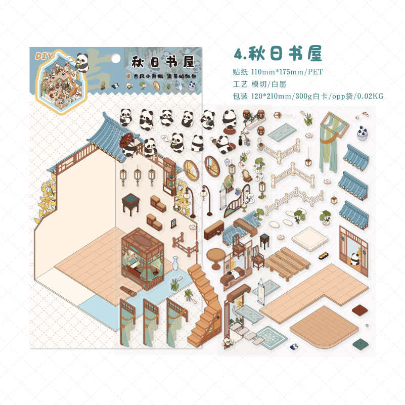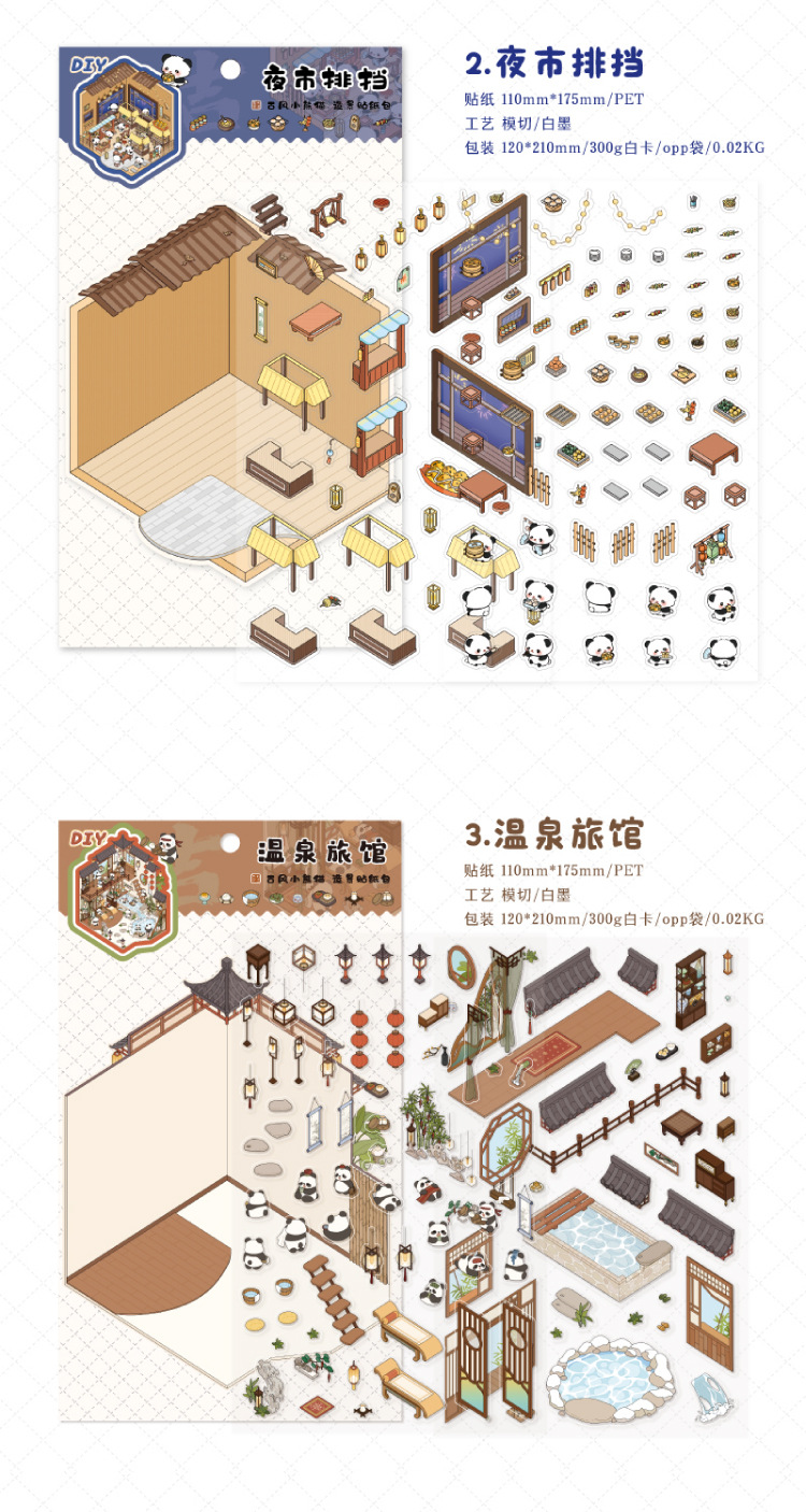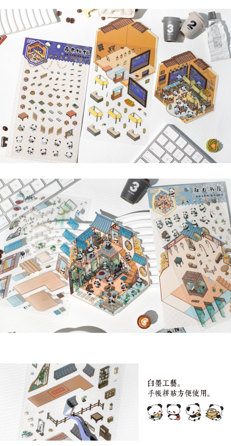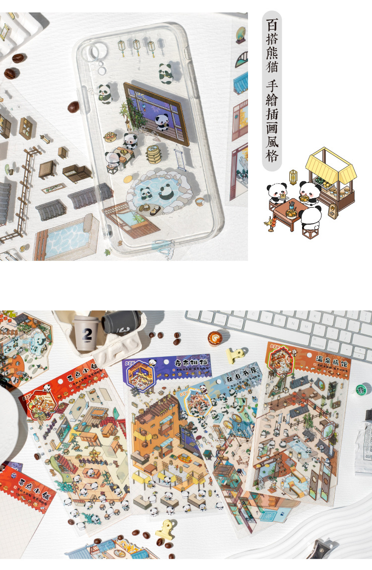 Guofeng 팬더 스테레오 하우스 풍경 PET 스티커 손으로 그린 그림 가게 레이아웃 손 계정 콜라주 장식 스티커스토어 가기