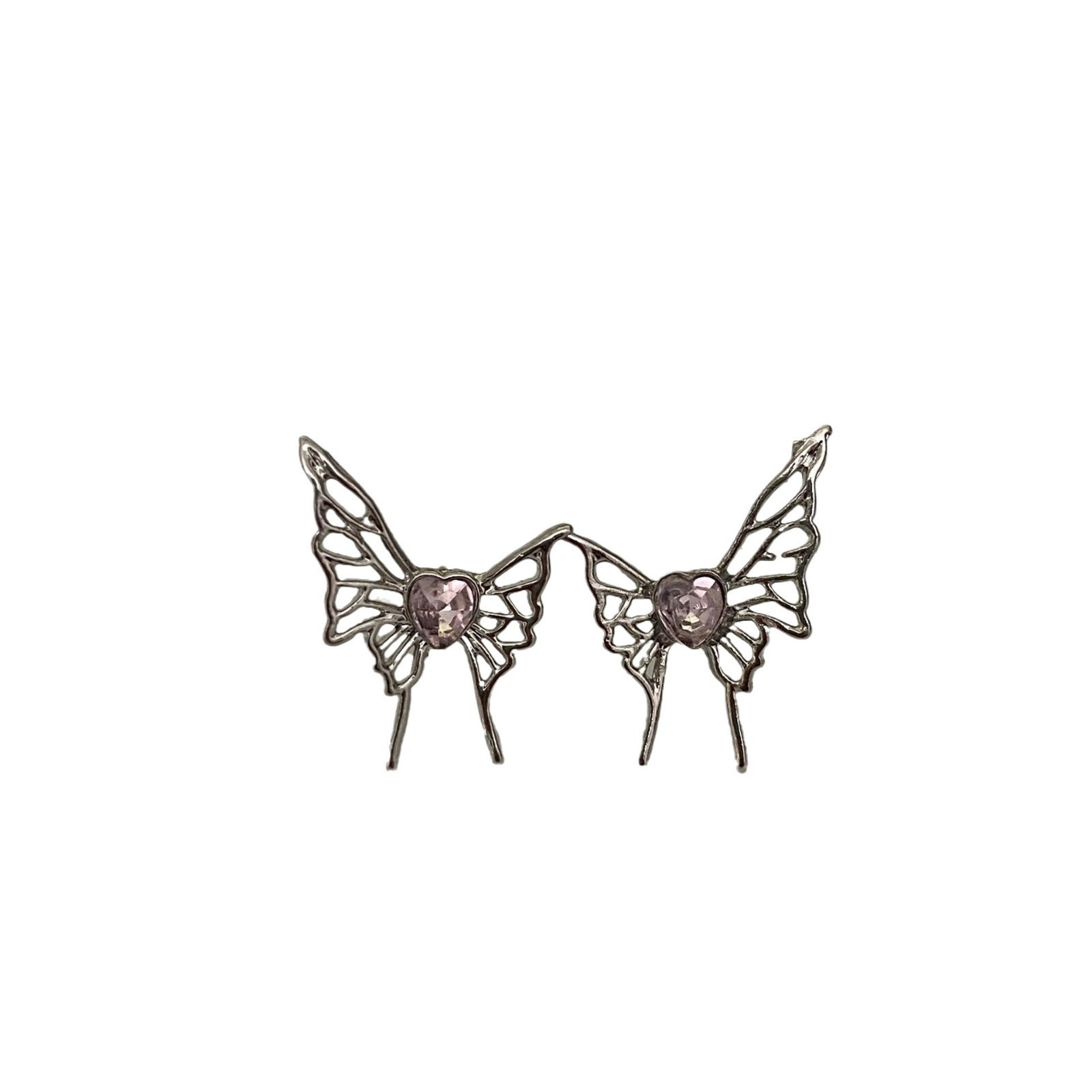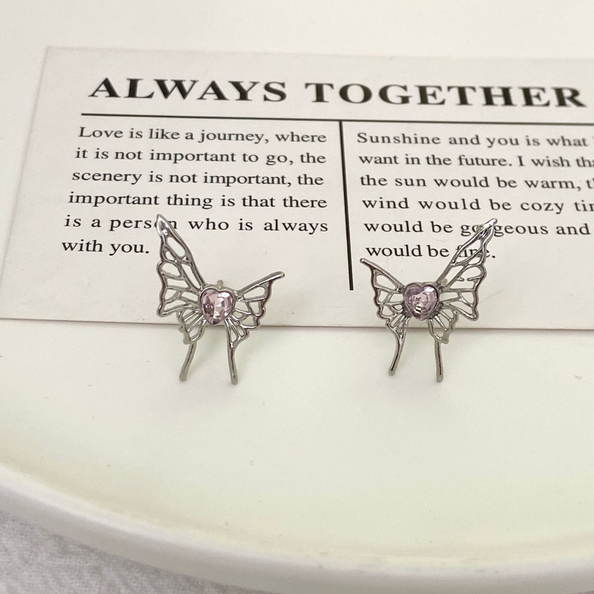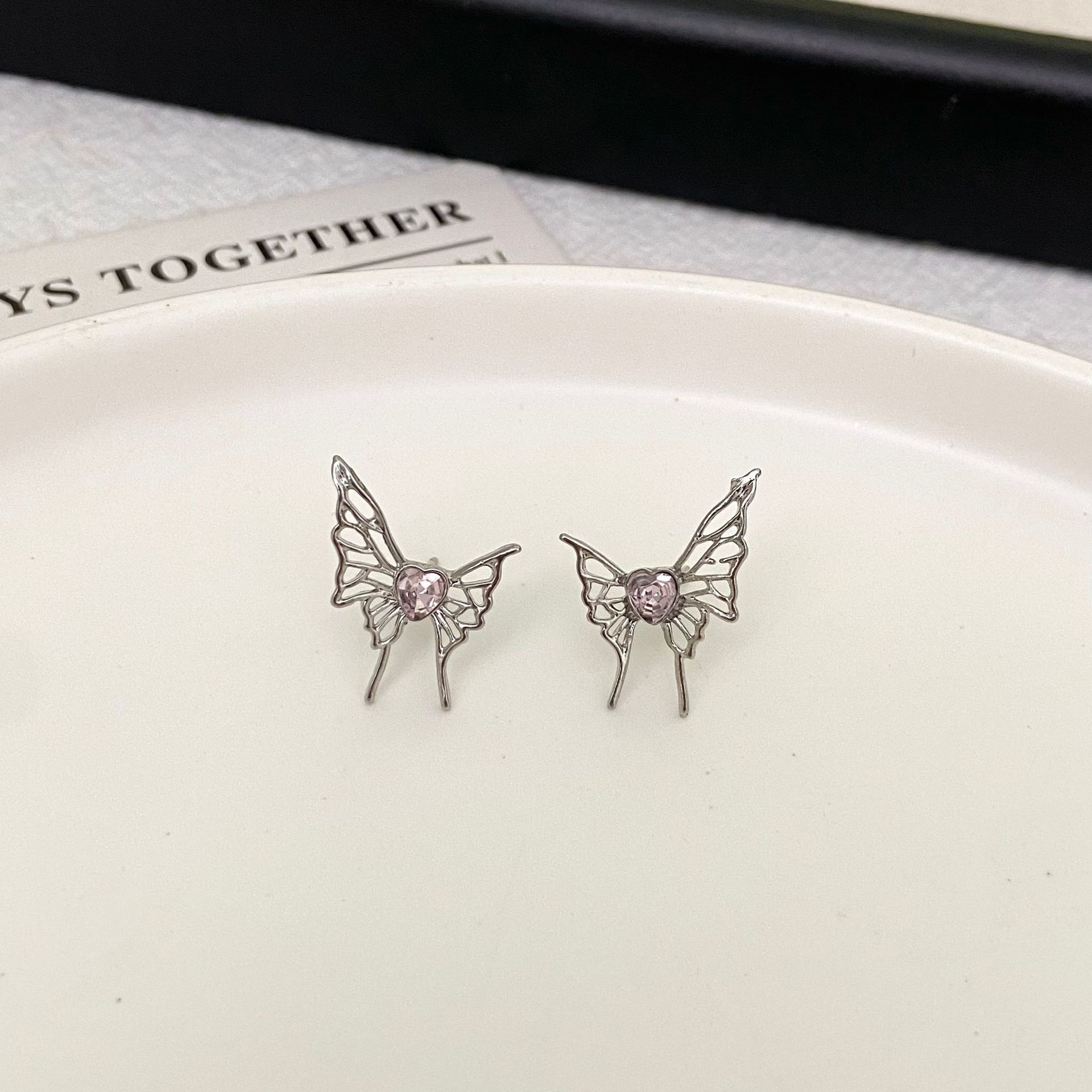 • 중공 나비 하트 핑크 다이아몬드 스터드 귀걸이