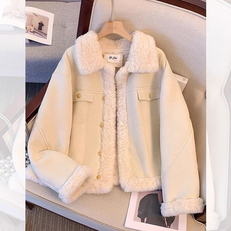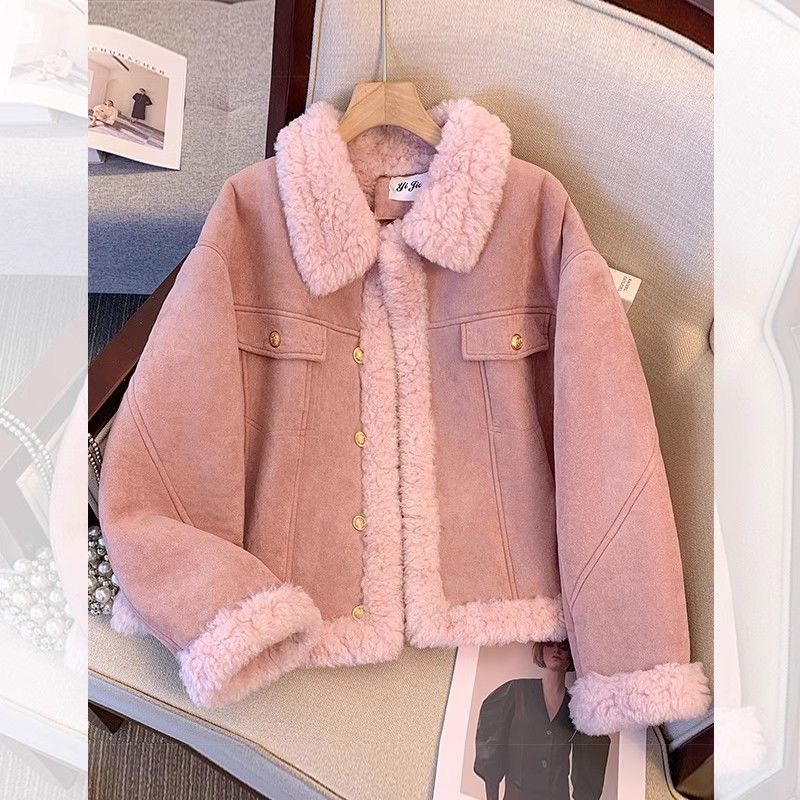 하이 엔드 샤넬 스타일 Lambswool Coat 여성용 2024 가을 및 겨울 뉴 기모 두꺼운 스웨이드 재킷스토어 가기