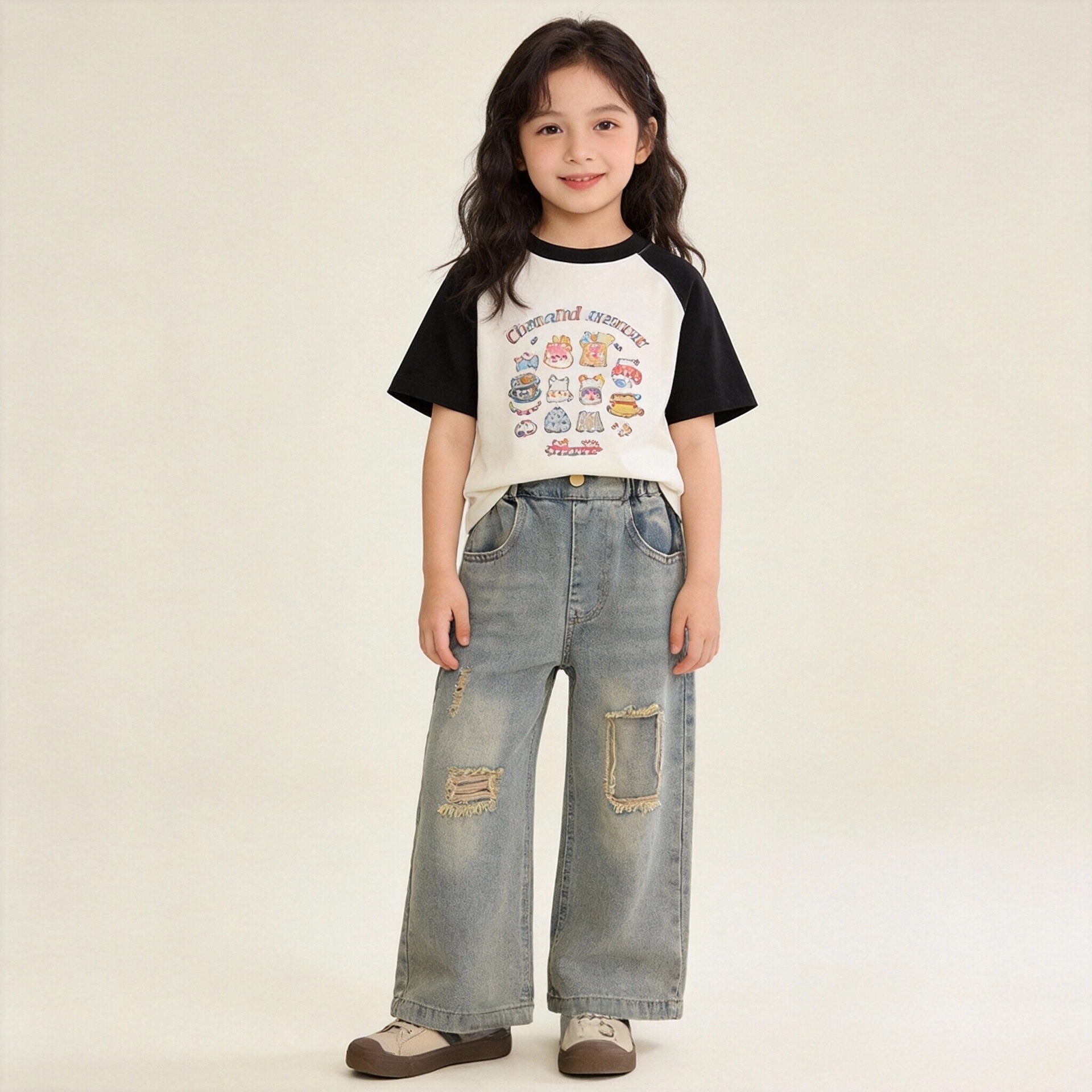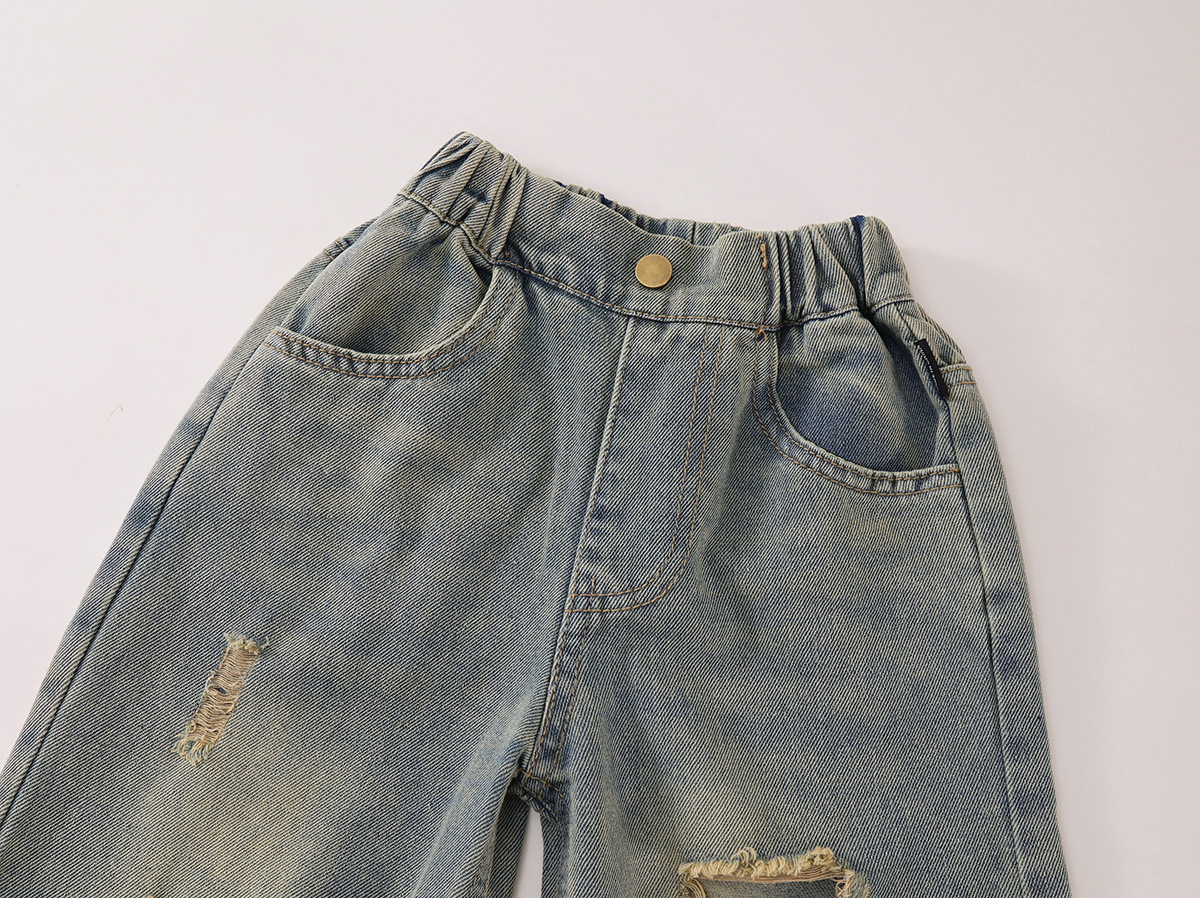 어린이 찢어진 청바지 2025 봄과 여름 새로운 소녀 한국 복고풍 유행 스트레이트 바지 머리카락 세대