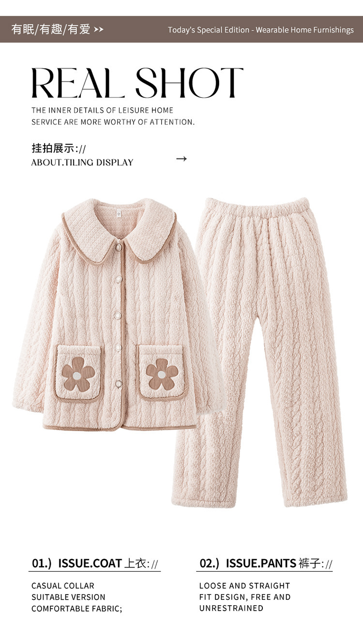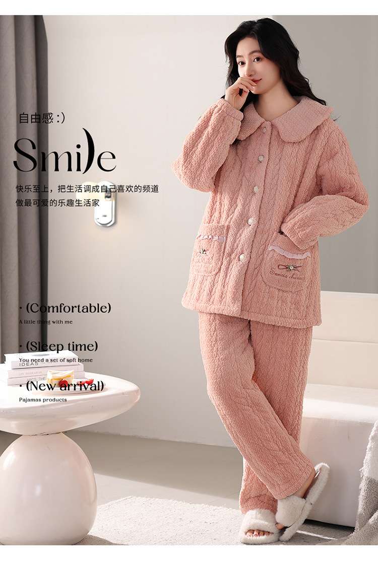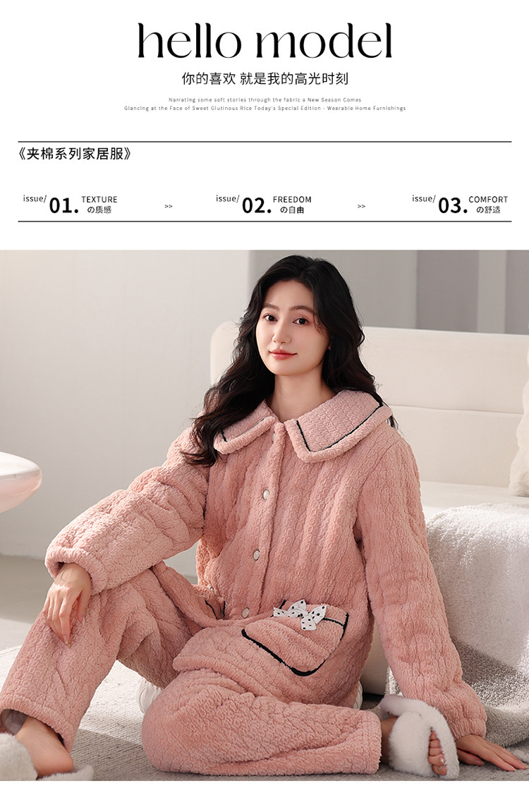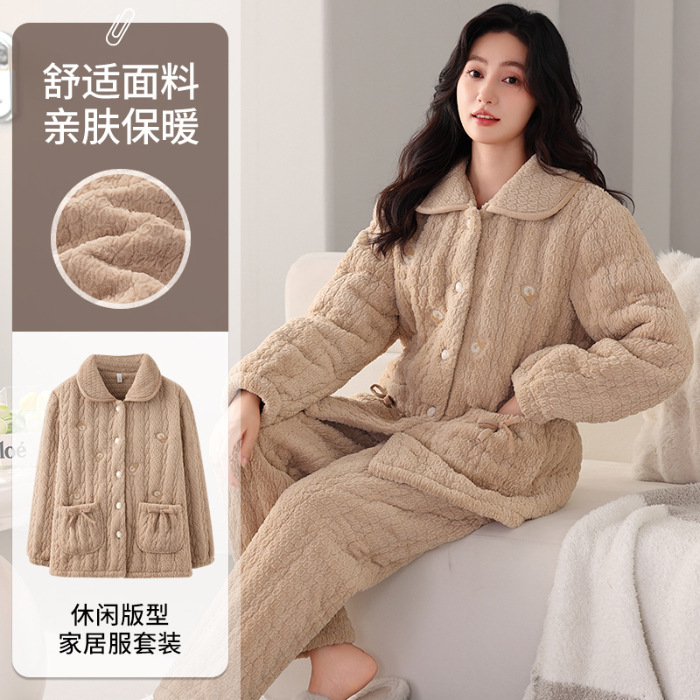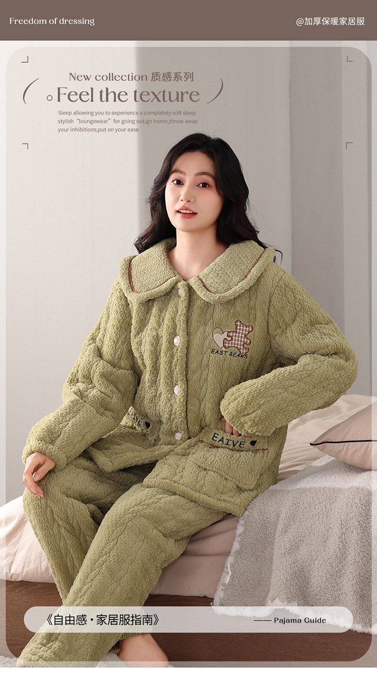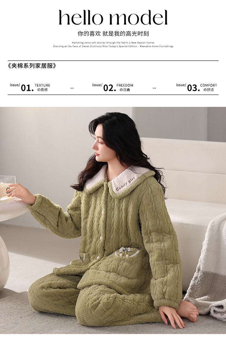 밀크 벨벳 3 층 두꺼운 퀼트 여성용 파자마 따뜻한 귀여운 기모 겨울 스위트 홈 옷 세트 코튼 패딩 재킷