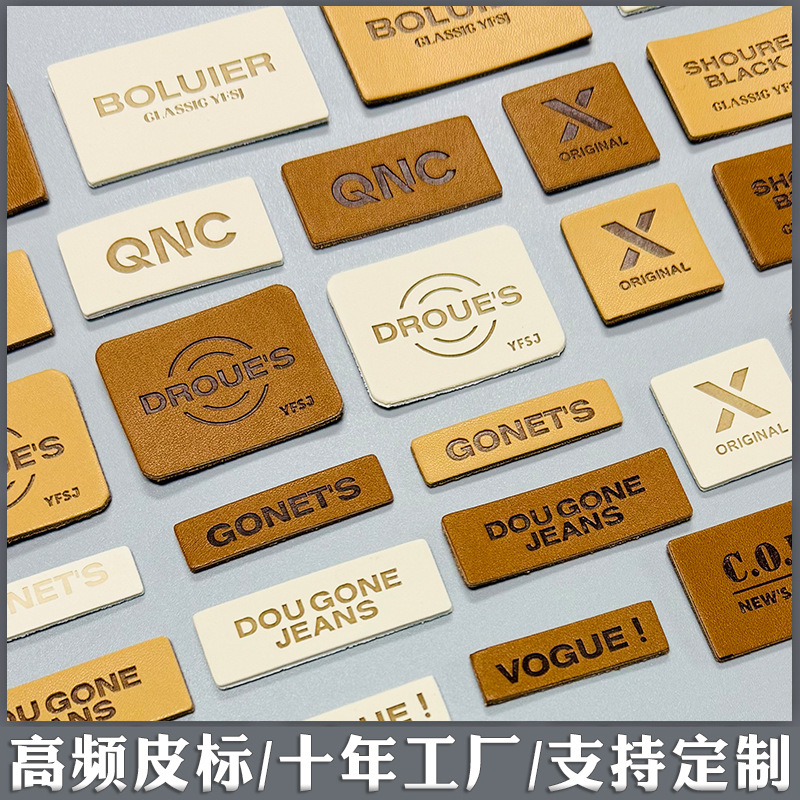 고주파 가죽 라벨 10 년 공장 하이 퀄리티 pu 가죽 간단한 의류 장식 표준 상자 가방 압력 오목한 가죽 배지 가죽 브랜드스토어 가기