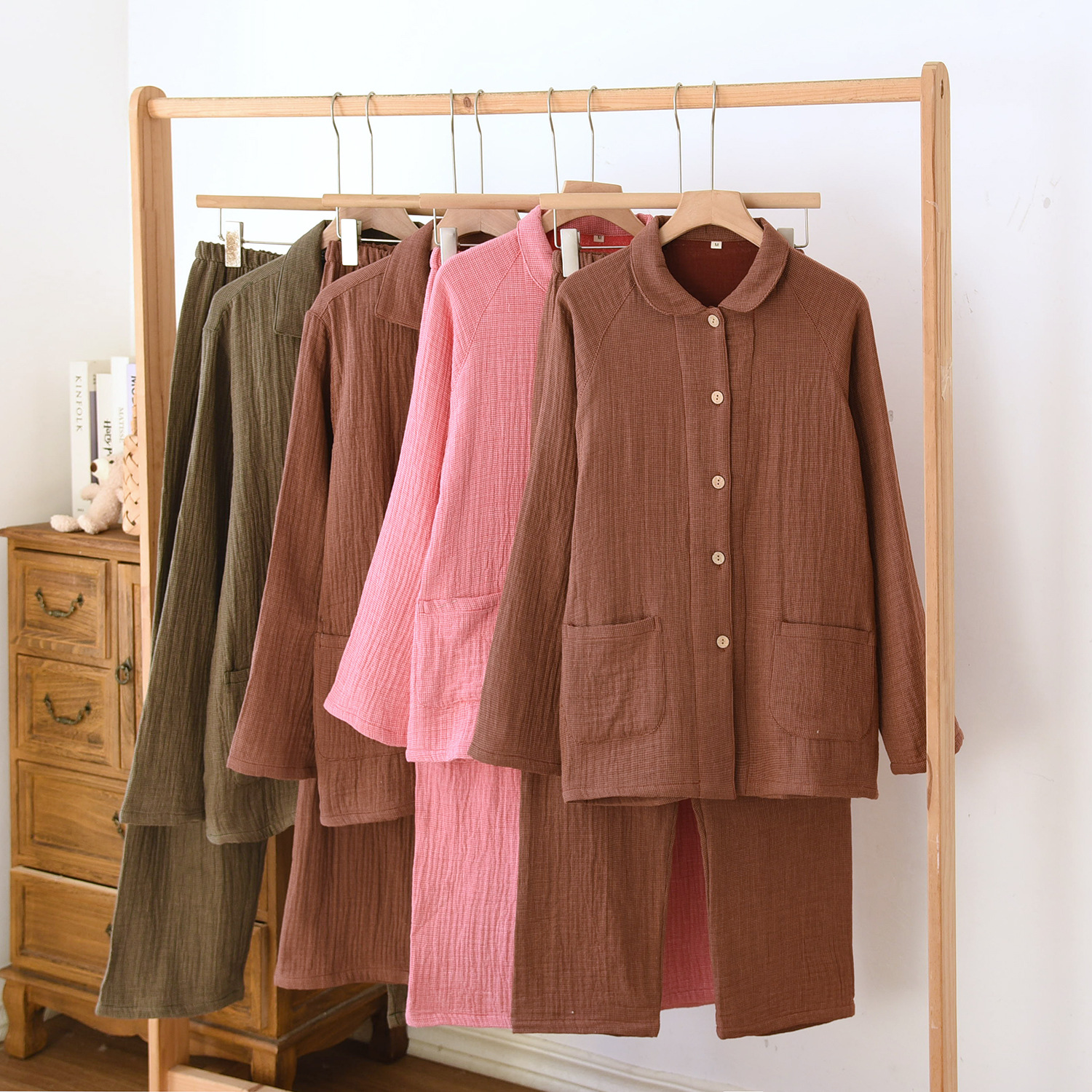 새로운 원사 염색 4 층 원사 파자마 긴 소매 바지 플러스 사이즈 홈 의류 세탁 면사 격자 무늬 커플 사계절 세트스토어 가기