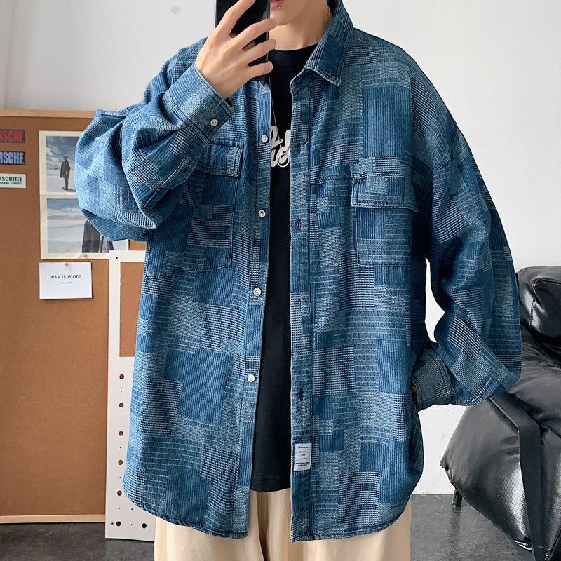 홍콩 스타일의 가을 데님 툴링 코트 하라주쿠 스타일 셔츠 남자의 얇은 일본 스타일 트렌디 브랜드 느슨한 긴팔 캐주얼 셔츠스토어 가기