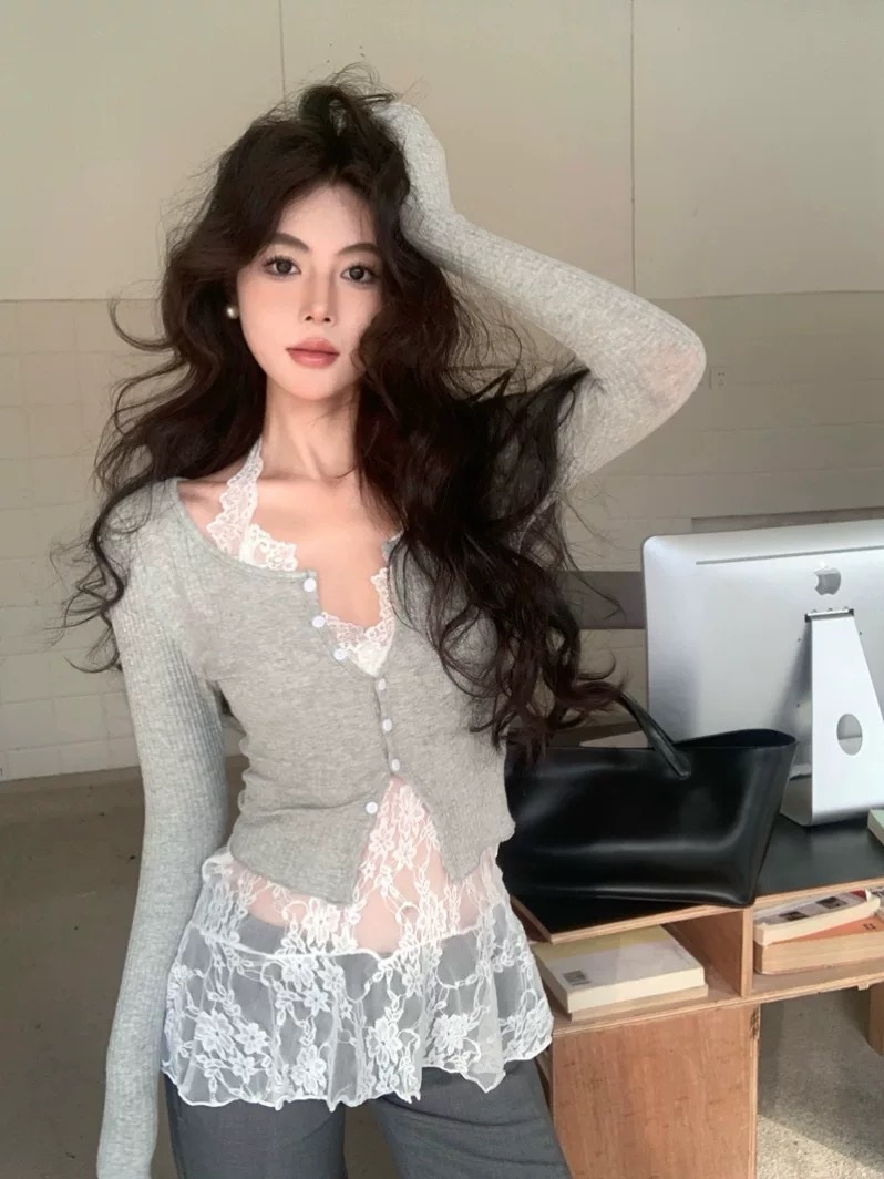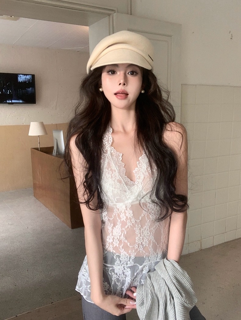 쌓인 아티팩트 봄과 가을 새로운 섹시한 뜨거운 소녀 스타일 레이스 홀터 스트랩 내베이스 셔츠 빈 탑