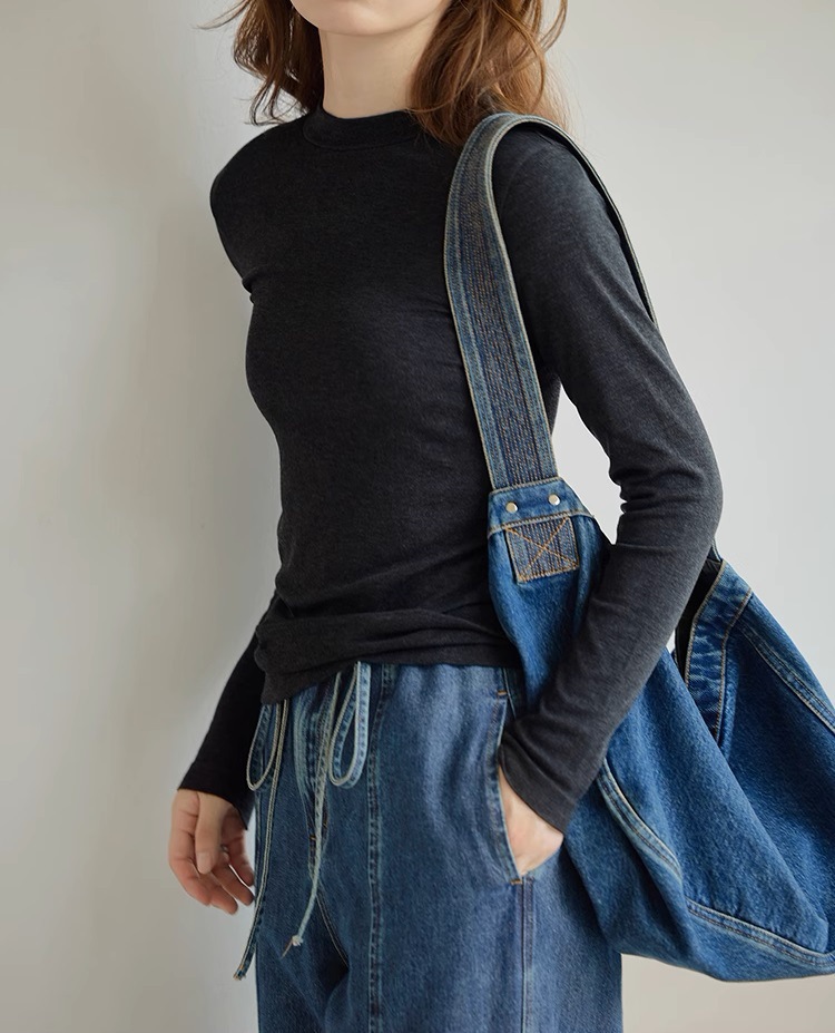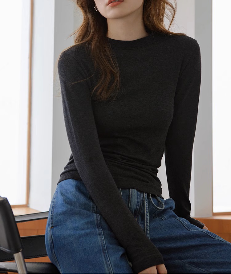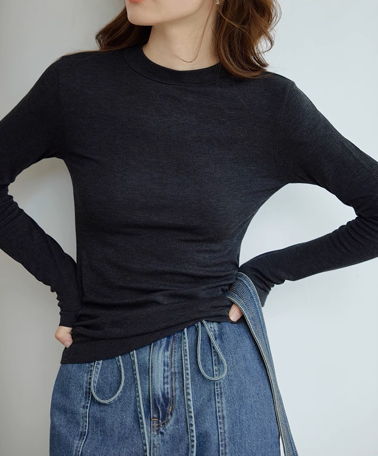 [재고] 1313 양모 블렌딩 다크 그레이 바닥 셔츠 가을 여성 세미 하이 크루 넥 풀오버 피부 친화적 인 슬림 티셔츠스토어 가기