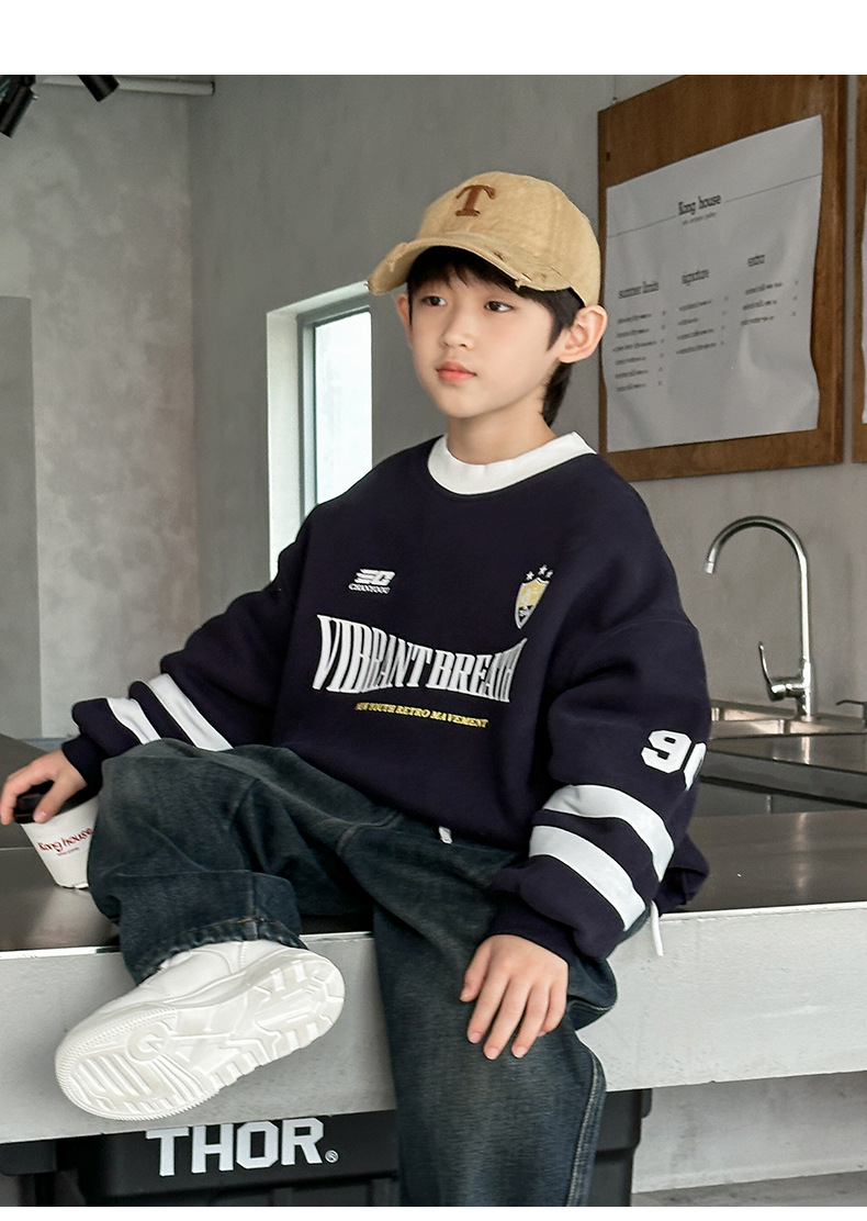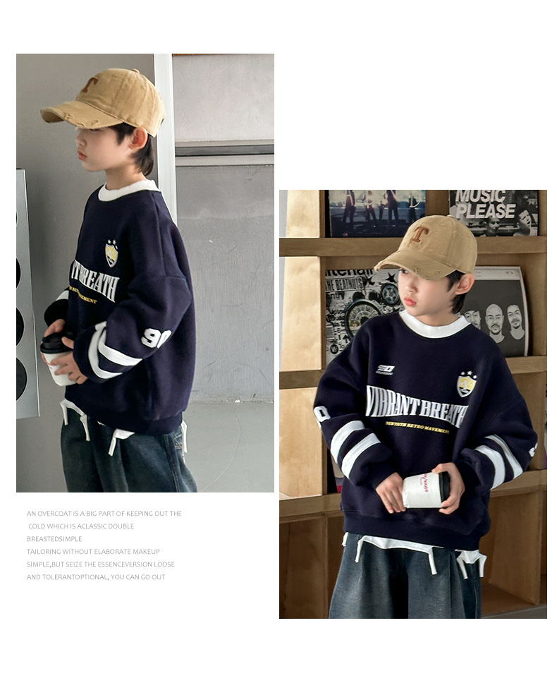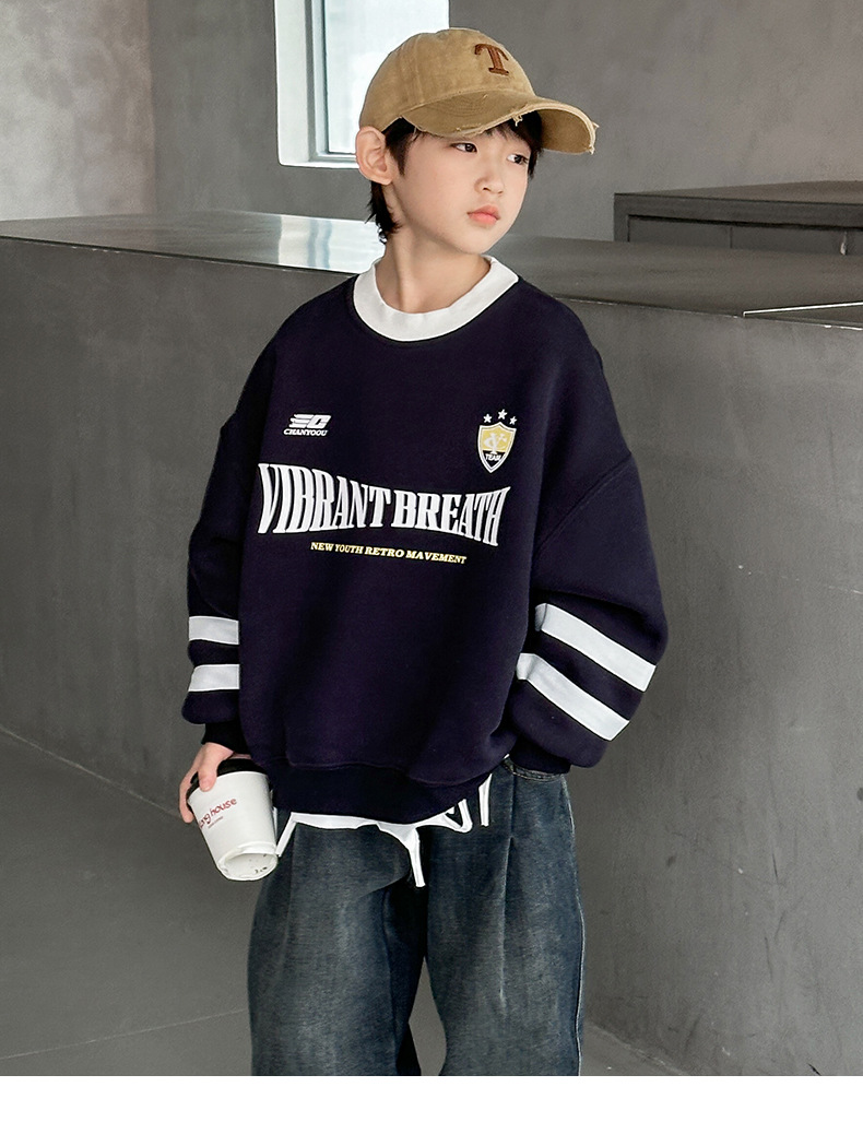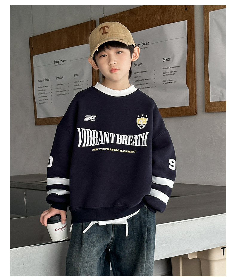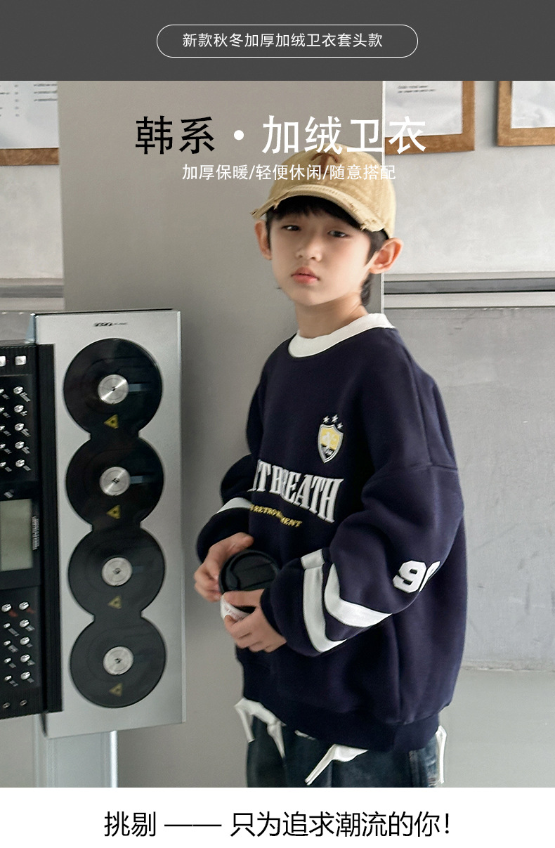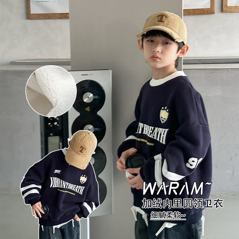 남아용 기모 스웨트셔츠 가을 겨울 2025 신상 중대형 아동 겨울옷 일체형 기모 두꺼운 겨울 라운드넥 상의스토어 가기