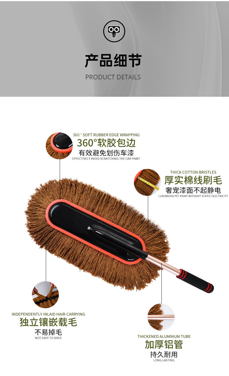 면사 자동차 닦이, 신축성 있는 고무 손잡이, 자동차 먼지 제거기, 세차용품, 눈 청소용품, 원목, 길이 조절 가능