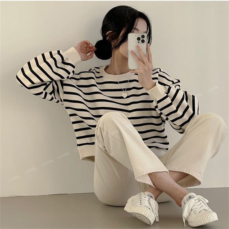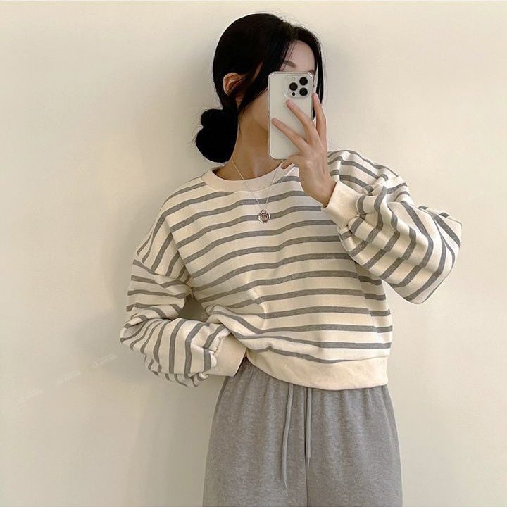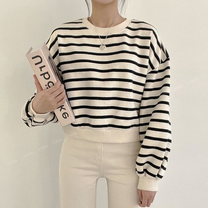 스트라이프 스웨트 셔츠 여성용 짧은 2025 새로운 얇은 한국 스타일 틈새 여성 루즈 봄 가을 겨울 벨벳 탑스토어 가기