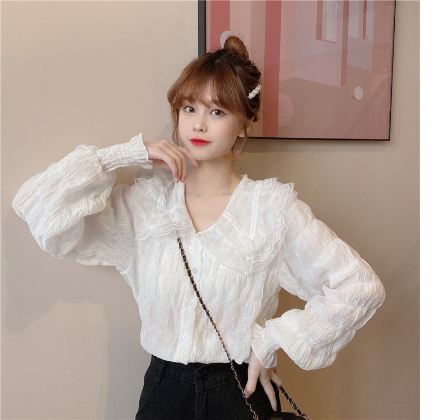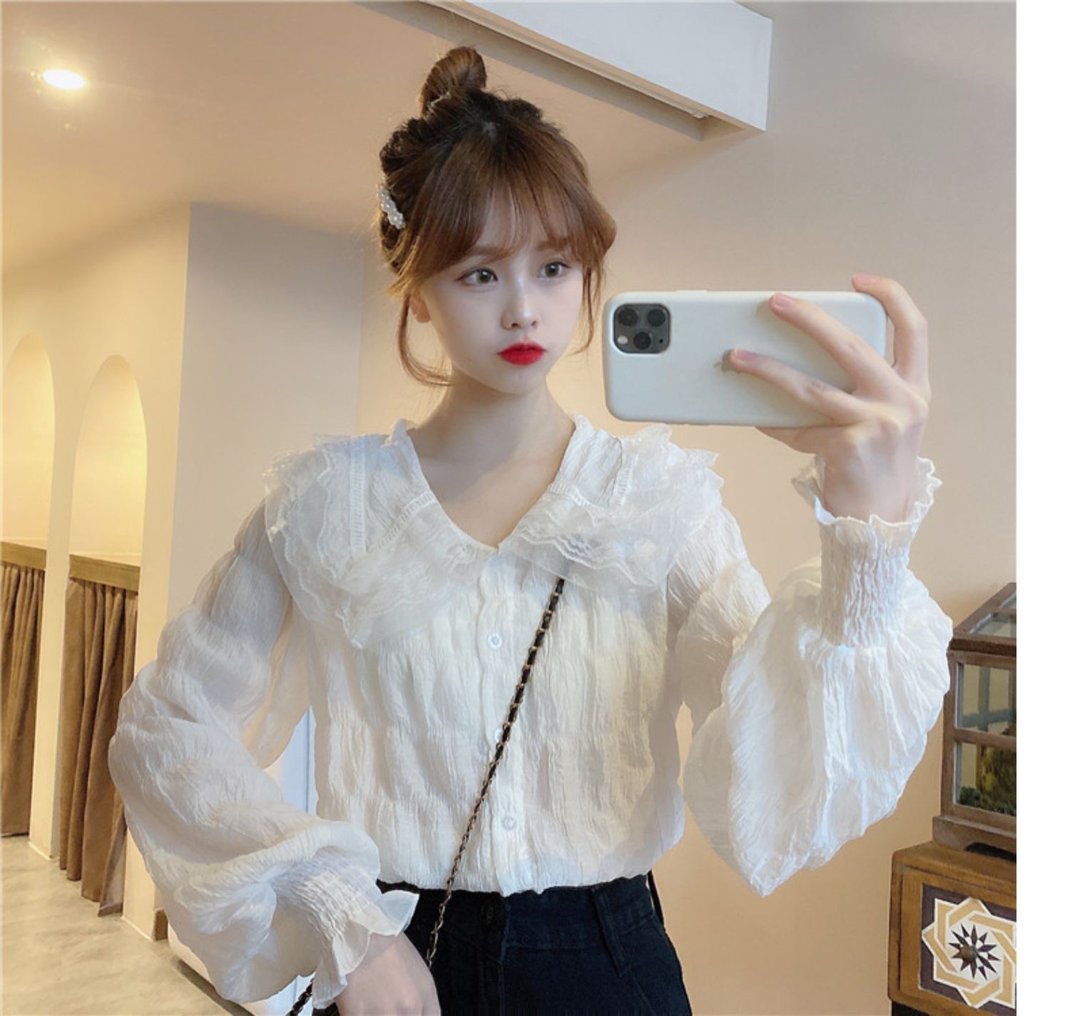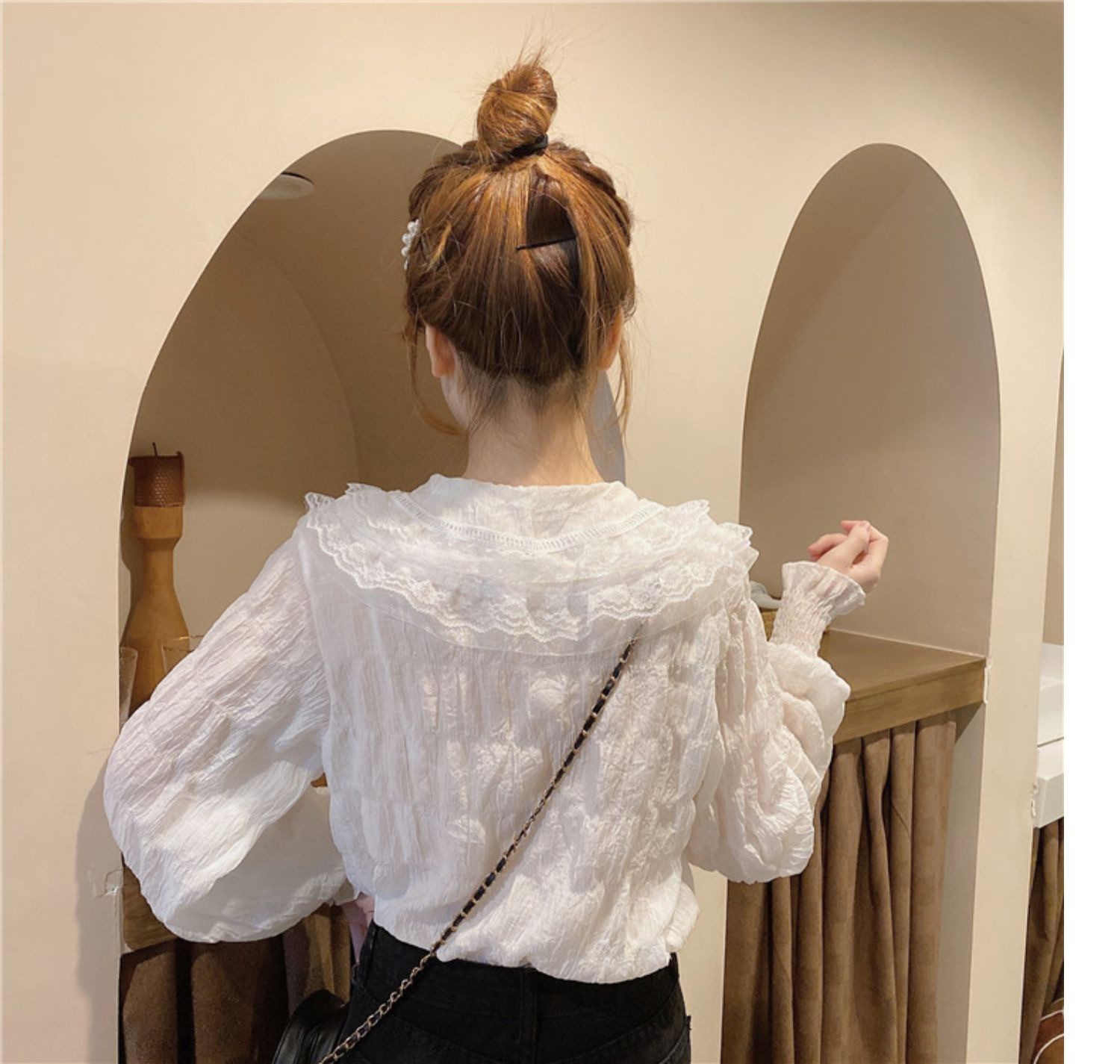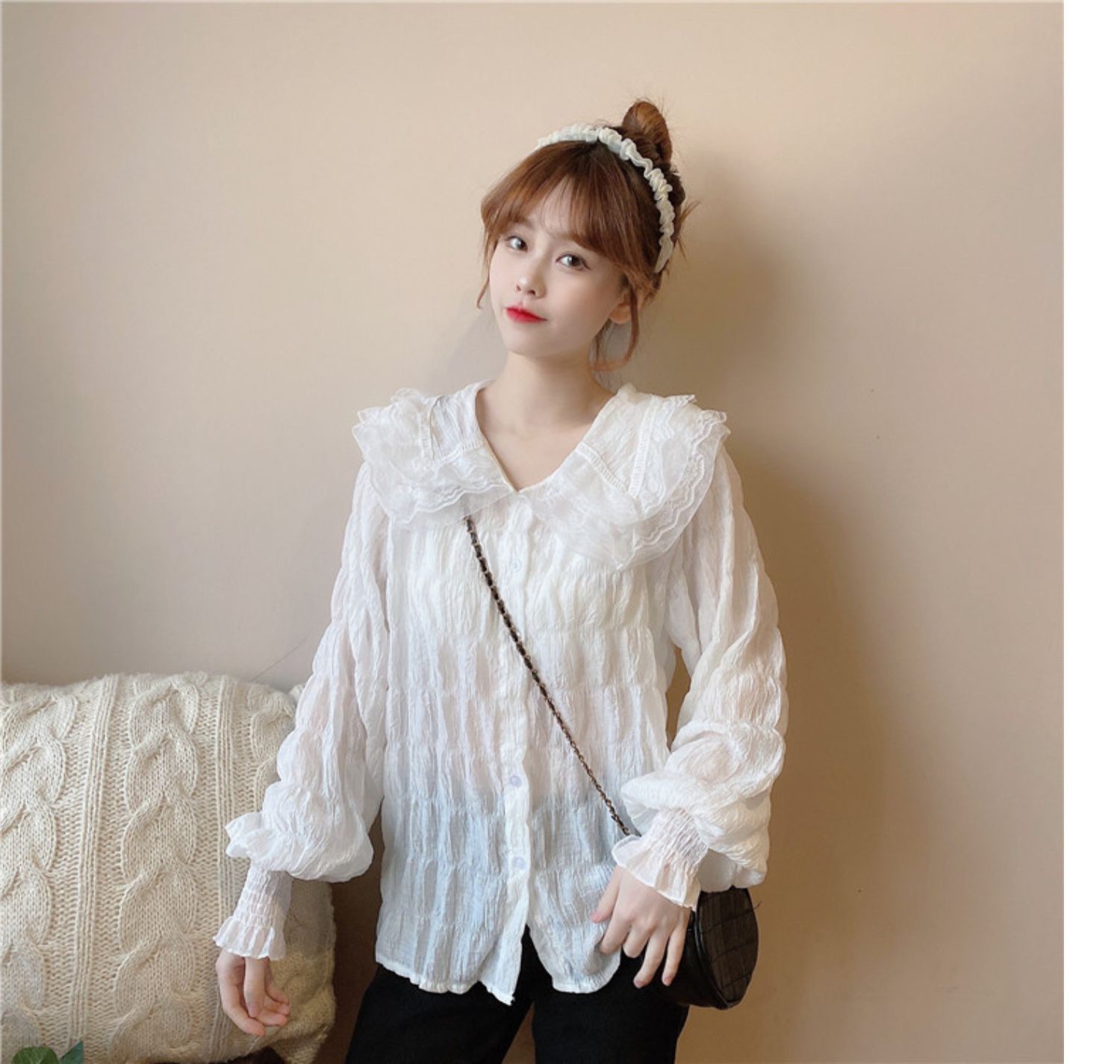인형 칼라 퍼프 소매 셔츠 여성 최고 여성베이스 셔츠 얇은 레이스 쉬폰 셔츠 긴 소매 봄과 가을 작은