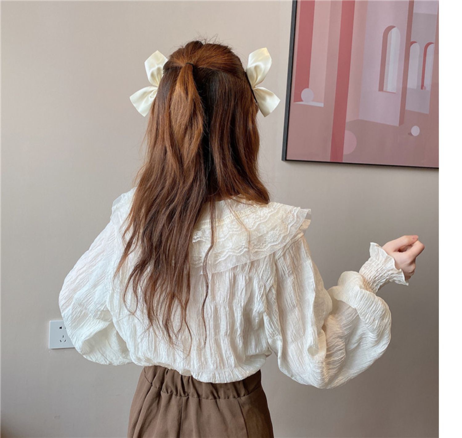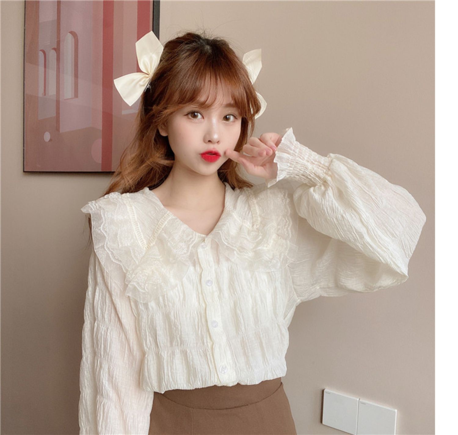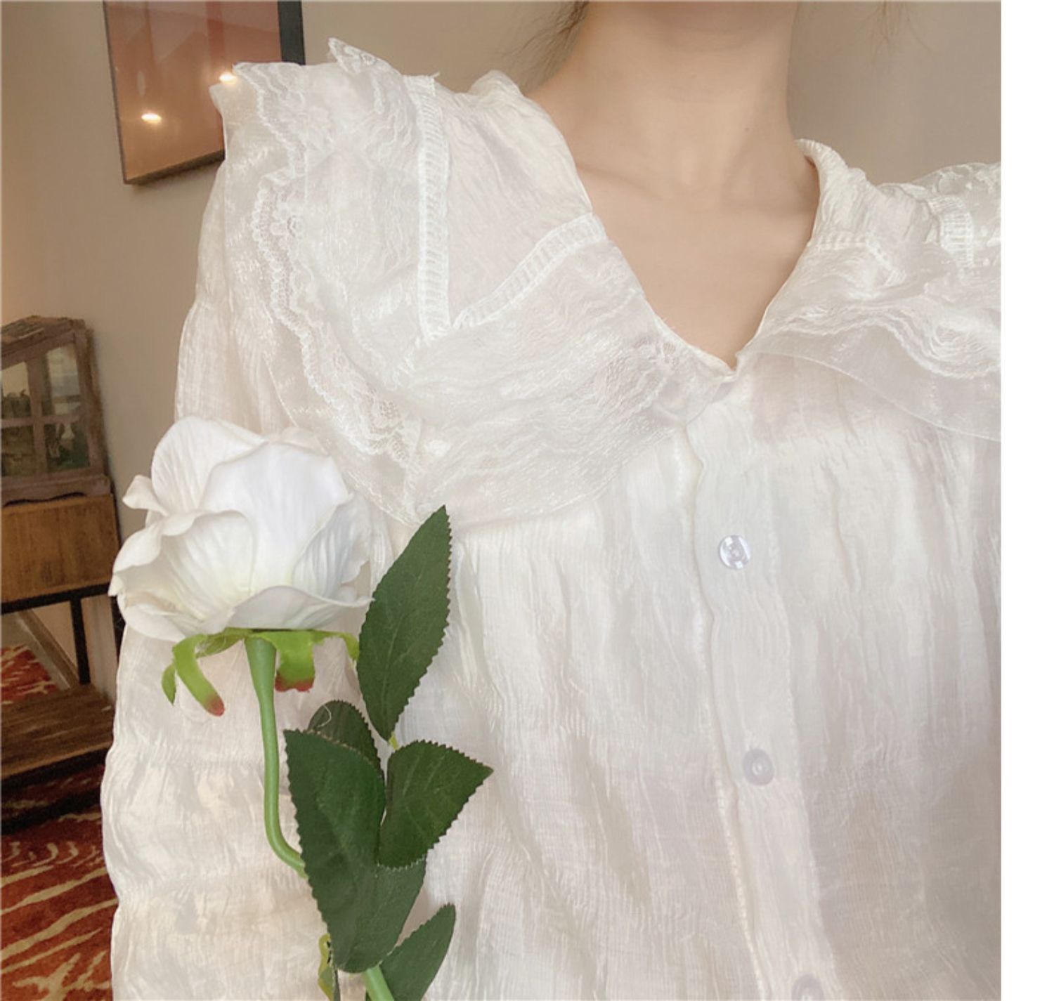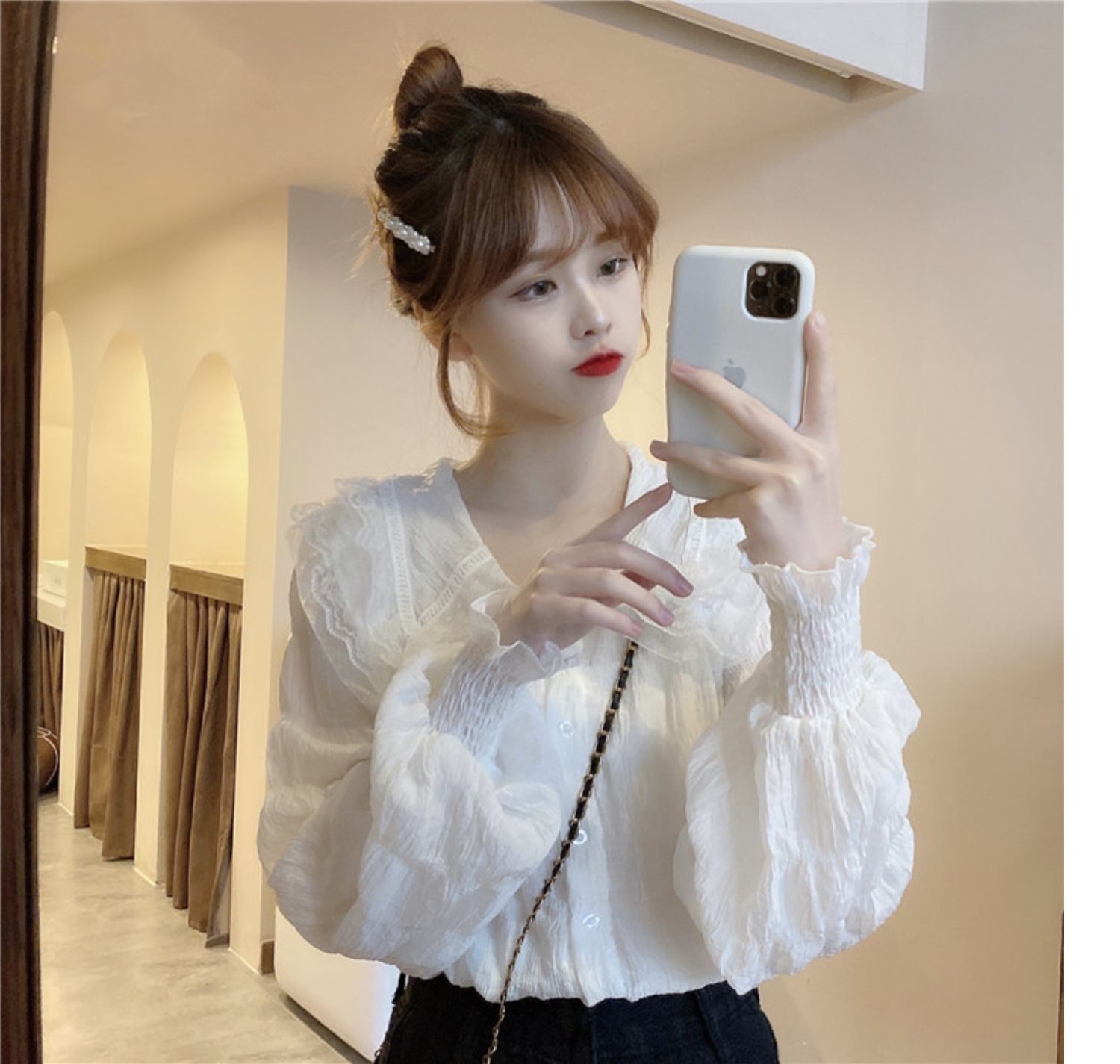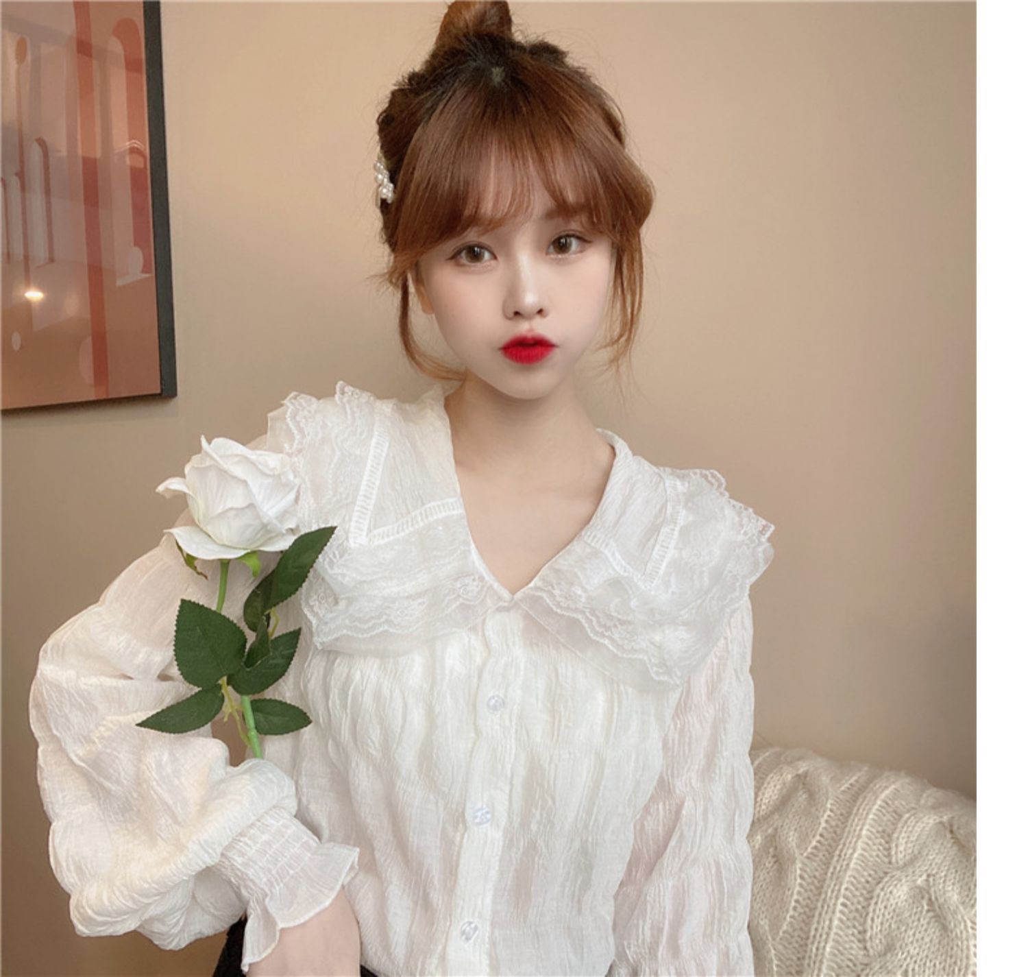 인형 칼라 퍼프 소매 셔츠 여성 최고 여성베이스 셔츠 얇은 레이스 쉬폰 셔츠 긴 소매 봄과 가을 작은