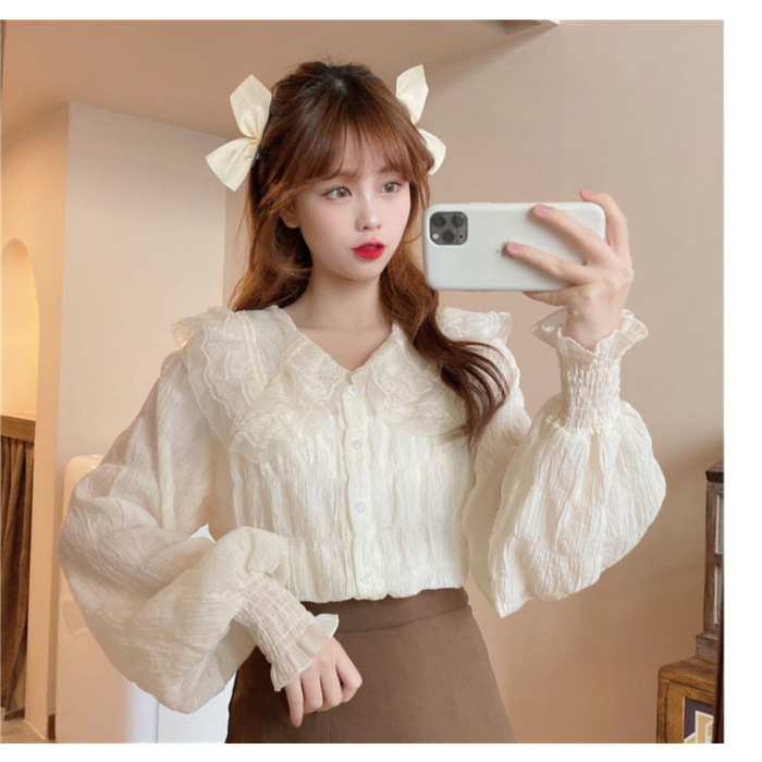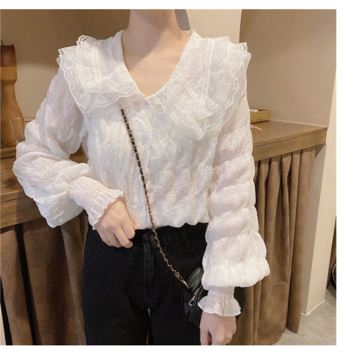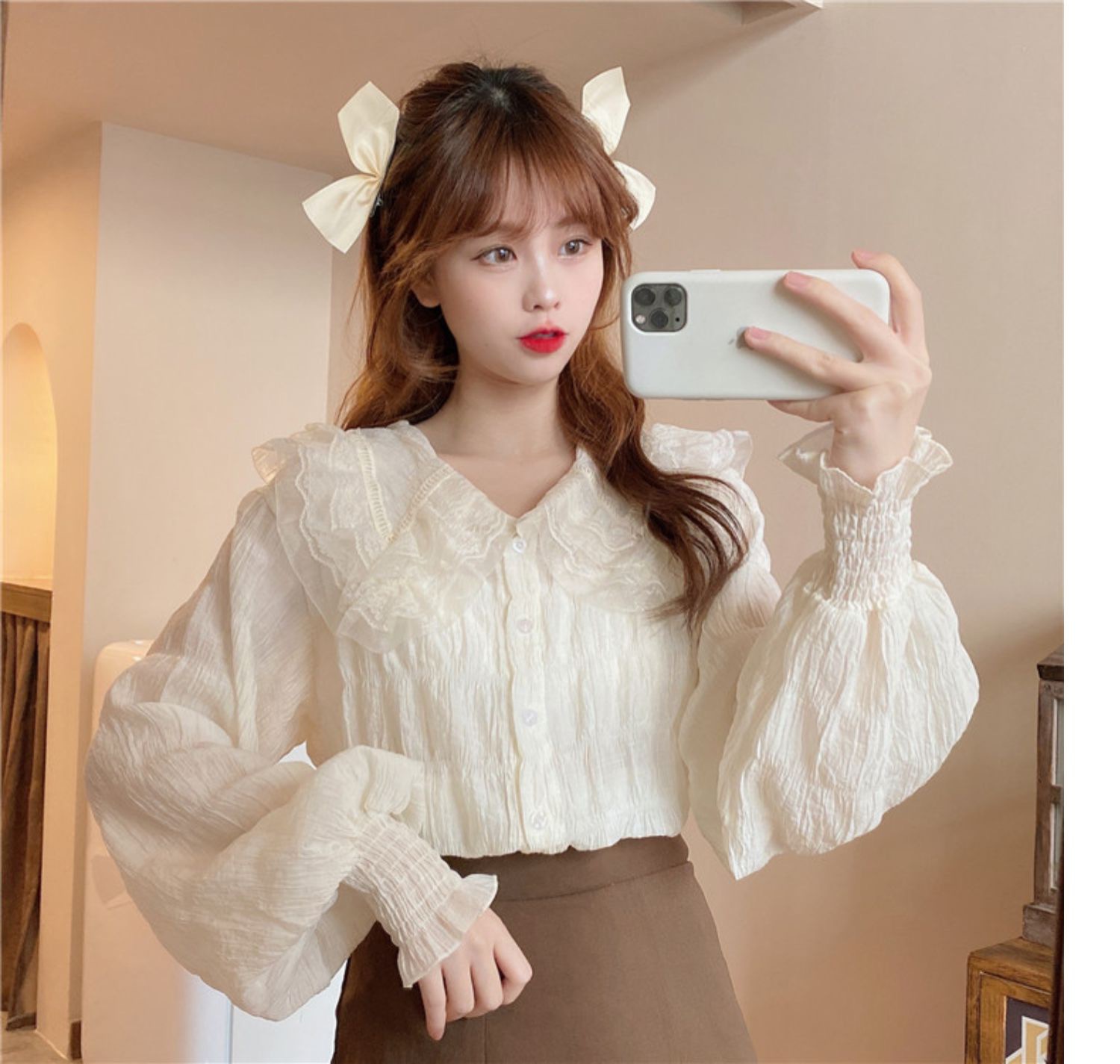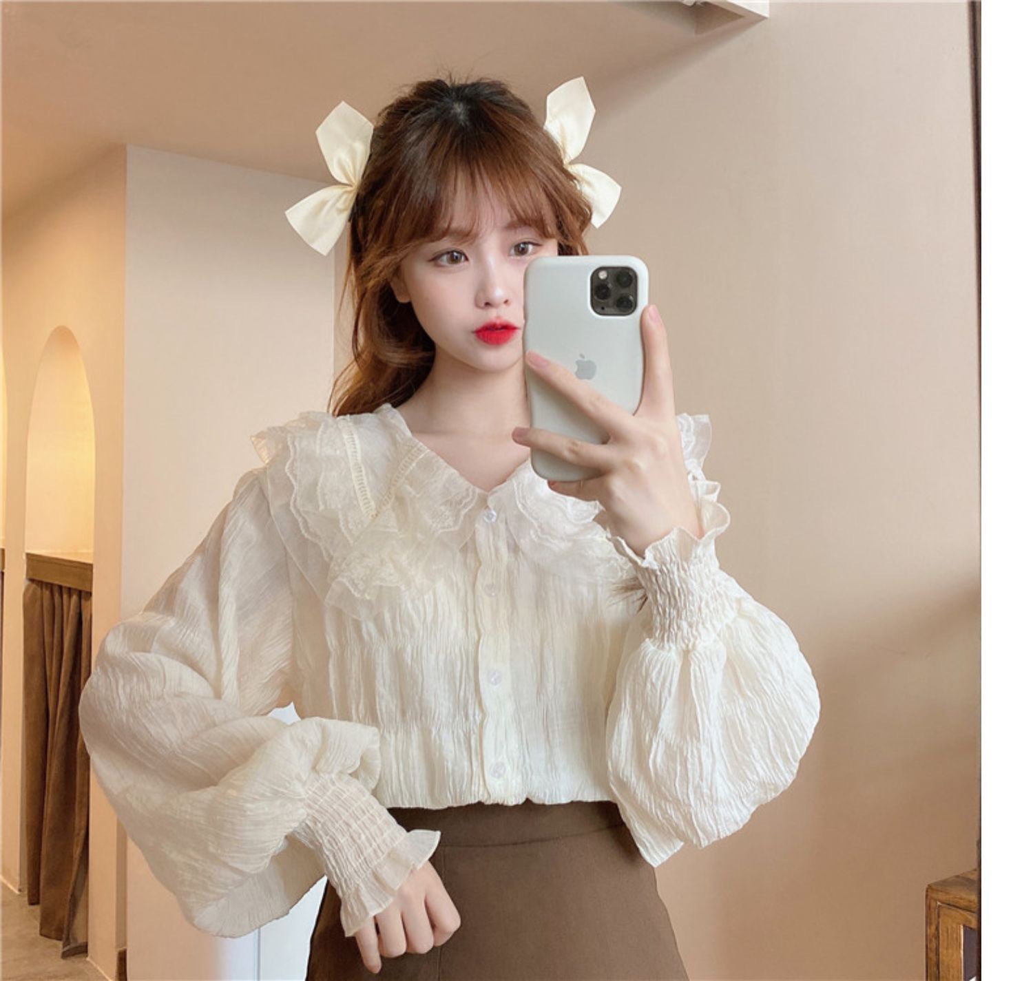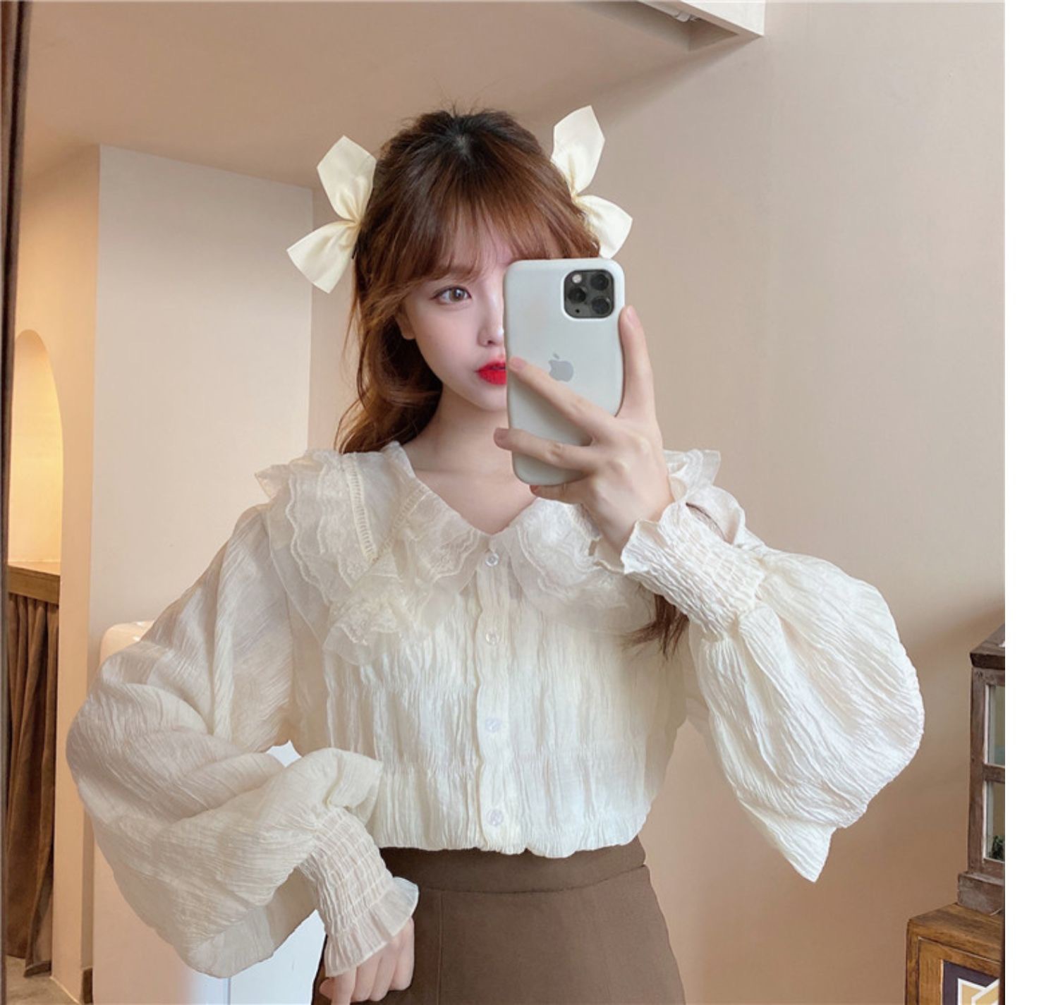 인형 칼라 퍼프 소매 셔츠 여성 최고 여성베이스 셔츠 얇은 레이스 쉬폰 셔츠 긴 소매 봄과 가을 작은