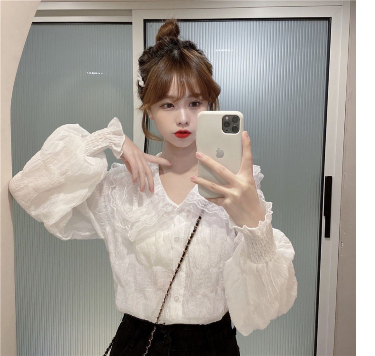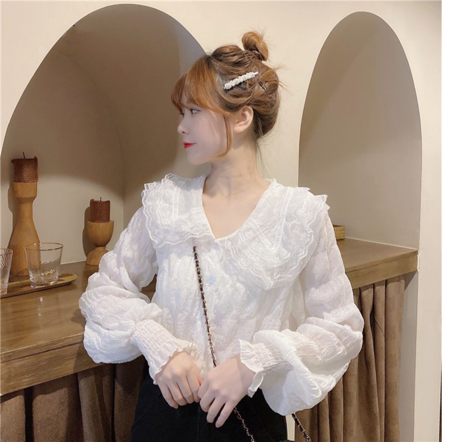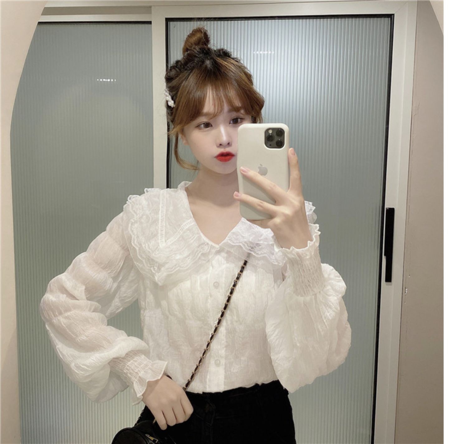 인형 칼라 퍼프 소매 셔츠 여성 최고 여성베이스 셔츠 얇은 레이스 쉬폰 셔츠 긴 소매 봄과 가을 작은스토어 가기
