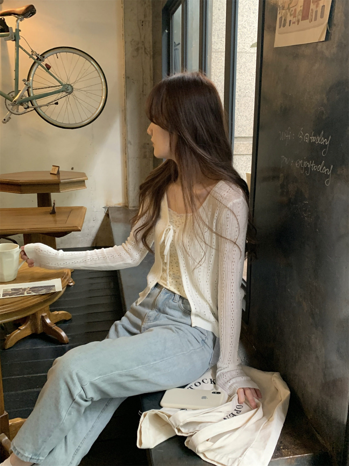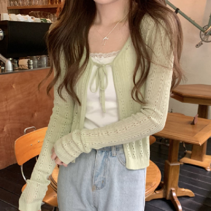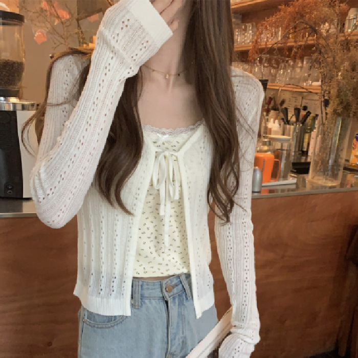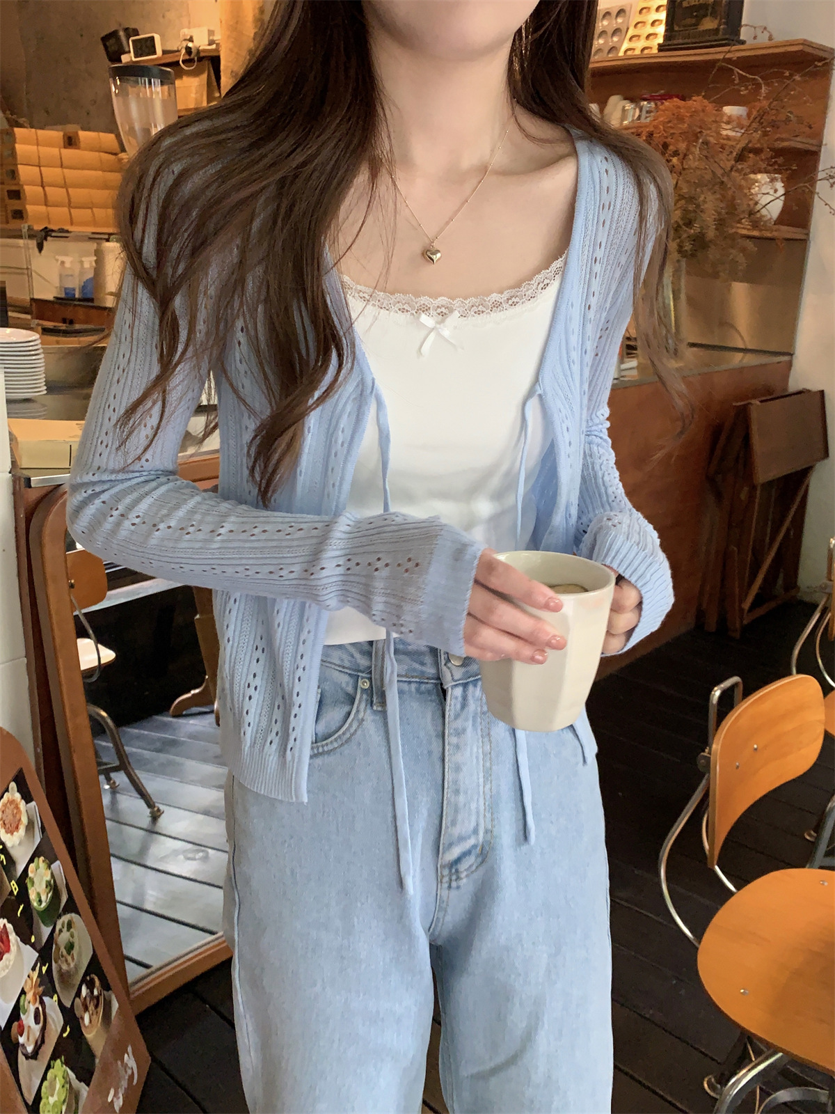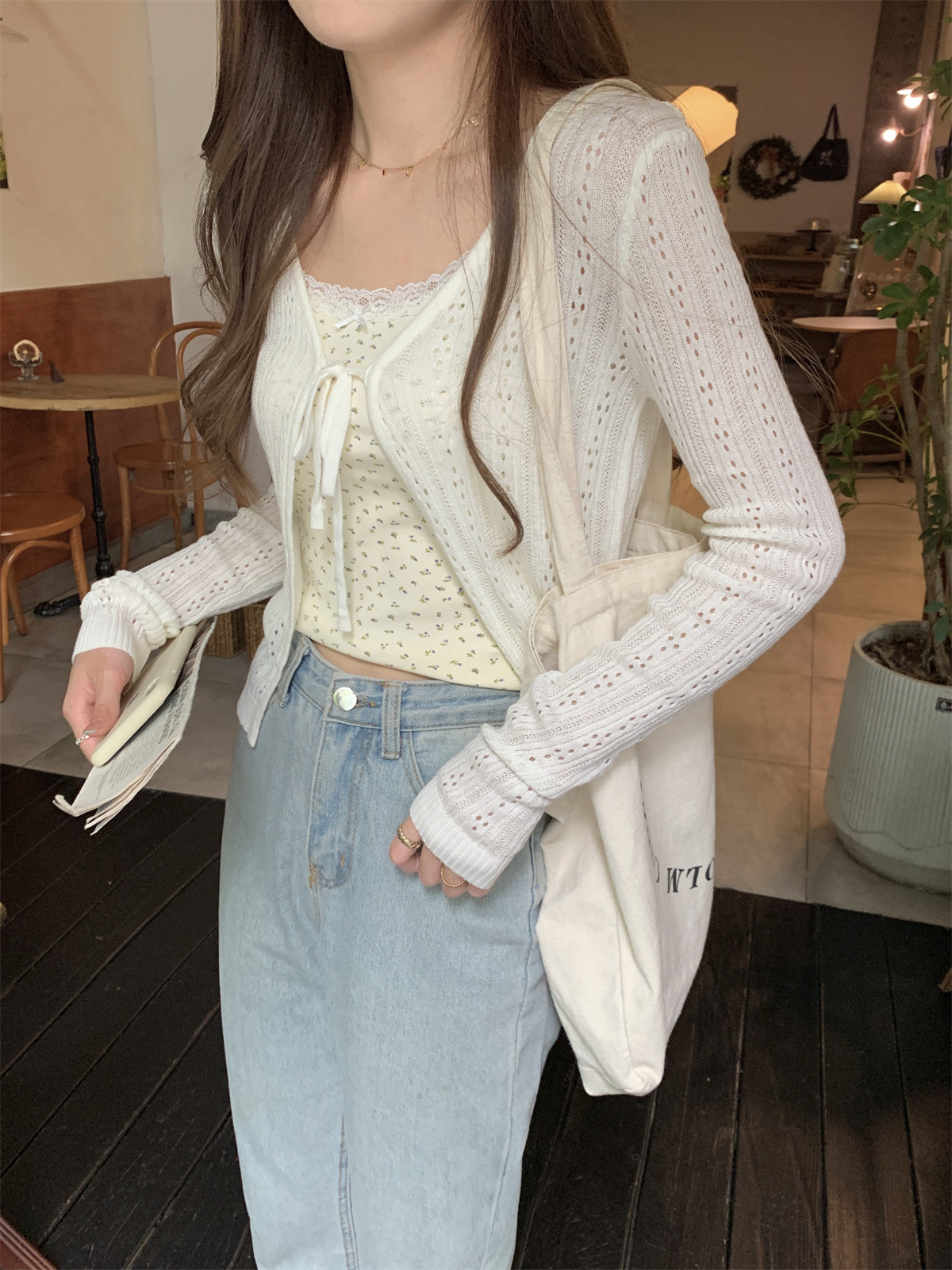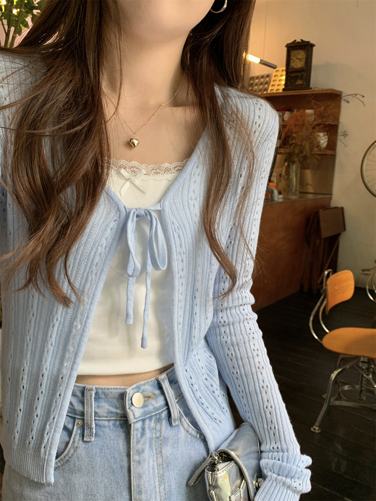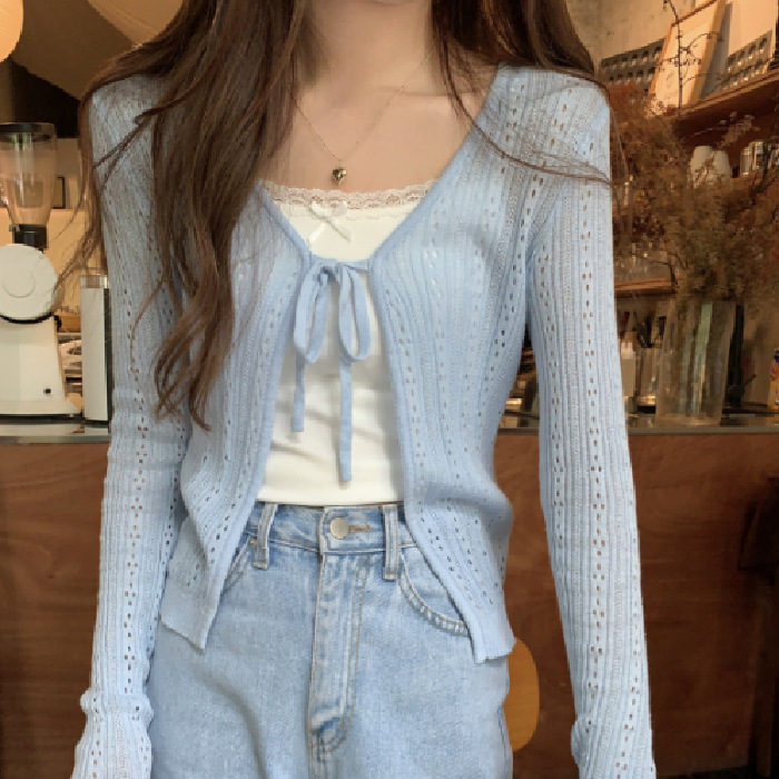 여성용 얇은 중공 레이스 업 자외선 차단 셔츠, 여름 브이넥 짧은 니트 가디건, 화이트 탑 트렌디스토어 가기