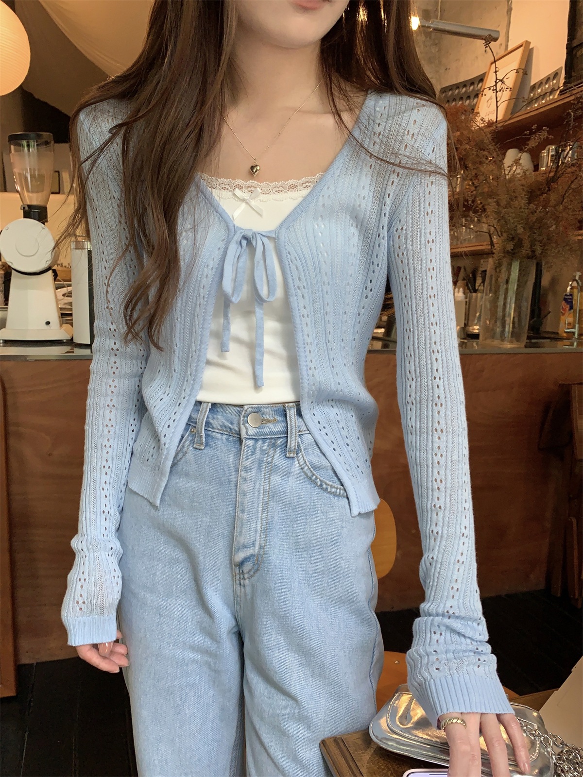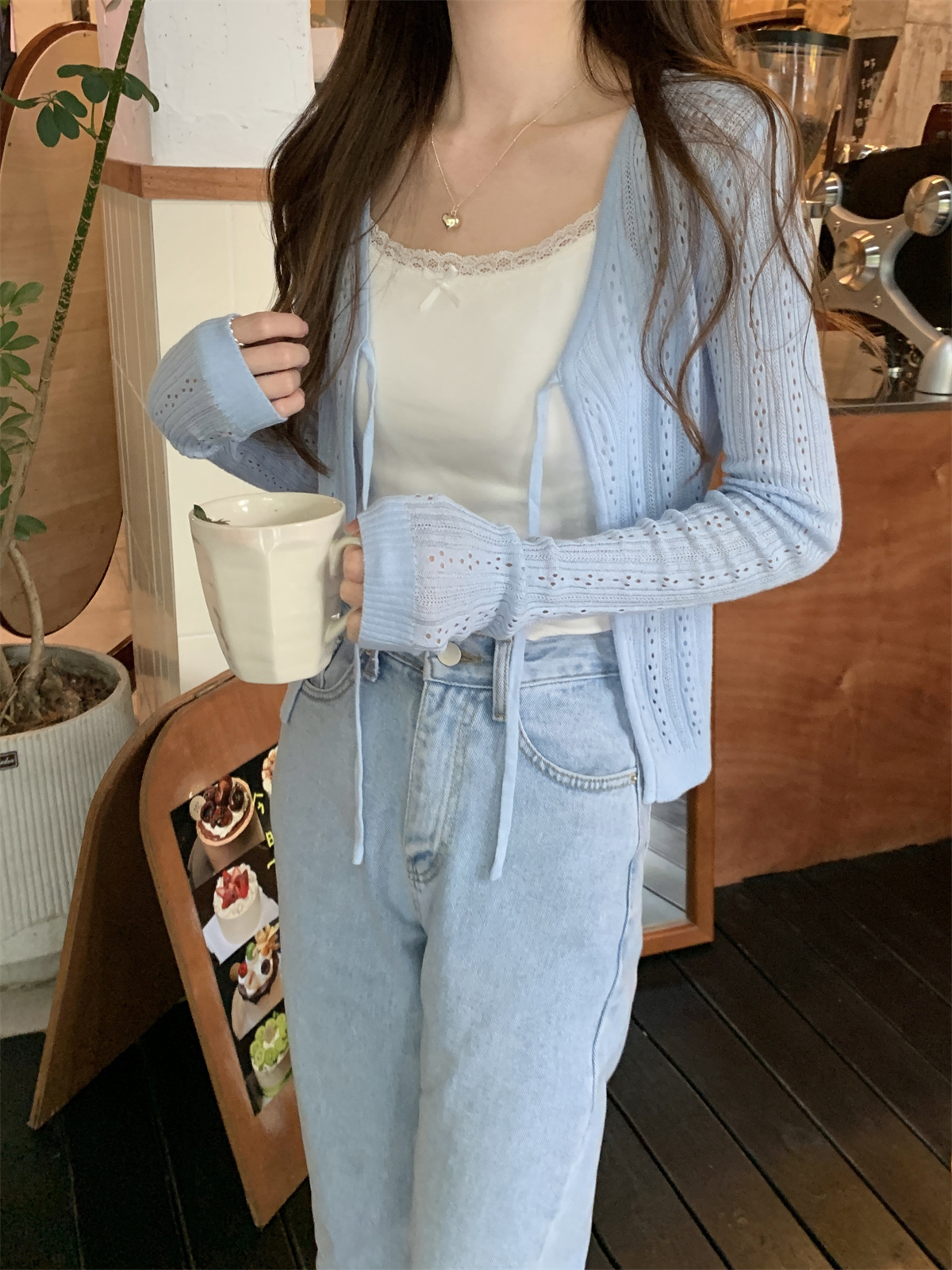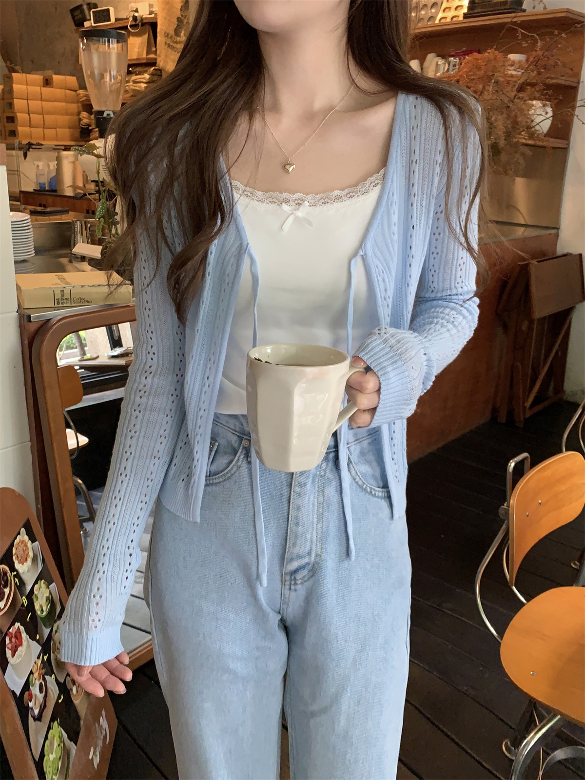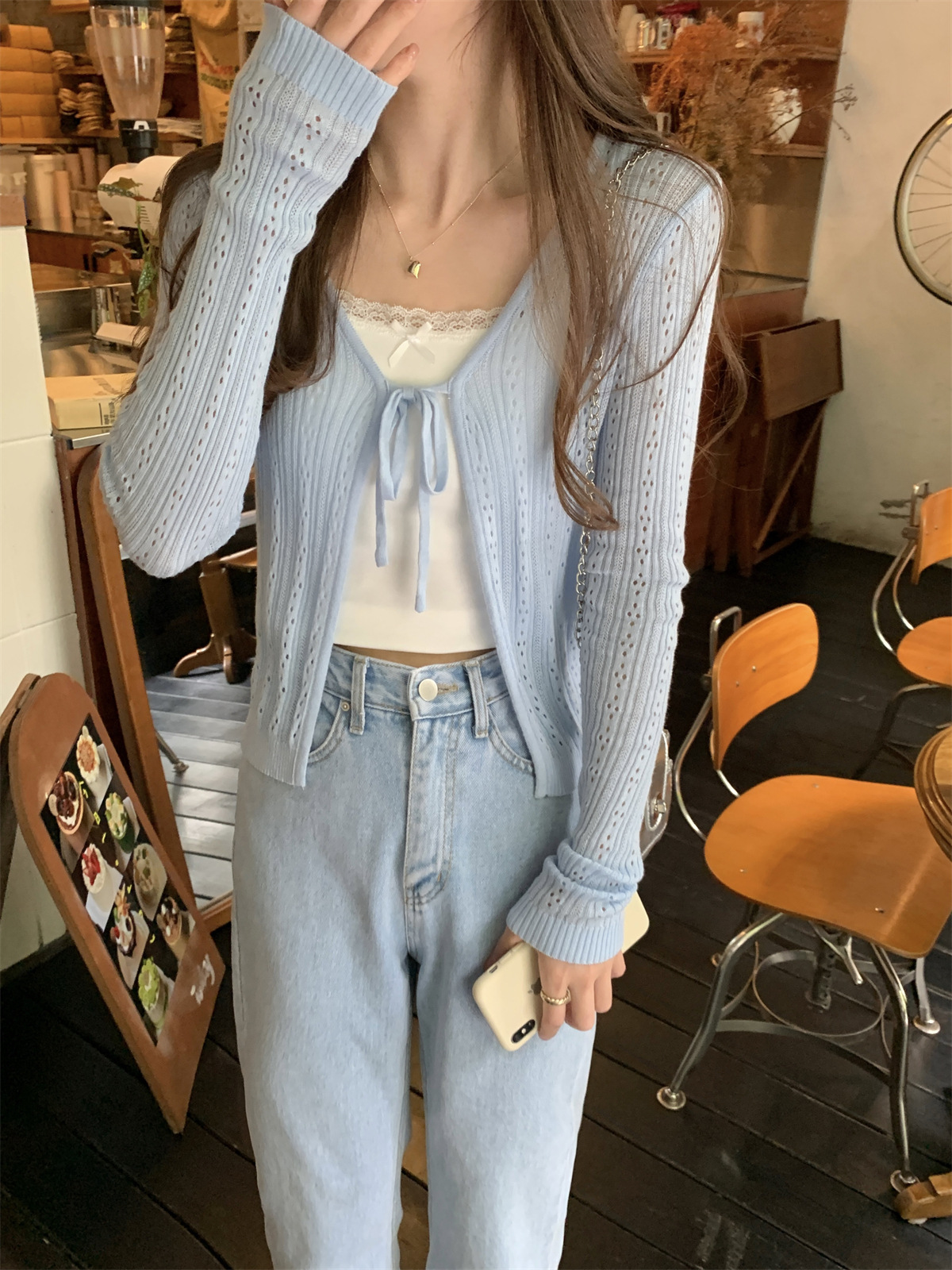 여성용 얇은 중공 레이스 업 자외선 차단 셔츠, 여름 브이넥 짧은 니트 가디건, 화이트 탑 트렌디스토어 가기