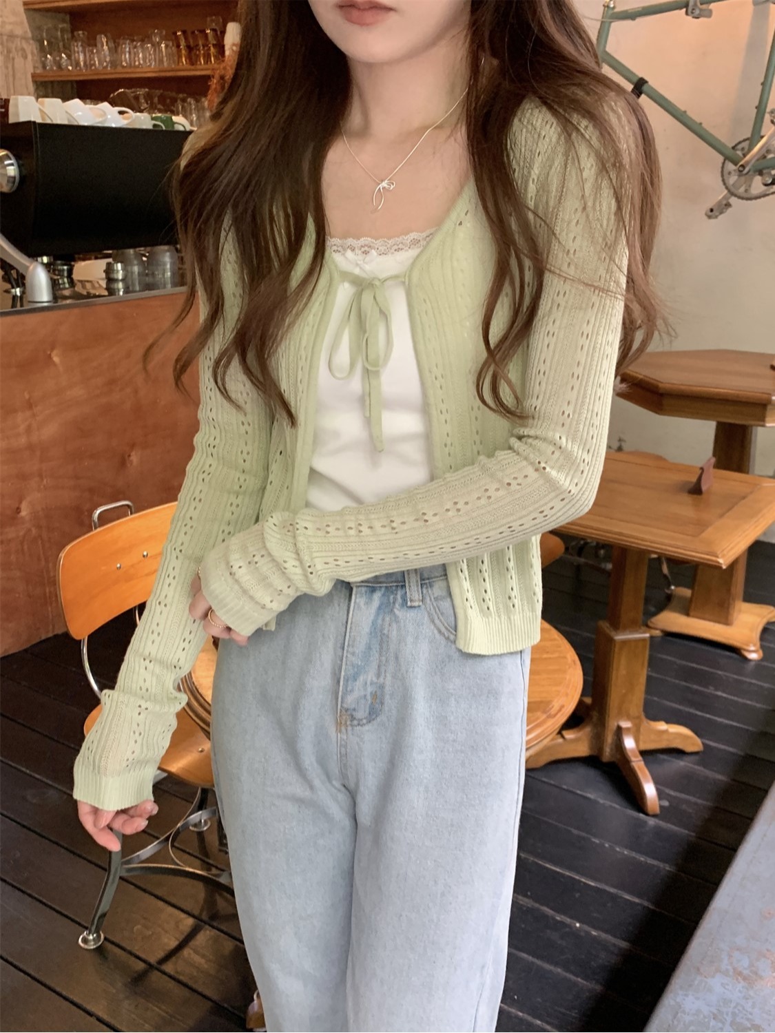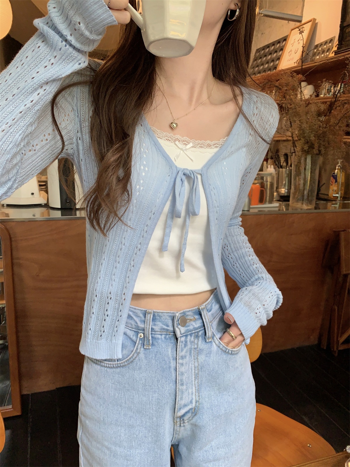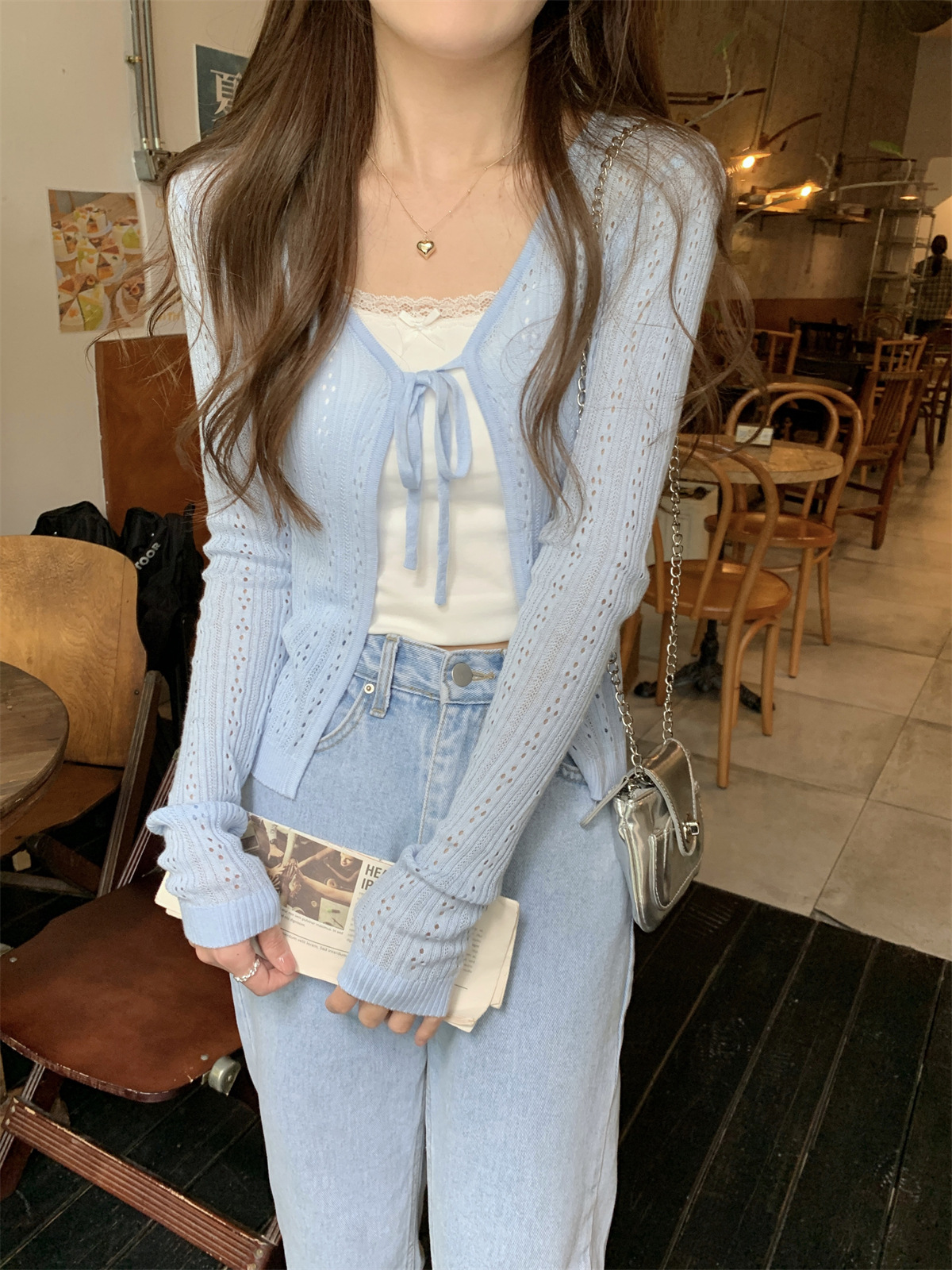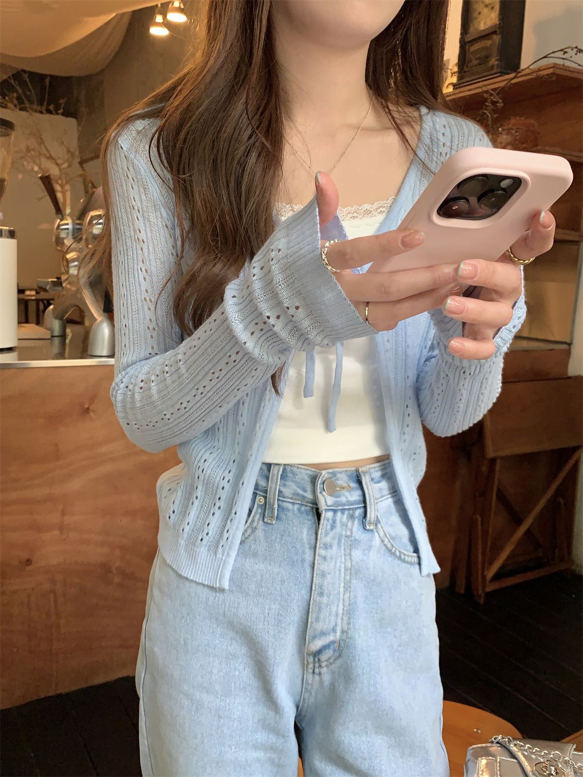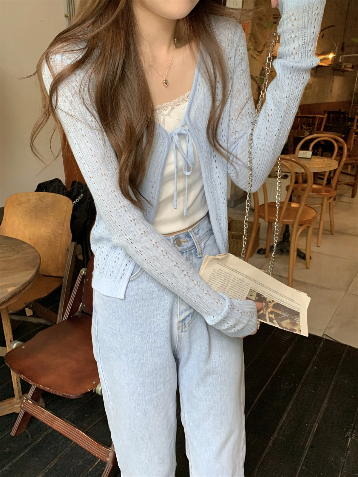 여성용 얇은 중공 레이스 업 자외선 차단 셔츠, 여름 브이넥 짧은 니트 가디건, 화이트 탑 트렌디스토어 가기