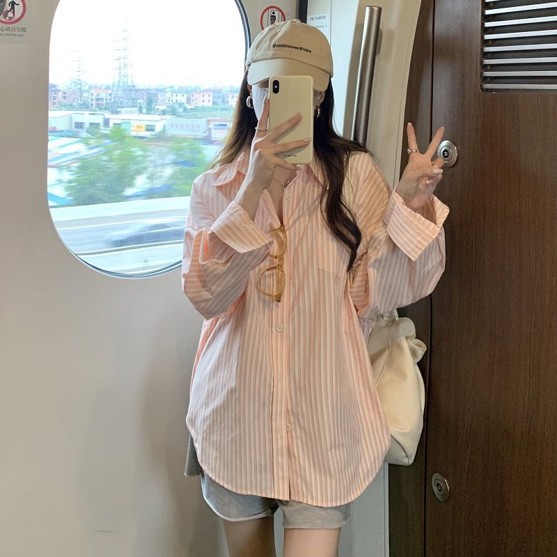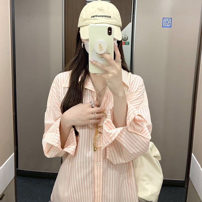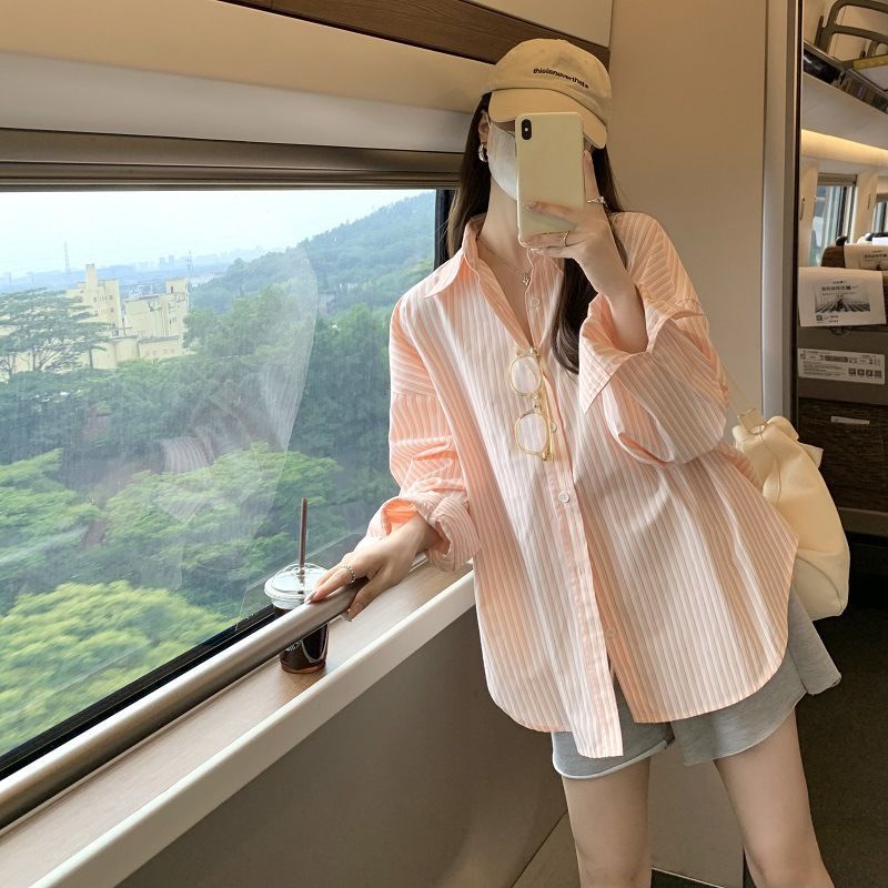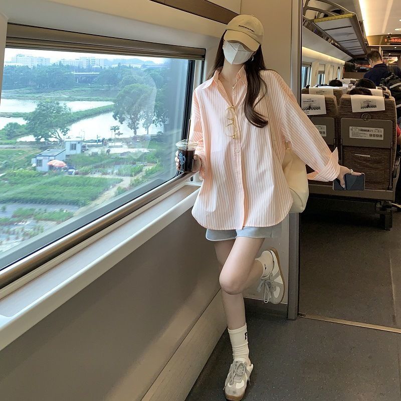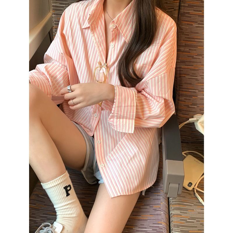 핑크 프랑스 틈새 디자인 센스 스트라이프 셔츠 여성용 긴팔 얇은 봄과 가을 패션 브랜드 셔츠 카디건 재킷스토어 가기