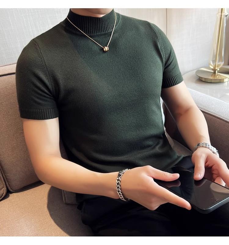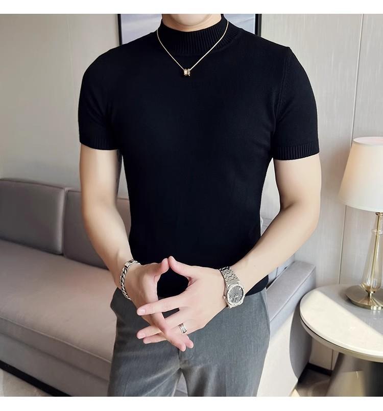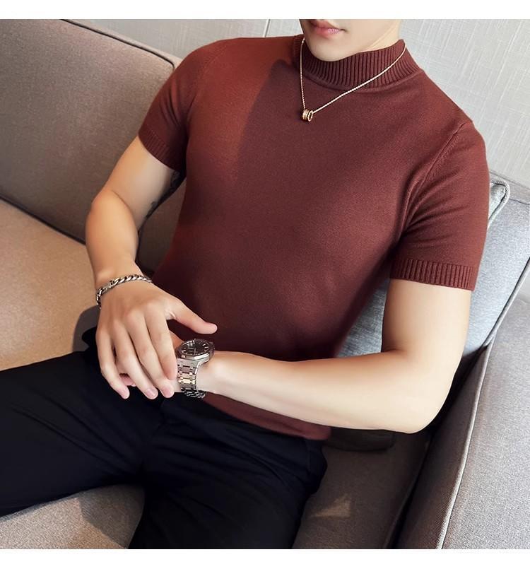 가을과 겨울 반소매 스웨터 남성용 단색 스웨터 트렌디 라운드 넥베이스 셔츠 슬림핏 반소매 탑 하프 하이 칼라 티셔츠