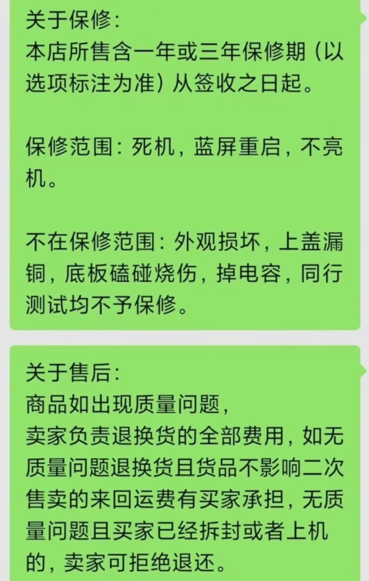 三年有限保修(需保留购买凭证),支持个人送保,超频(如 Intel 200S Boost)不影响保修。