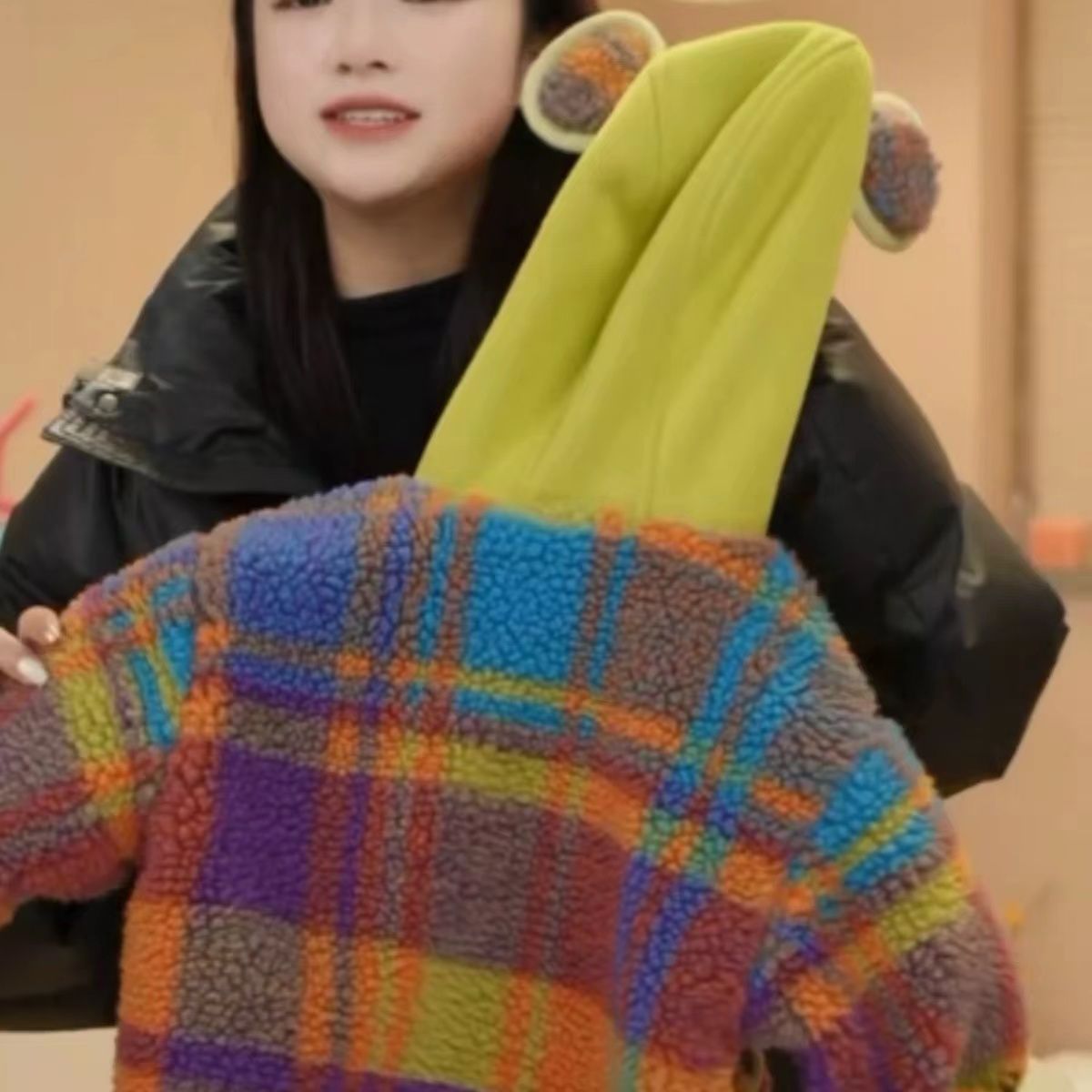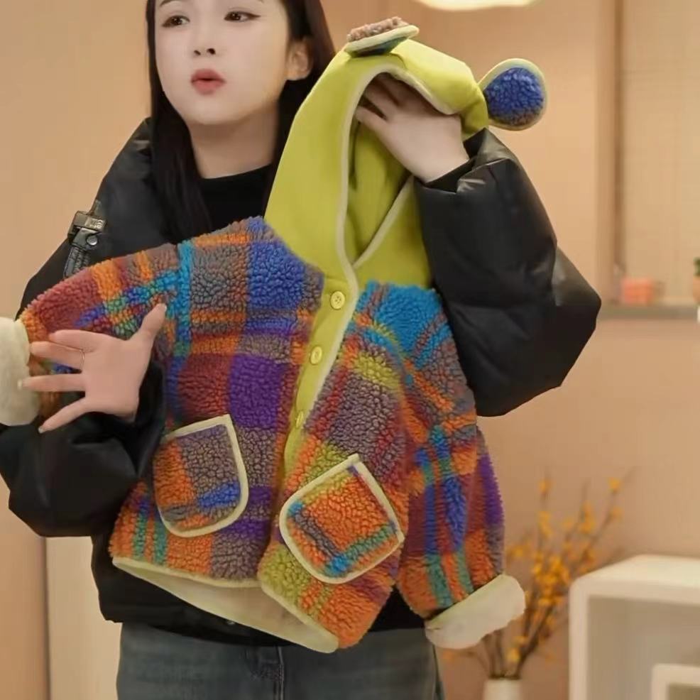 소년과 소녀 후드 레인보우 양가죽 코트와 푹신한 스웨터 겨울 새로운 스타일 아기 따뜻한 외국 스타일