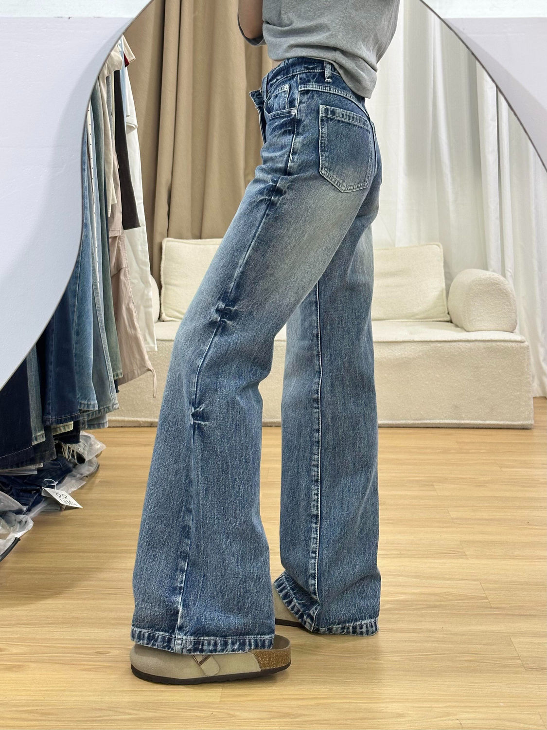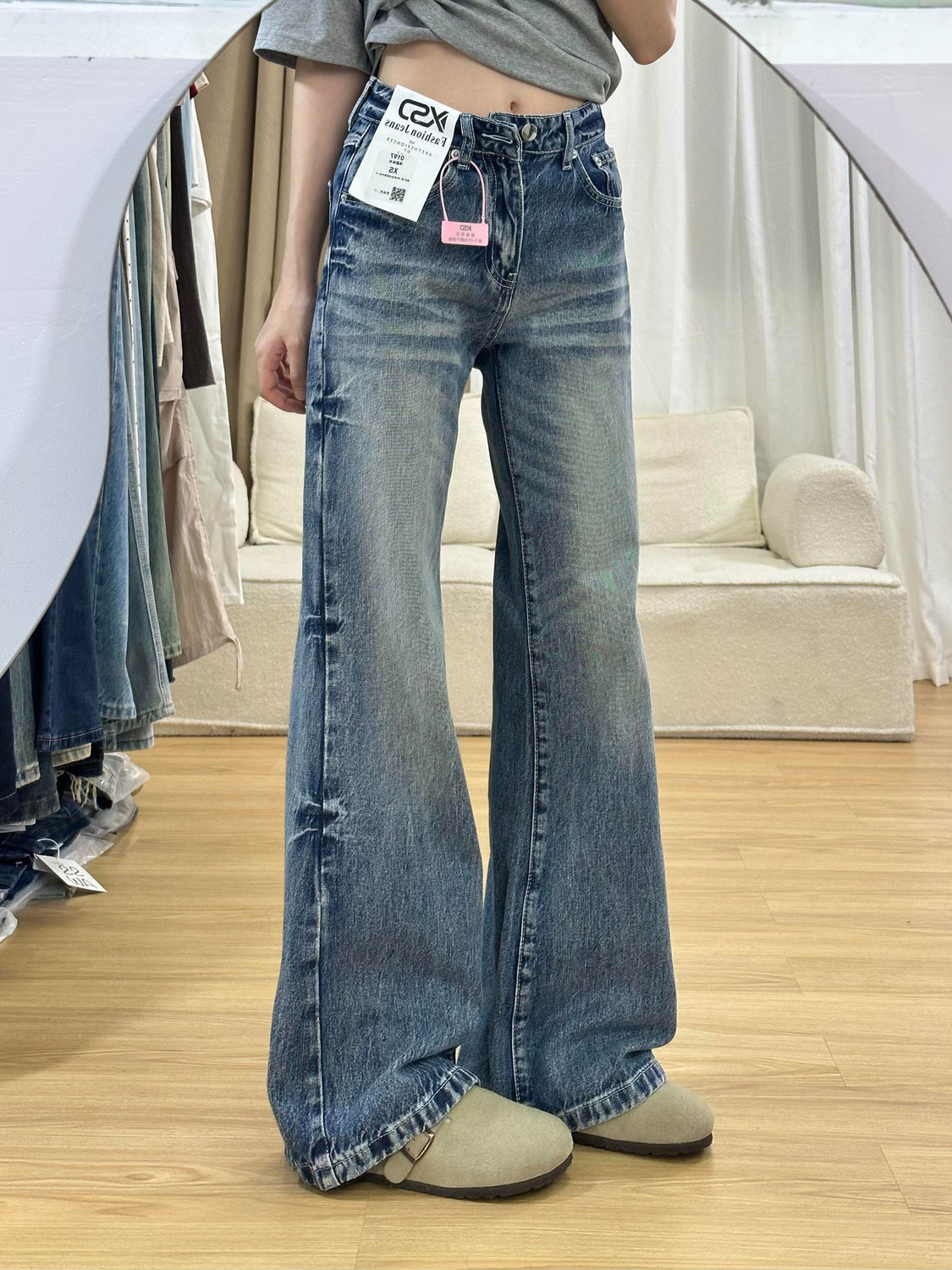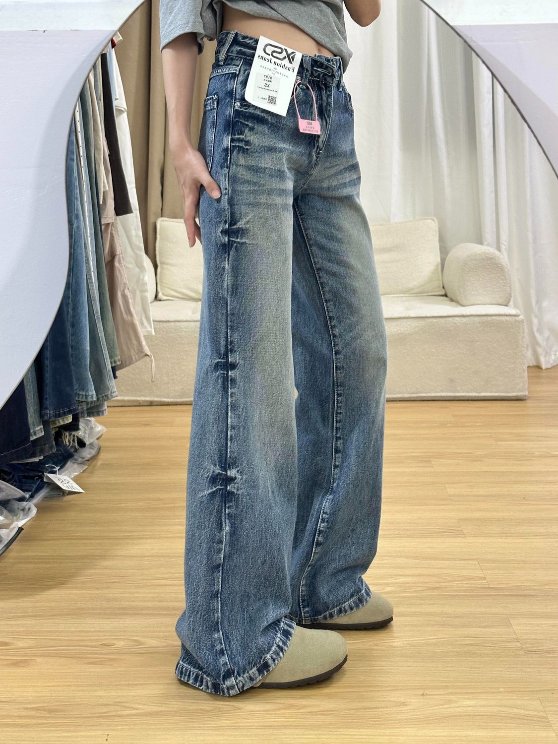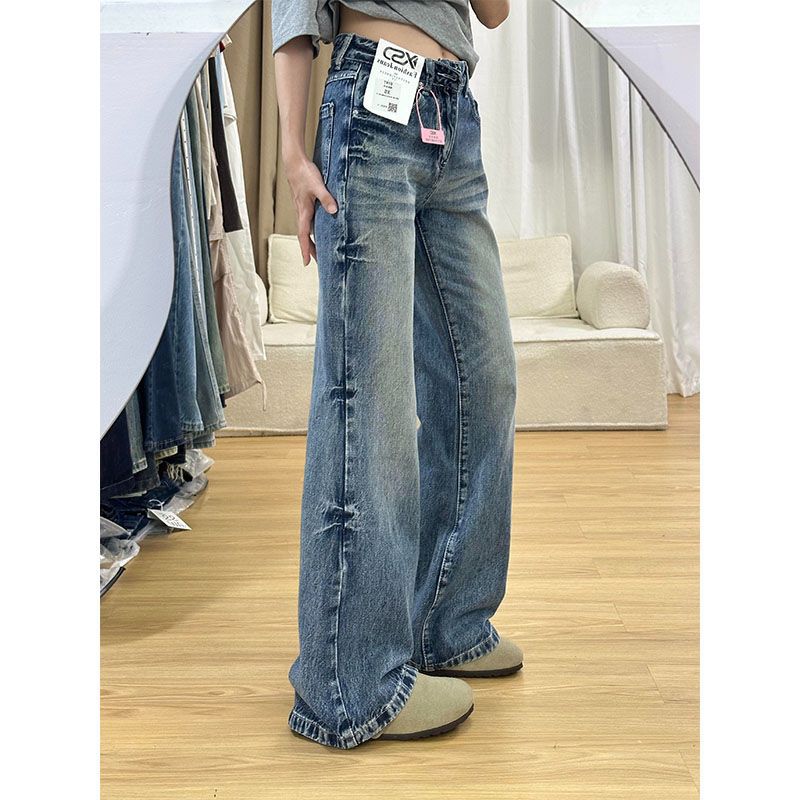 아메리칸 스타일 느슨한 청바지 여성의 겨울 새로운 빈티지 높은 허리 세척 슬리밍 스트레이트 튜브 혼 와이드 다리 바지스토어 가기