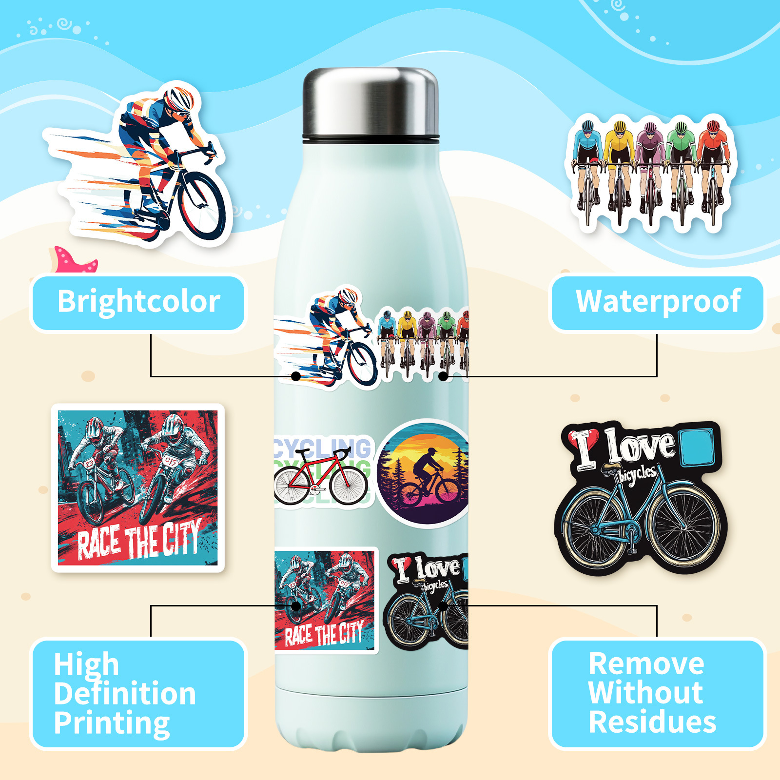 50 창조적 인 경쟁 산악 자전거 스티커 아마존 국경 베스트셀러 낙서 스티커 Diy 스케이트 보드 워터 컵