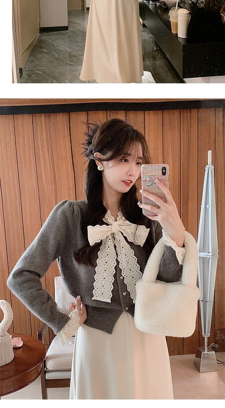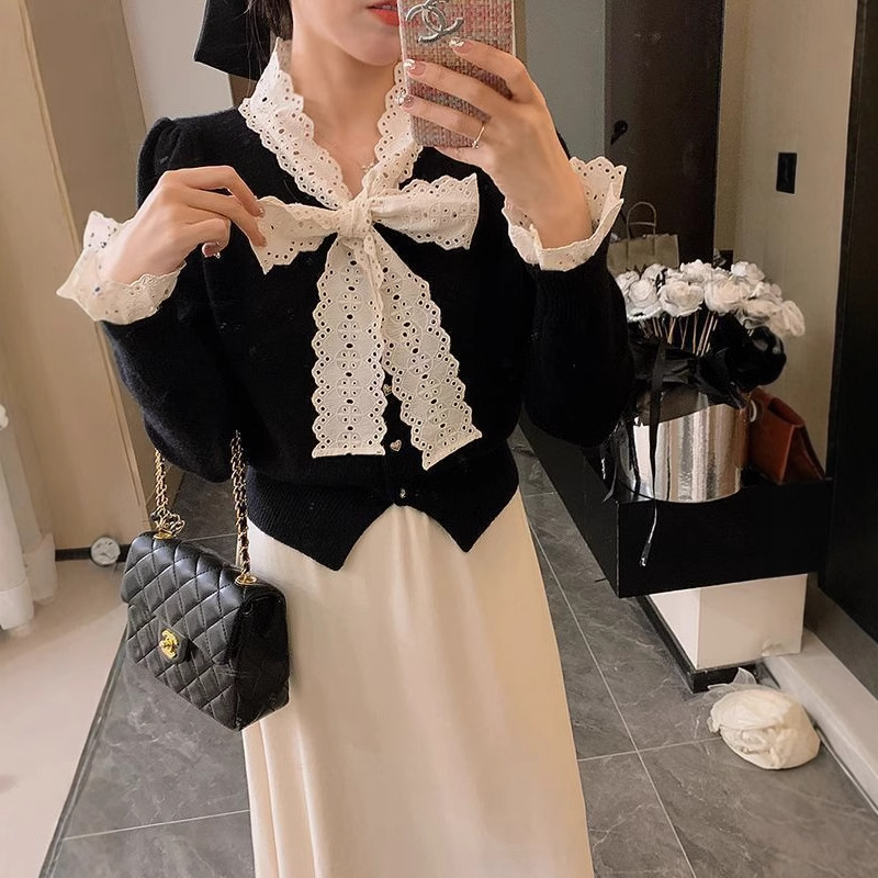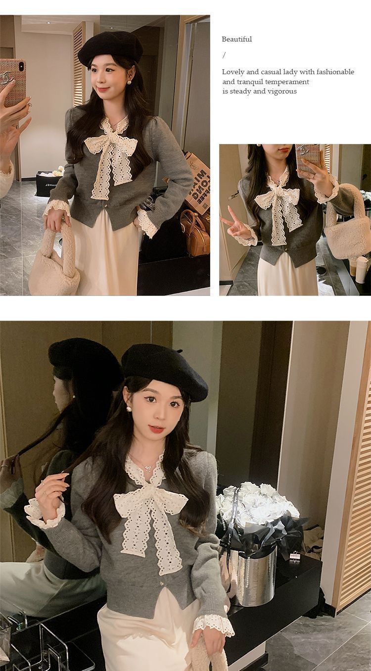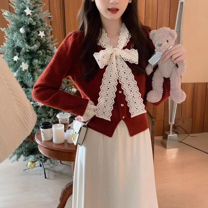 빨간 짧은 스웨터 코트 여성의 가을과 겨울 내부 니트 베이스 카디건 작은 레이스 보우 탑