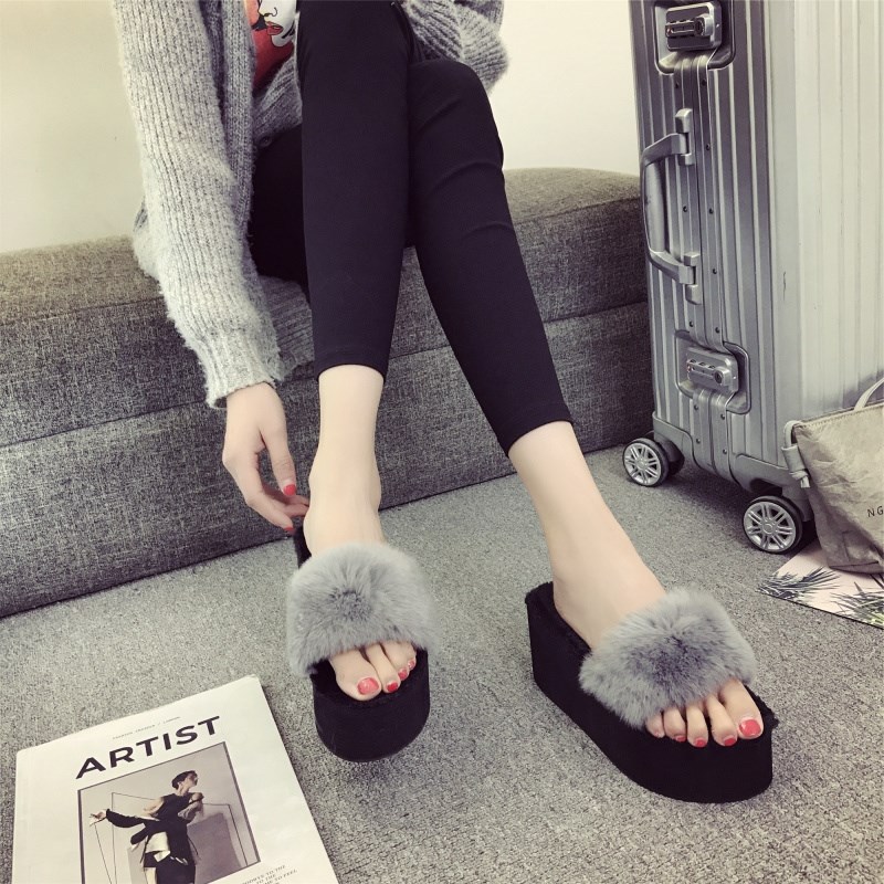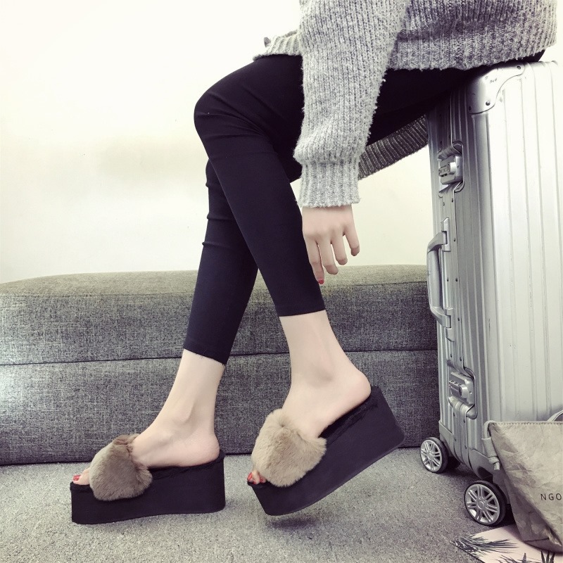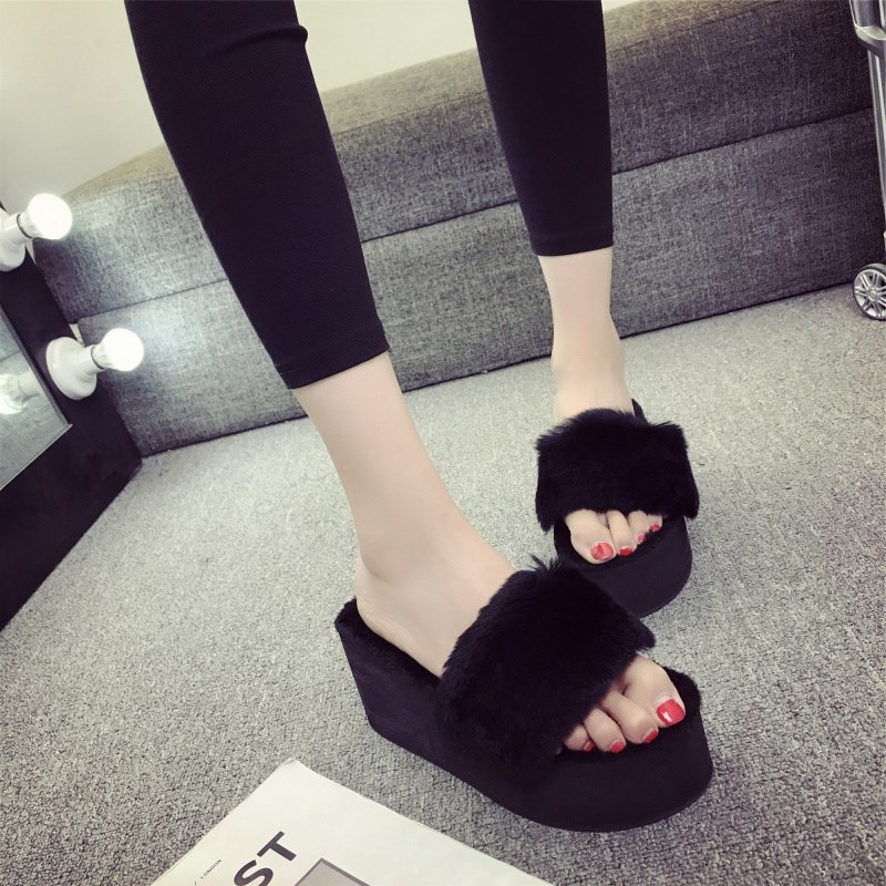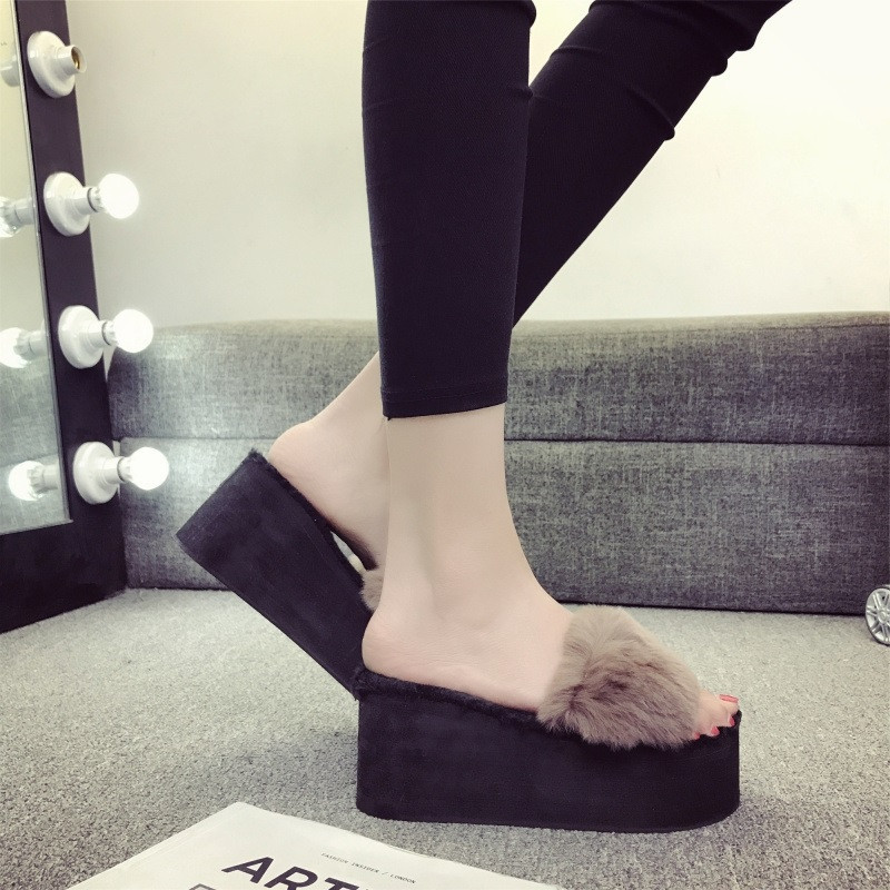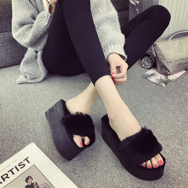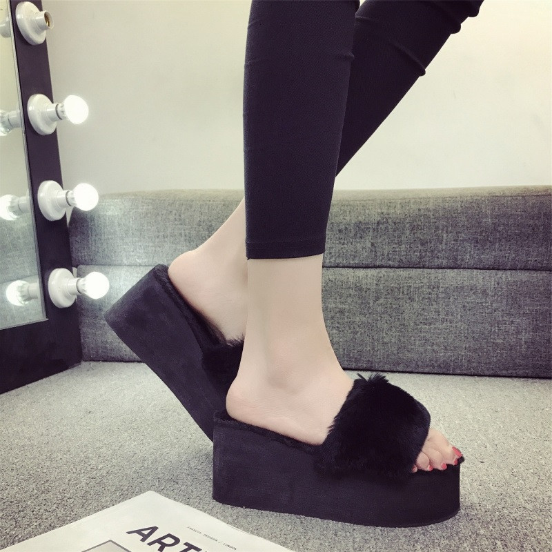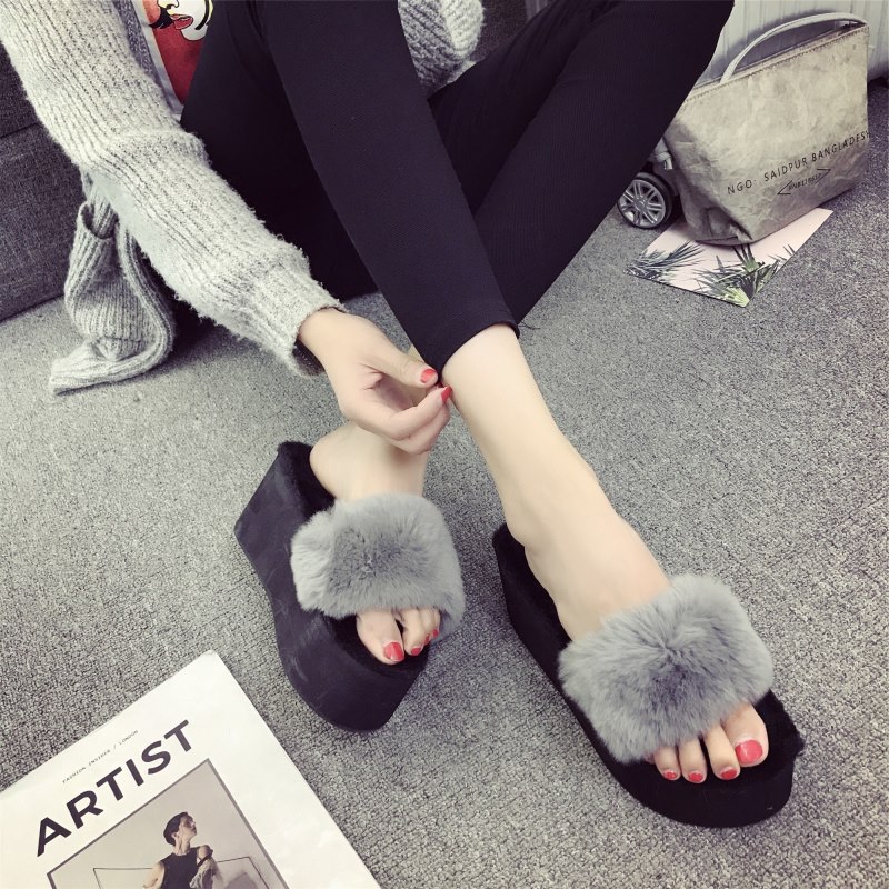가을과 겨울을위한 기모 여자 올 매치 두꺼운 밑창 하이힐 따뜻한 코튼 슬로프 웨지 슬리퍼