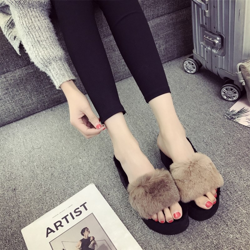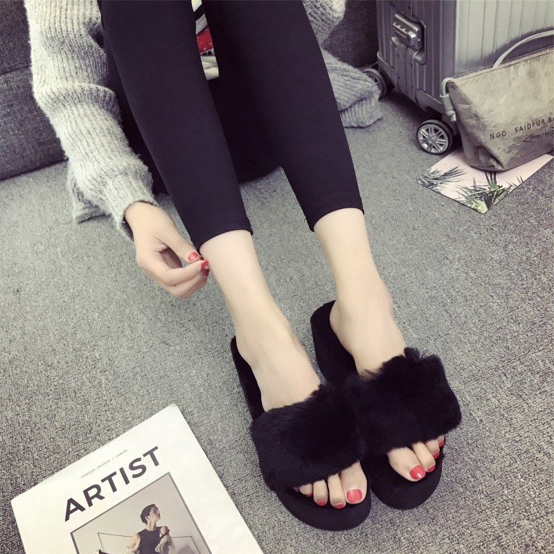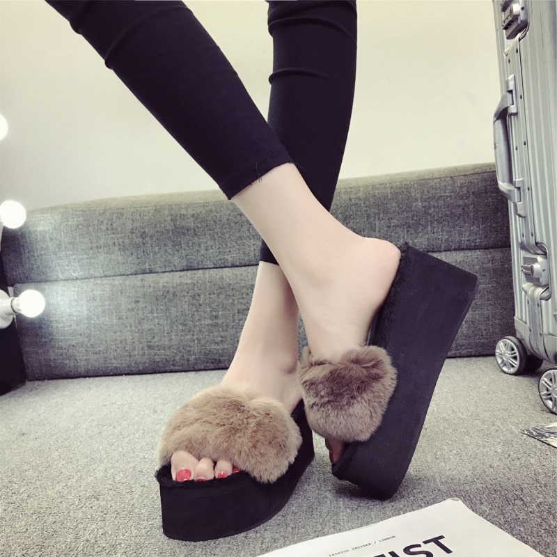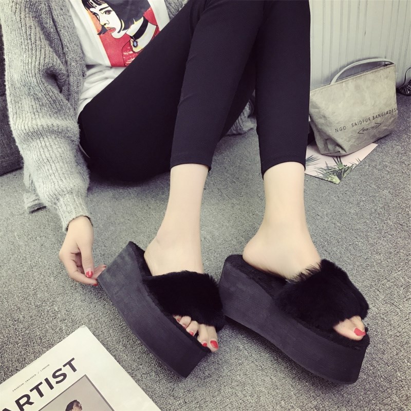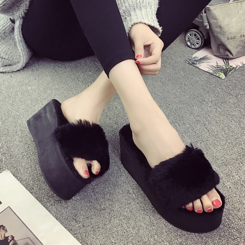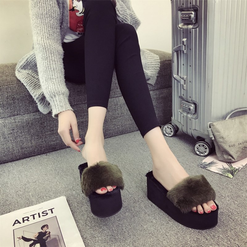 가을과 겨울을위한 기모 여자 올 매치 두꺼운 밑창 하이힐 따뜻한 코튼 슬로프 웨지 슬리퍼