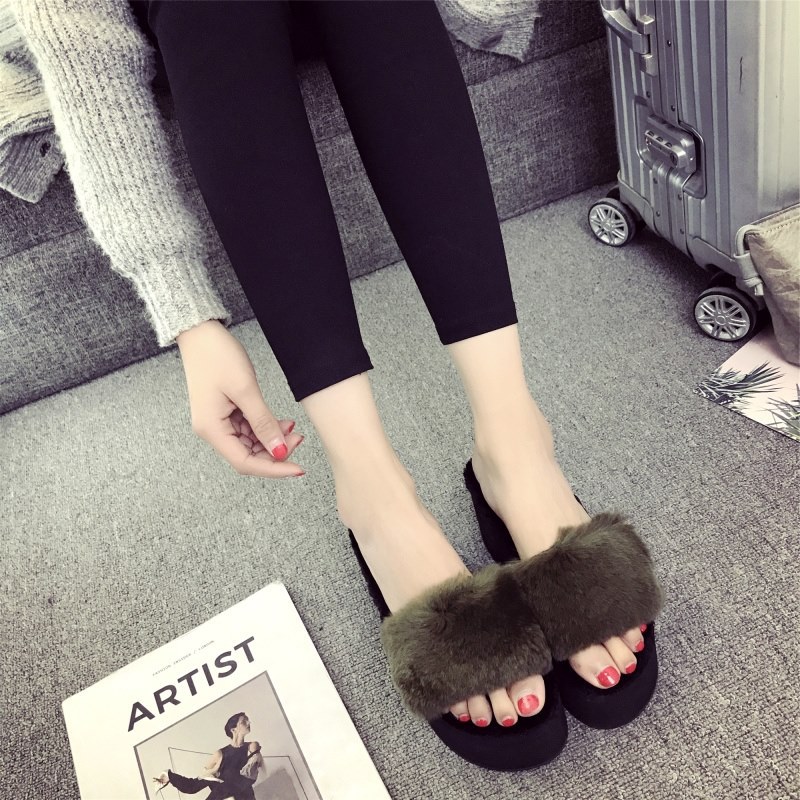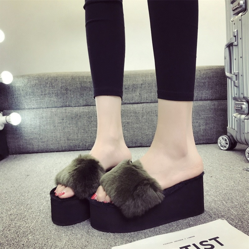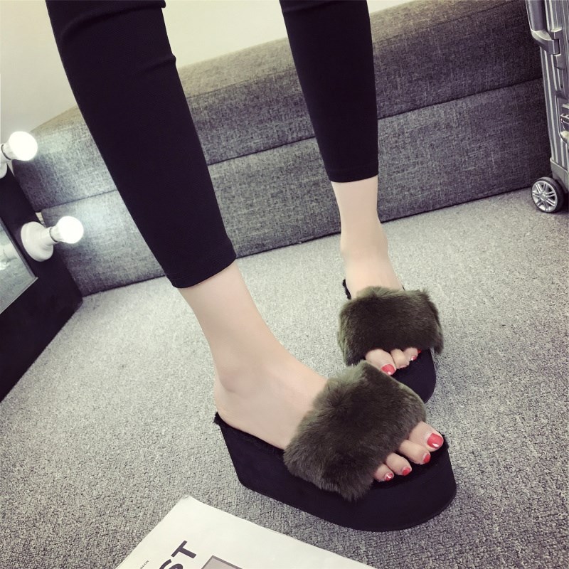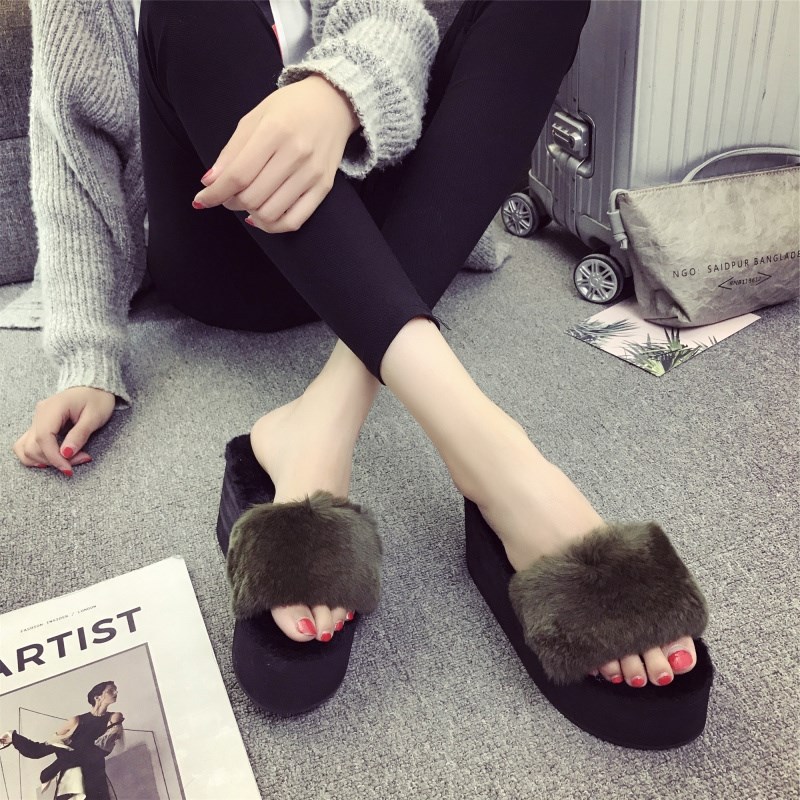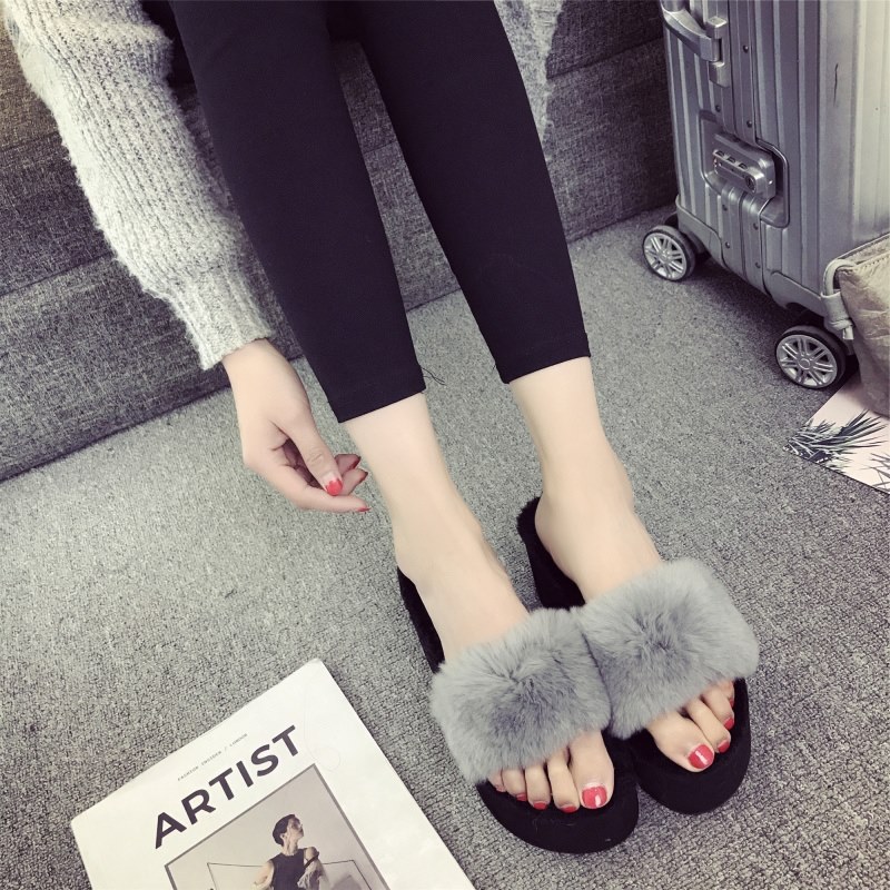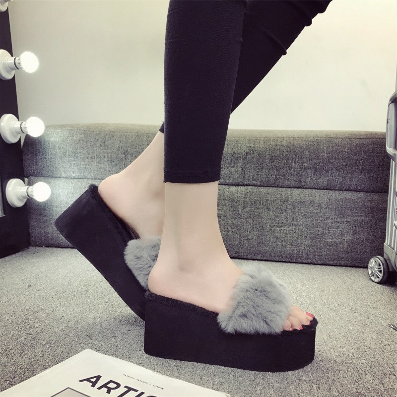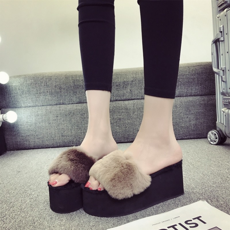 가을과 겨울을위한 기모 여자 올 매치 두꺼운 밑창 하이힐 따뜻한 코튼 슬로프 웨지 슬리퍼
