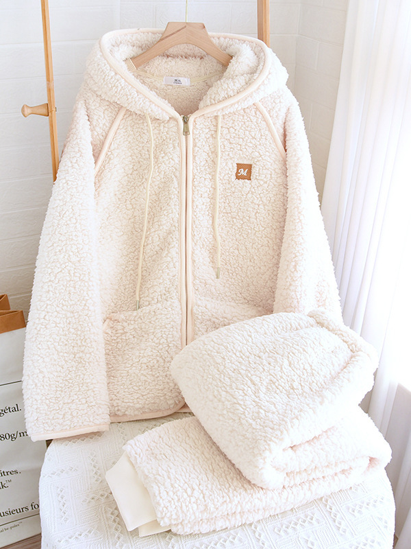 커플 잠옷 양고기 벨벳 세트 여자 겨울 기모 두꺼운 산호 벨벳 남성 후드 지퍼 겉옷 홈 옷스토어 가기