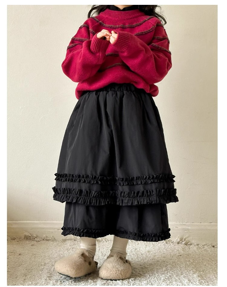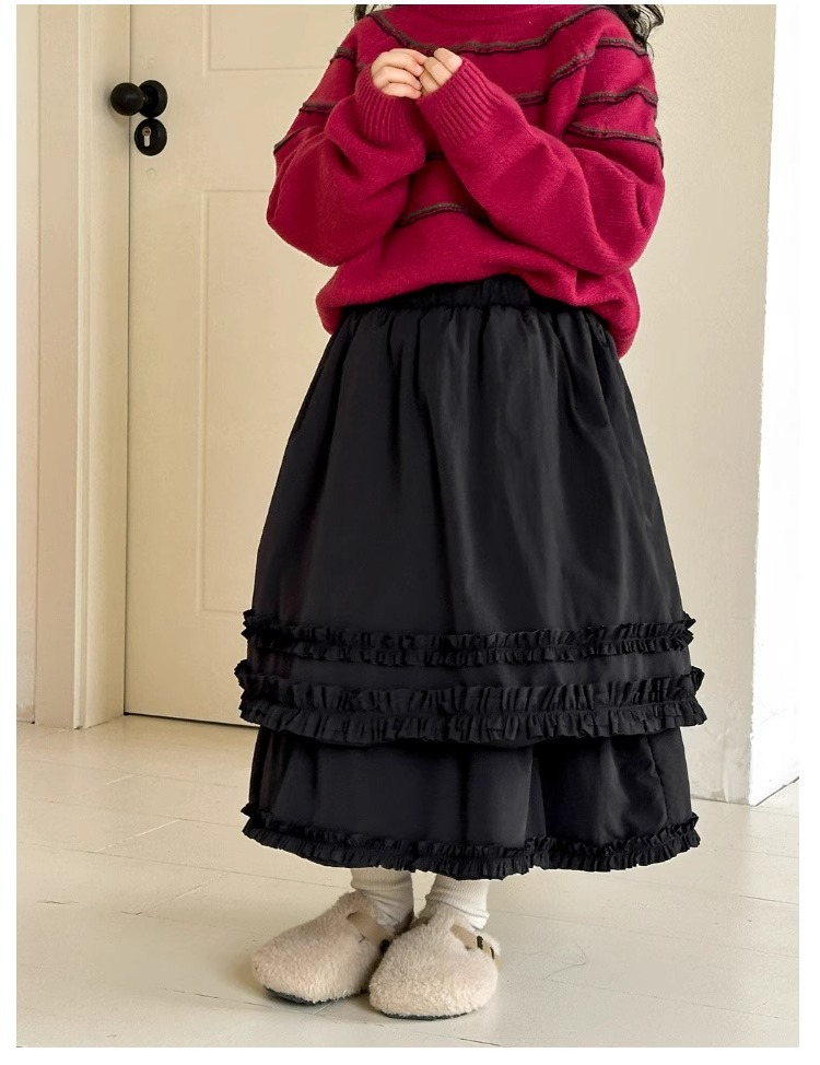 소녀 스커트 가을과 겨울 2024 새로운 어린이 두꺼운 코튼 스커트 캐주얼 긴 스커트 큰 어린이 레이스 공주 스커트