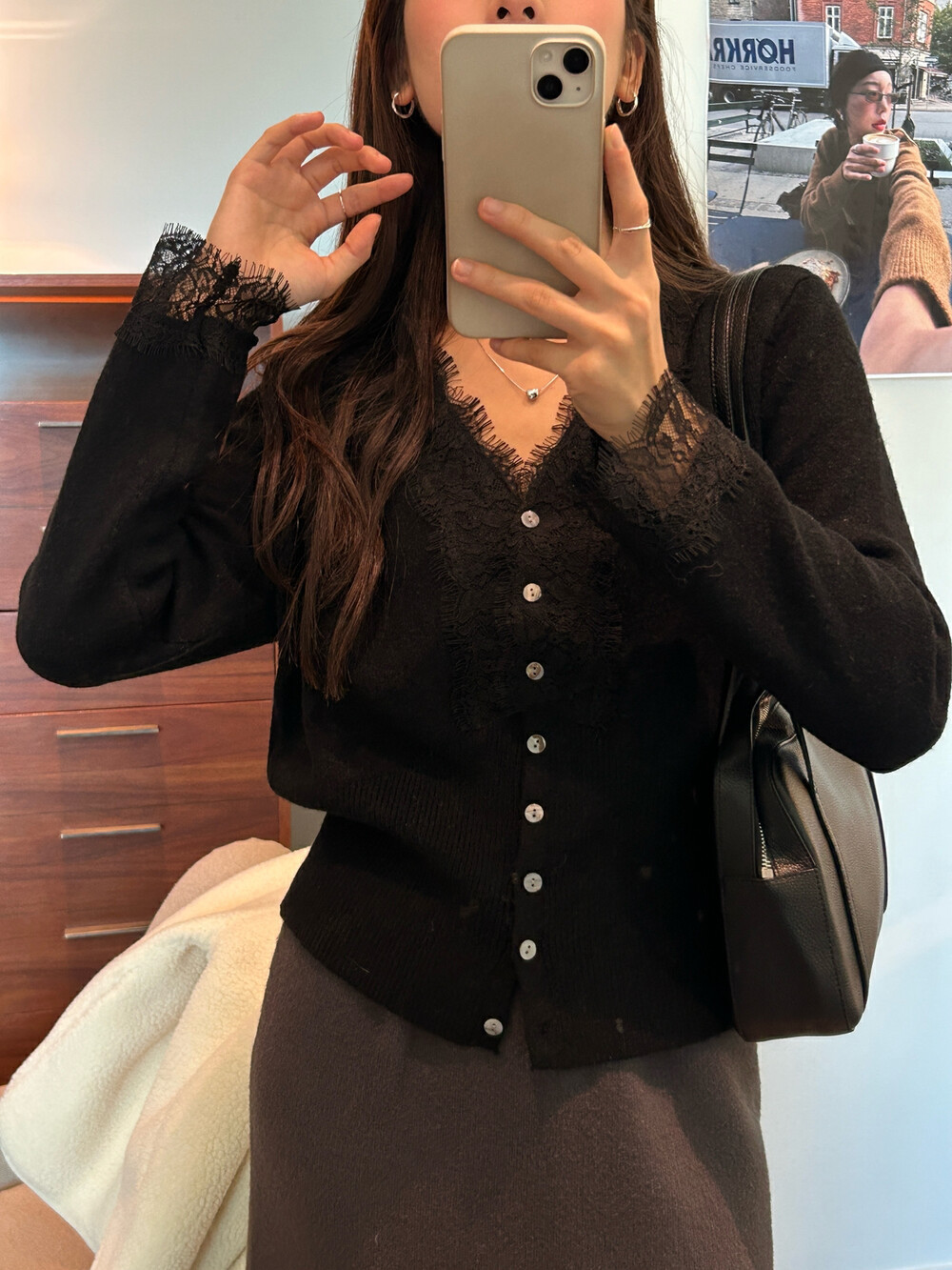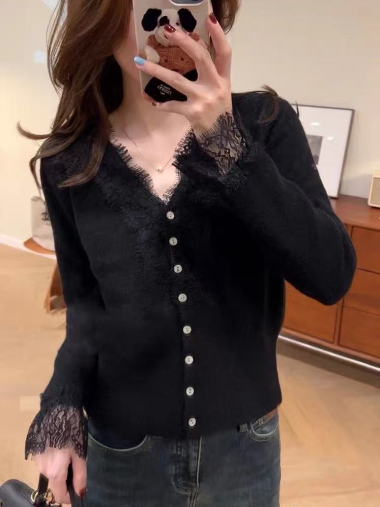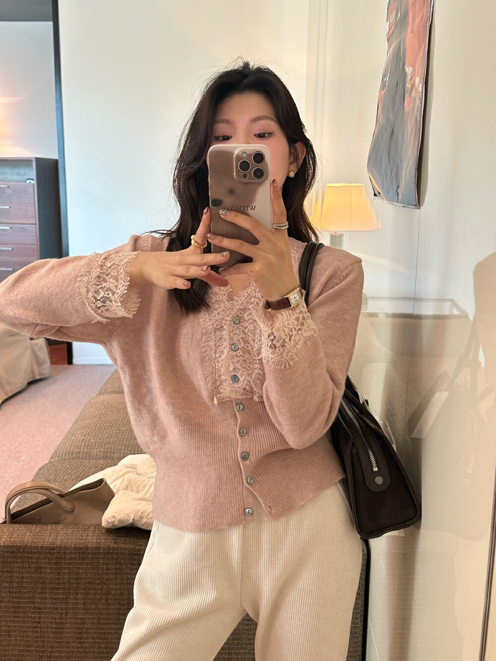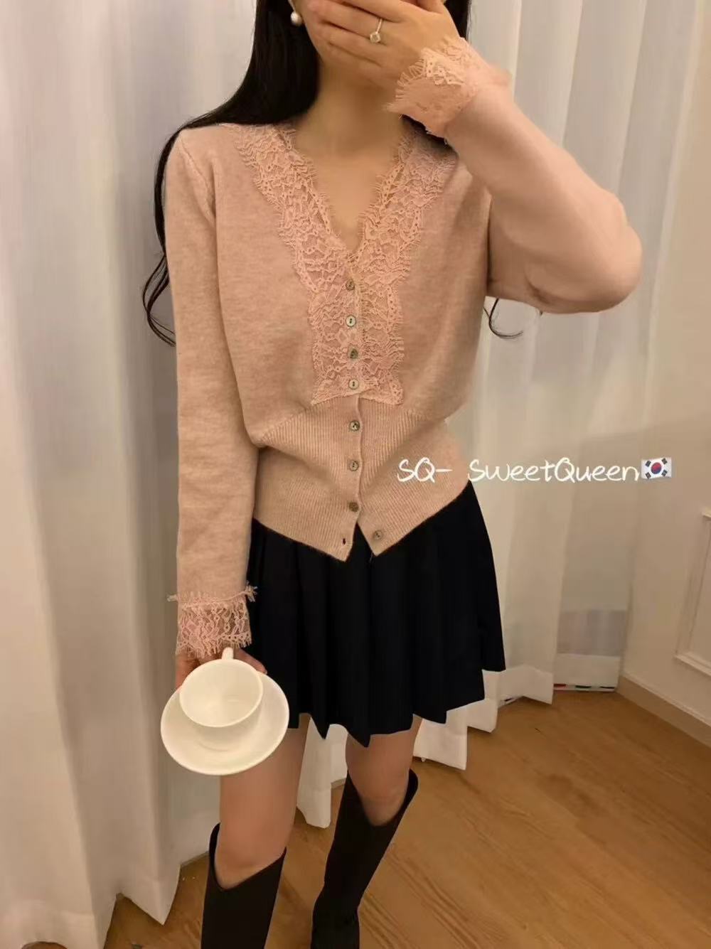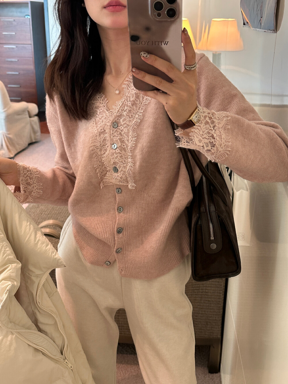 캐시미어 디자인 올 매치 니치 레이스 스티칭베이스 셔츠 쌓인 V 넥 스웨터 니트 카디건 여성