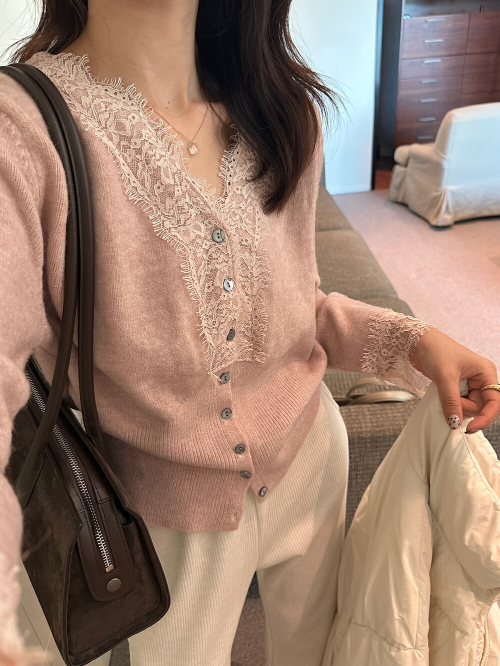 캐시미어 디자인 올 매치 니치 레이스 스티칭베이스 셔츠 쌓인 V 넥 스웨터 니트 카디건 여성스토어 가기
