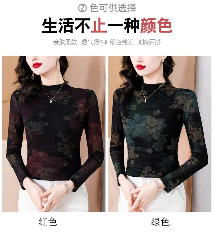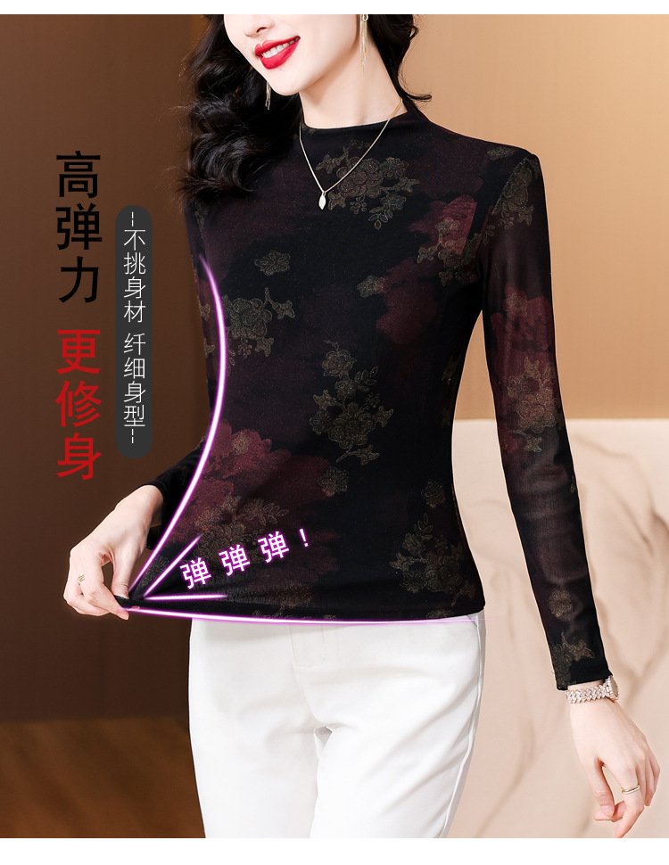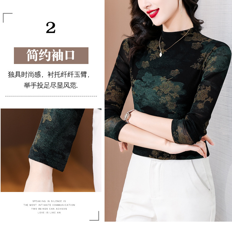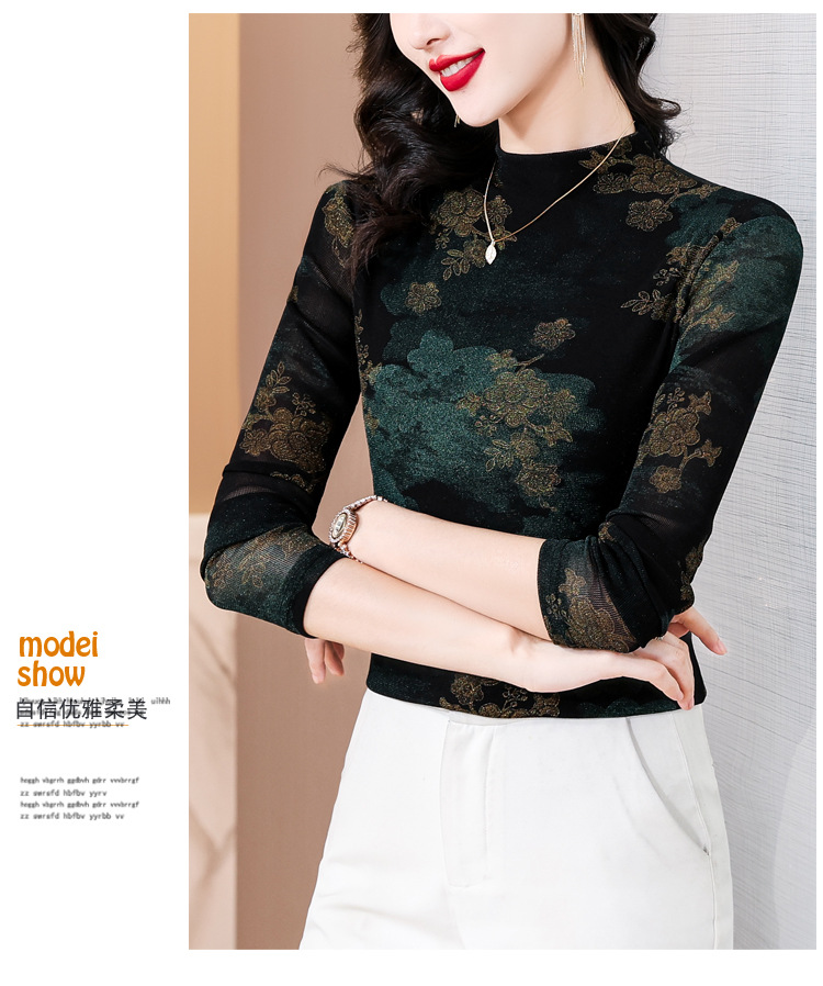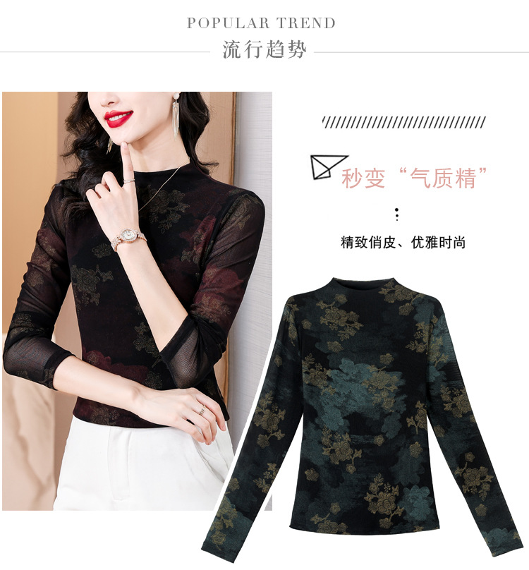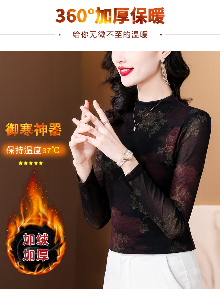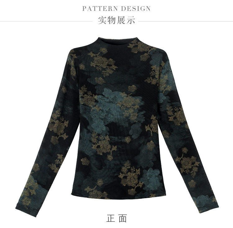 기모 두꺼운 반 높이 칼라 실크 긴팔 티셔츠 여성용 2023 가을 및 겨울 스트레치 메쉬 중국식 인쇄 탑