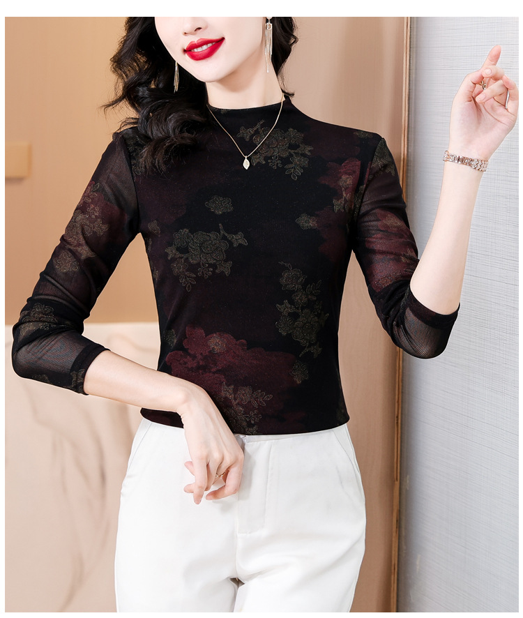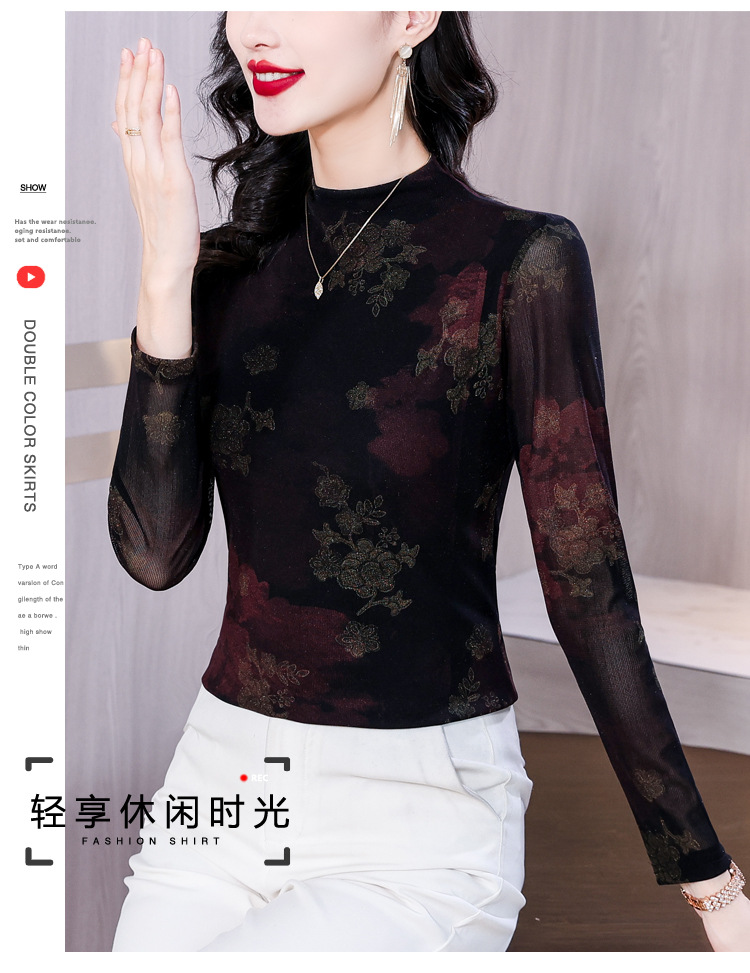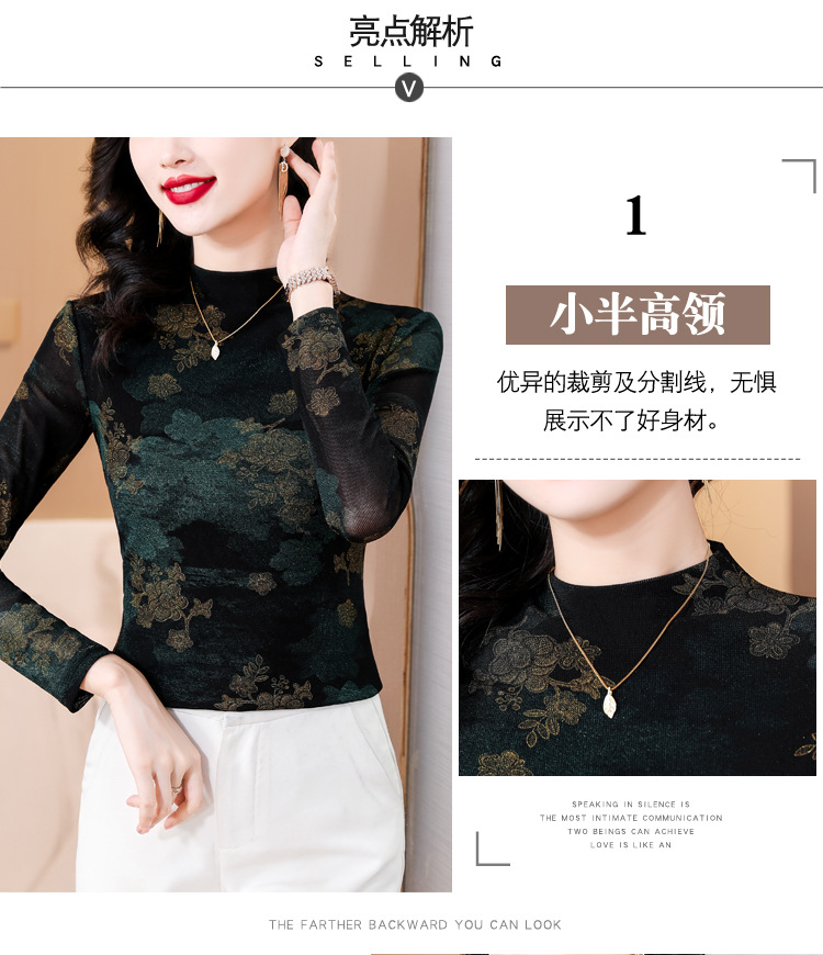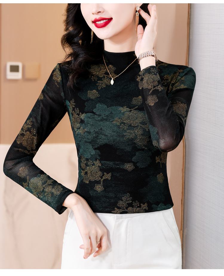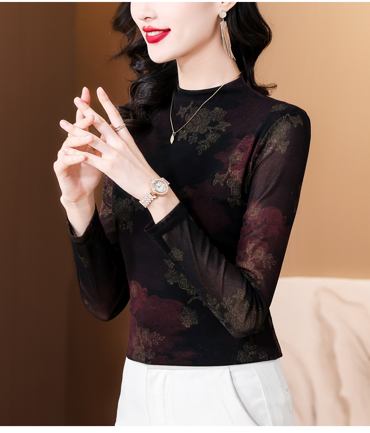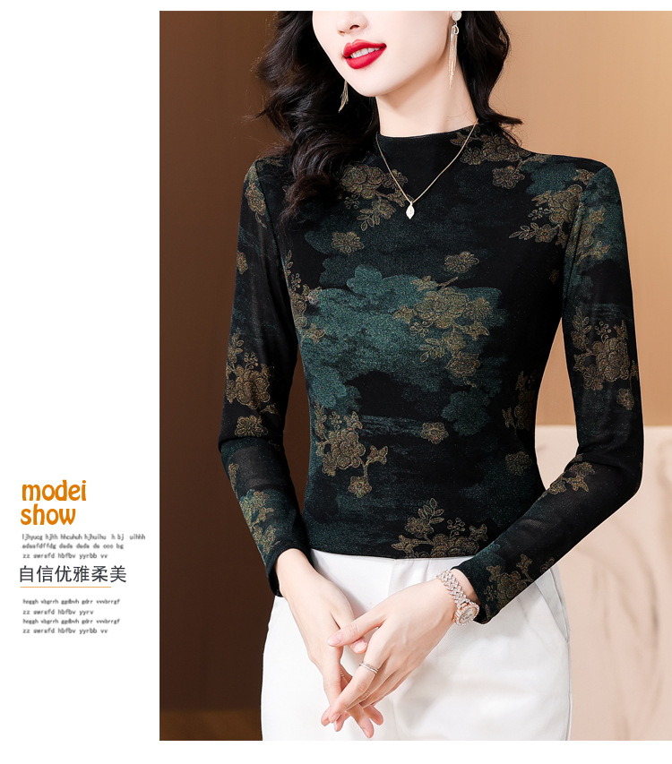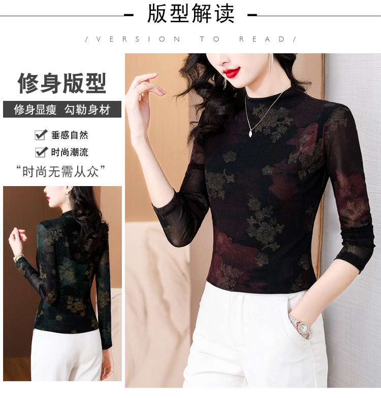 기모 두꺼운 반 높이 칼라 실크 긴팔 티셔츠 여성용 2023 가을 및 겨울 스트레치 메쉬 중국식 인쇄 탑