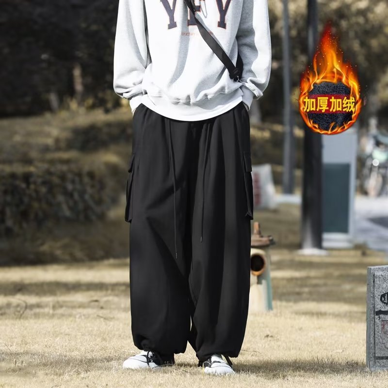 일본식 도시 소년 바지 남자 하이 스트리트 아메리칸 스타일 멀티 포켓 카키 넓은 다리 잡힌 바지 캐주얼 스트레이트 기모