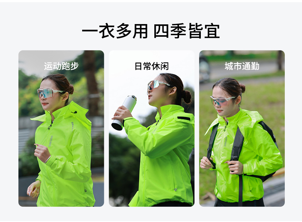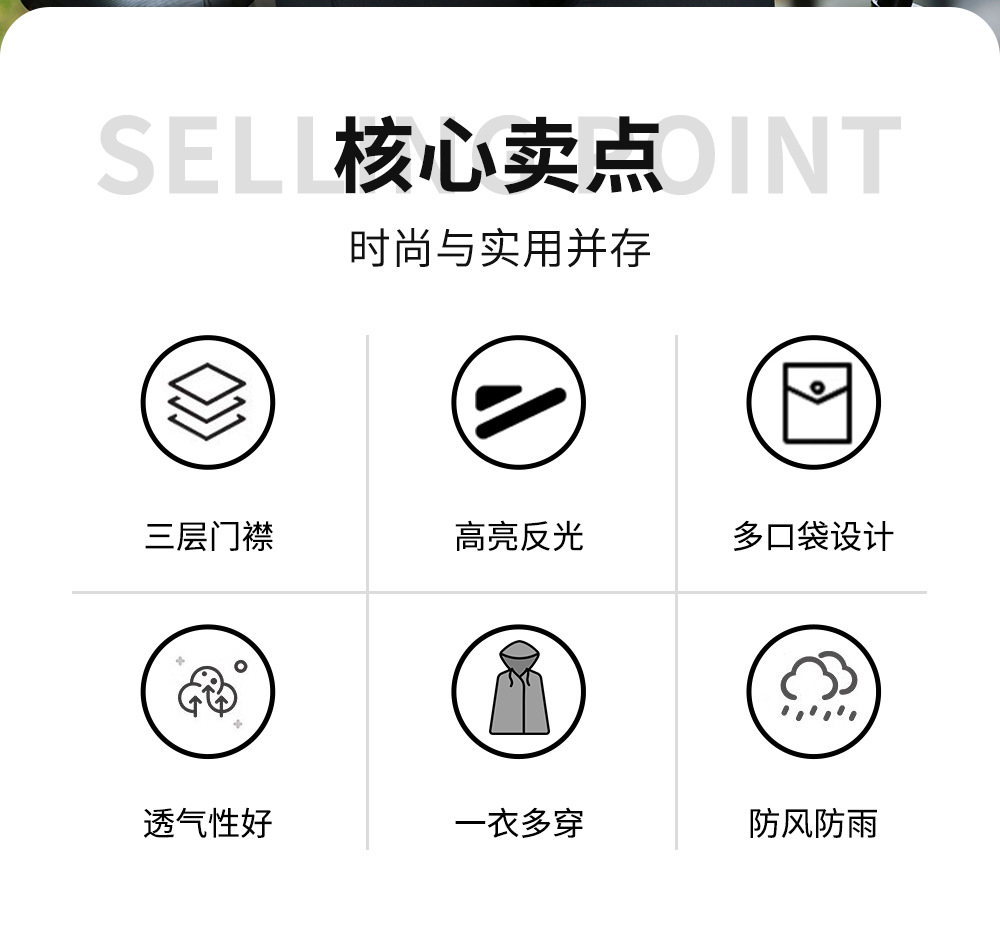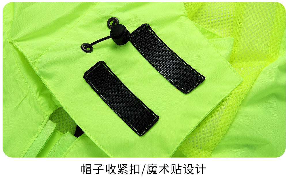 3. 灵活调节:连帽配魔术贴与收紧扣,下摆抽绳及袖口魔术贴,提升舒适与防雨效果。