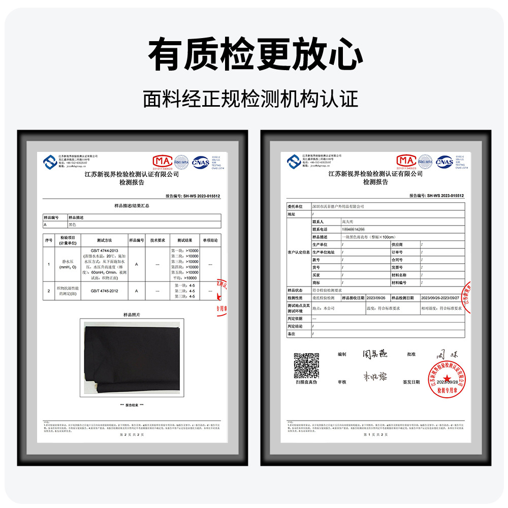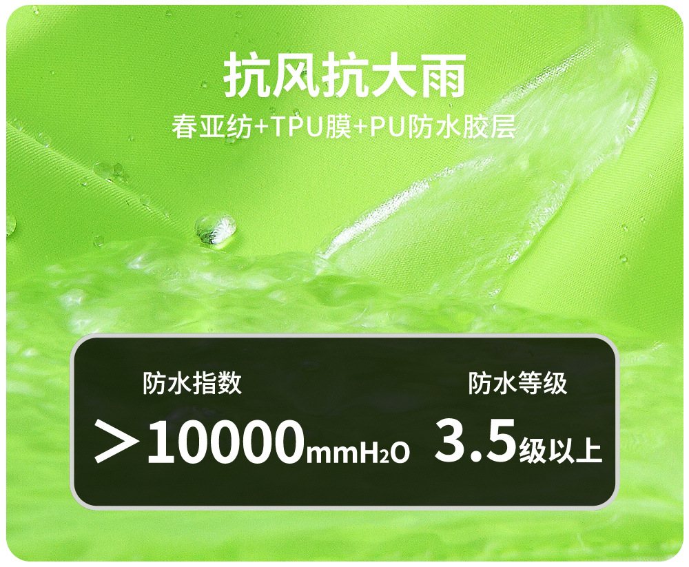 1. 高级材质:采用春亚纺、TPU膜及PU防水胶层,防水等级超4级,防水指数超10000mmH2O,有效防风防大雨。