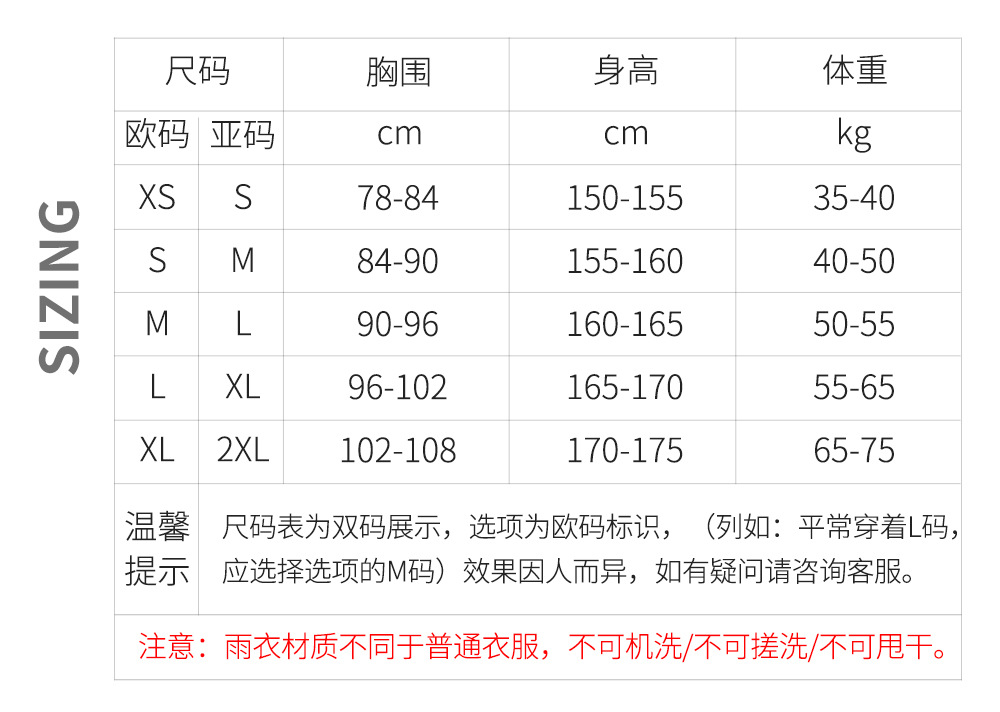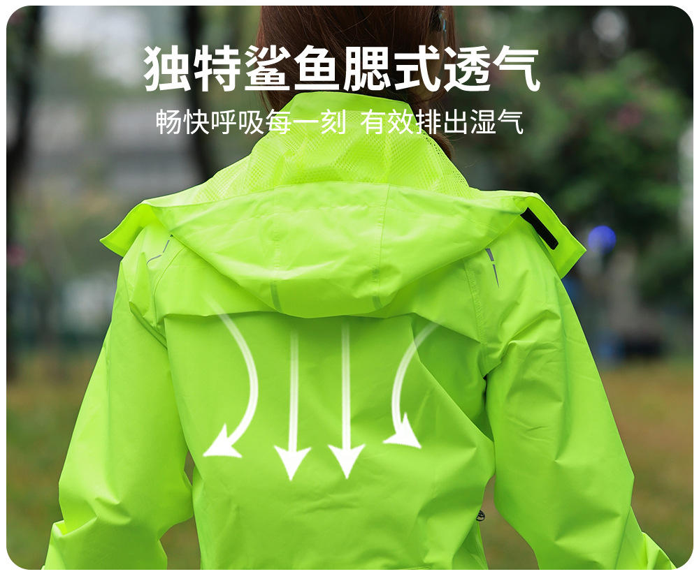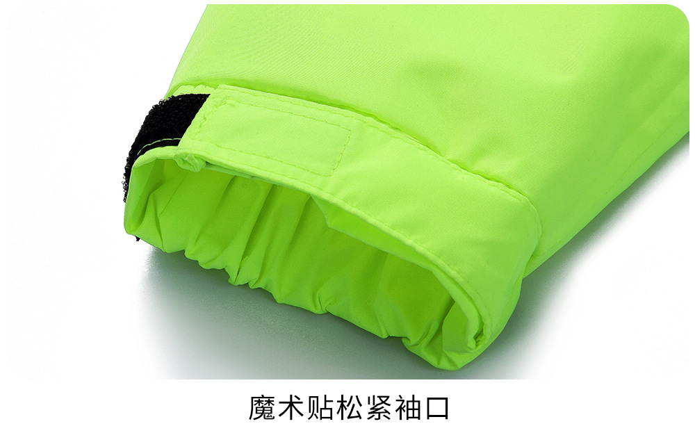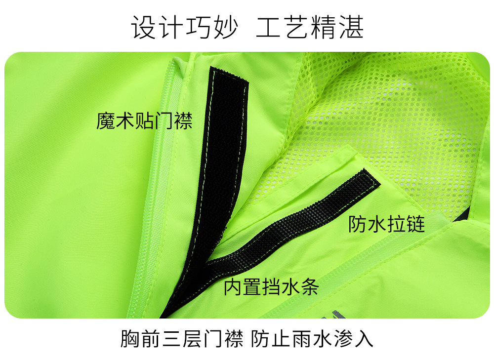 4. 三层防护:胸前魔术贴门襟,结合挡水条与防水拉链,严防雨水渗透。
