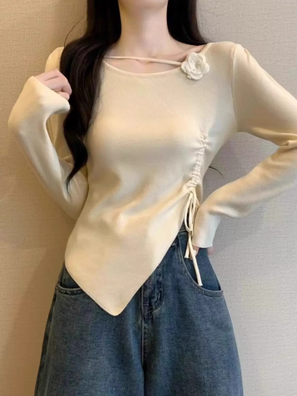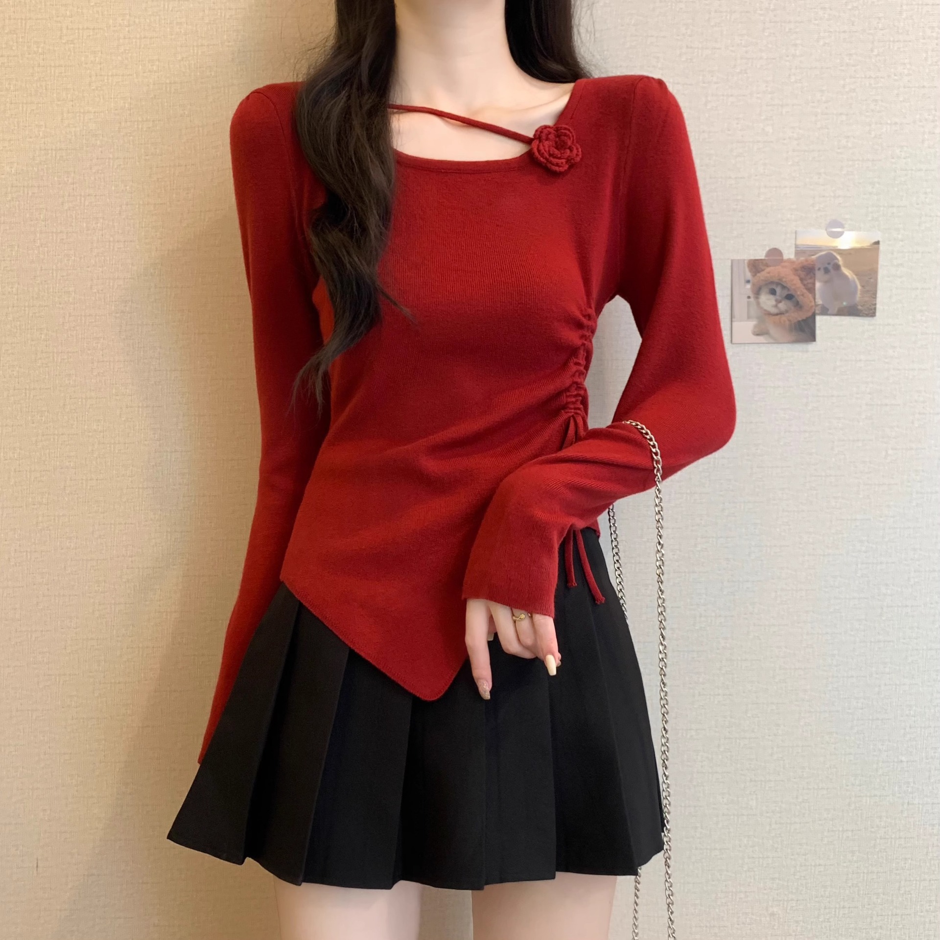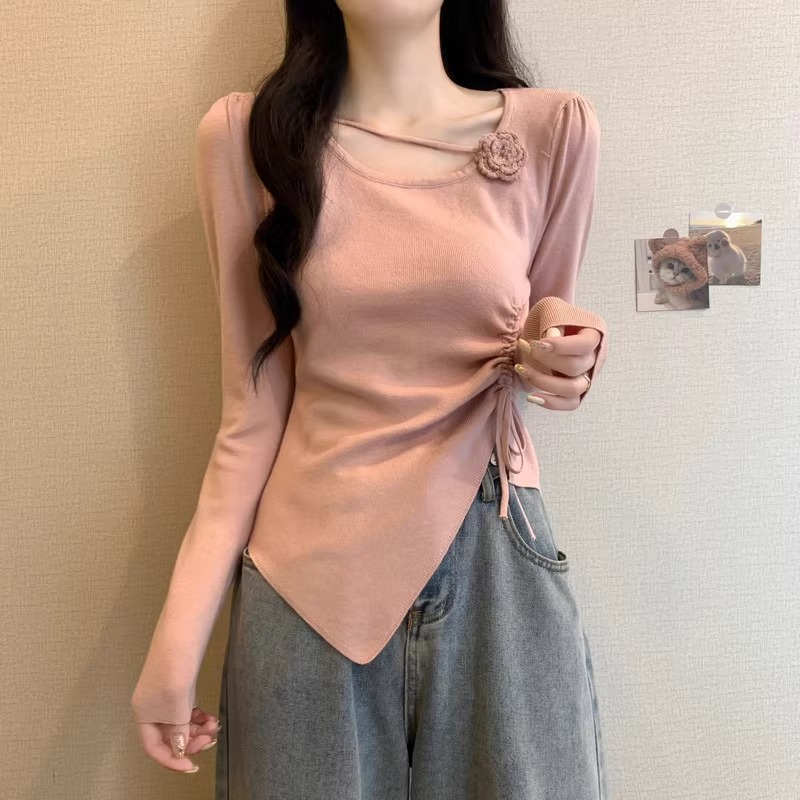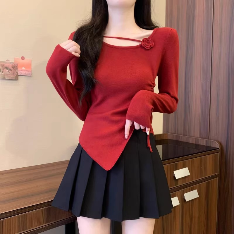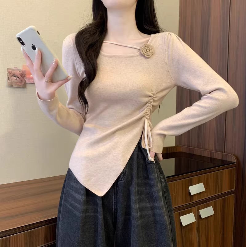 디자인 센스 틈새 불규칙한 슬림 쇼트 탑 여성의 가을과 겨울 2024 새로운 내베이스 니트 스웨터 스웨터스토어 가기