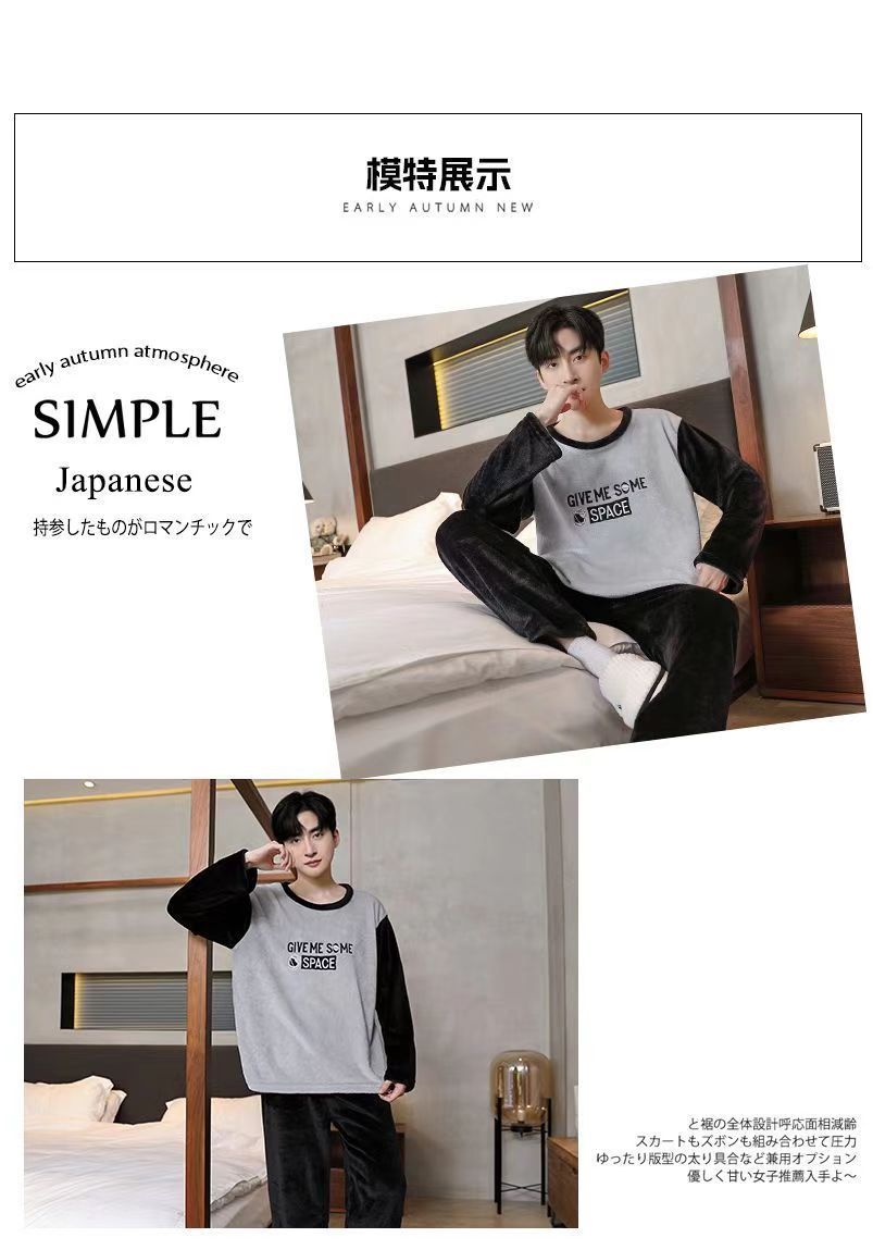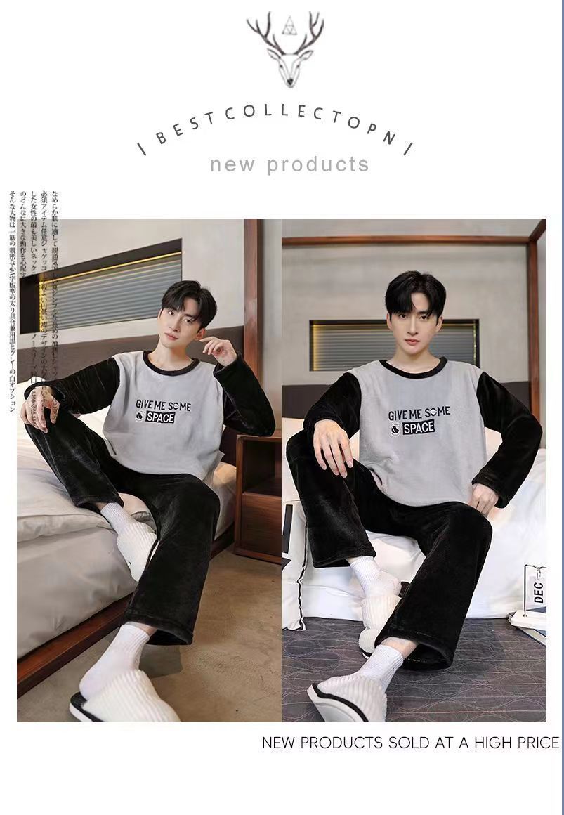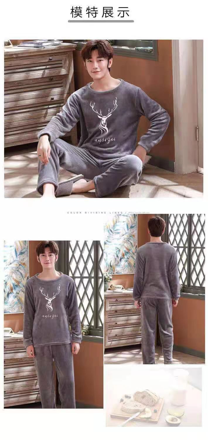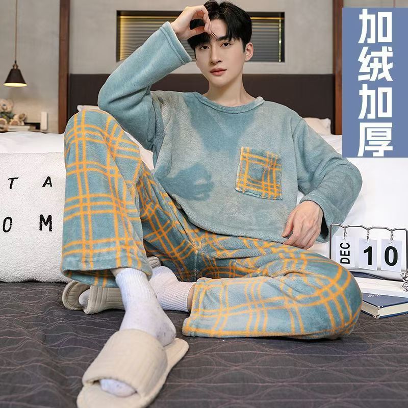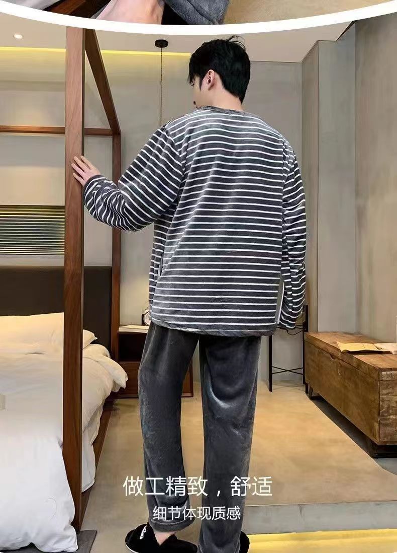 남자 잠옷 가을과 겨울 줄무늬 플란넬 세트 겉옷 두꺼운 산호 양털 학생 한국식 플러스 사이즈 홈 옷스토어 가기