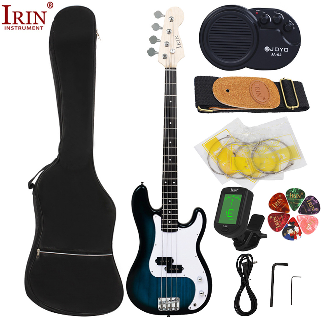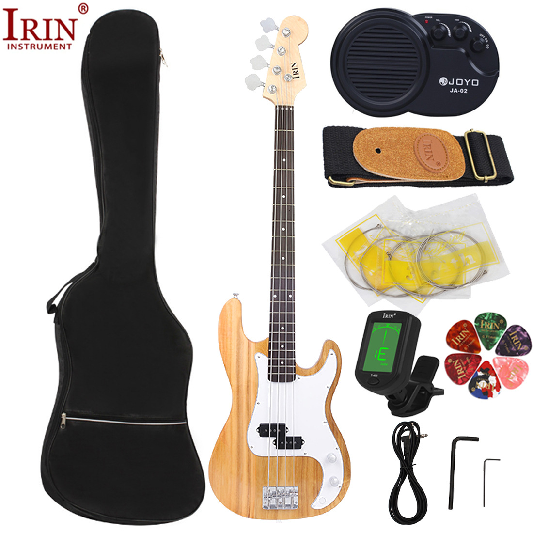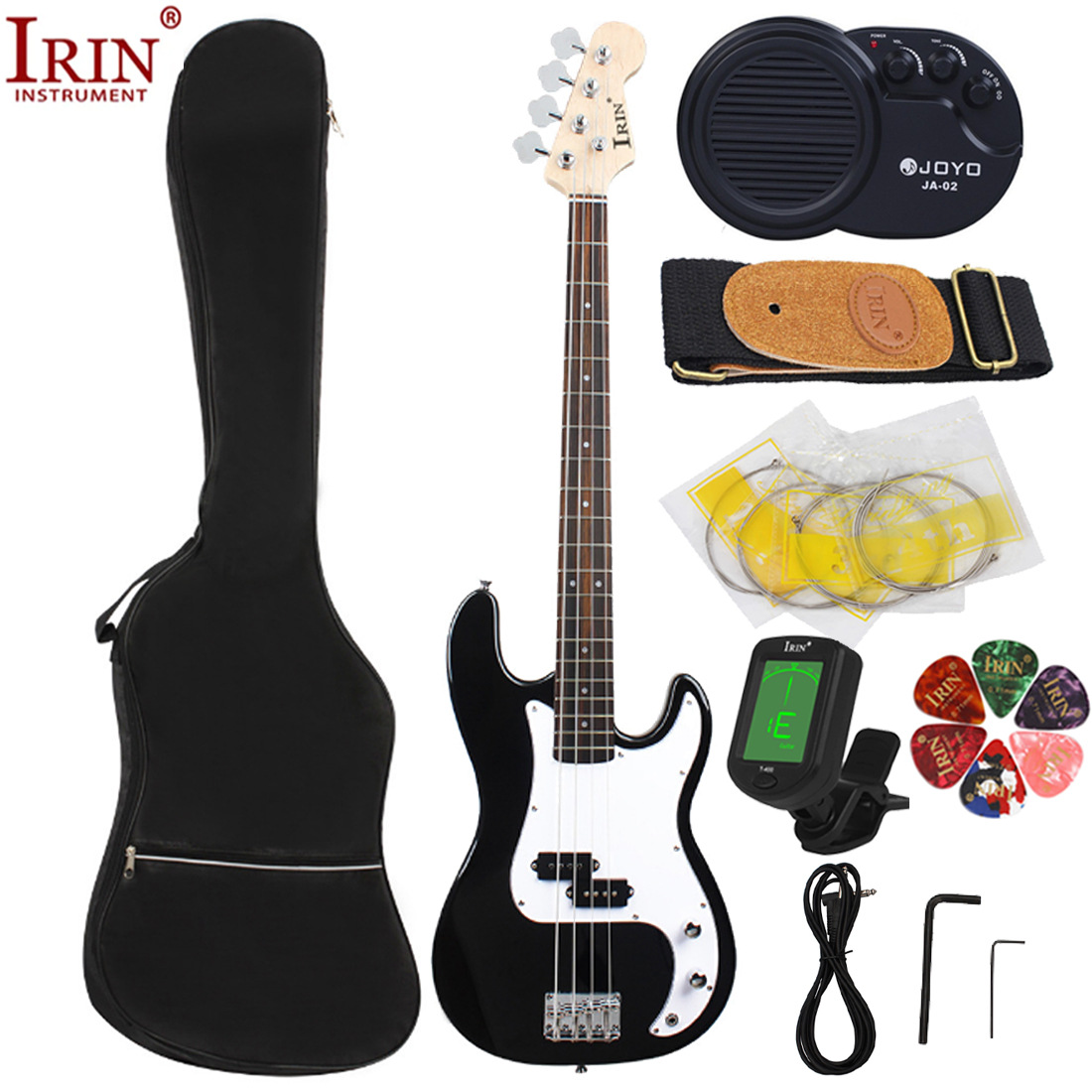 包装清单:电贝司*1 包*1 音响*1 调音器*1 琴弦*1 背带*1(颜色随机) 拨片*6(颜色随机) 连接线*1 扳手*2