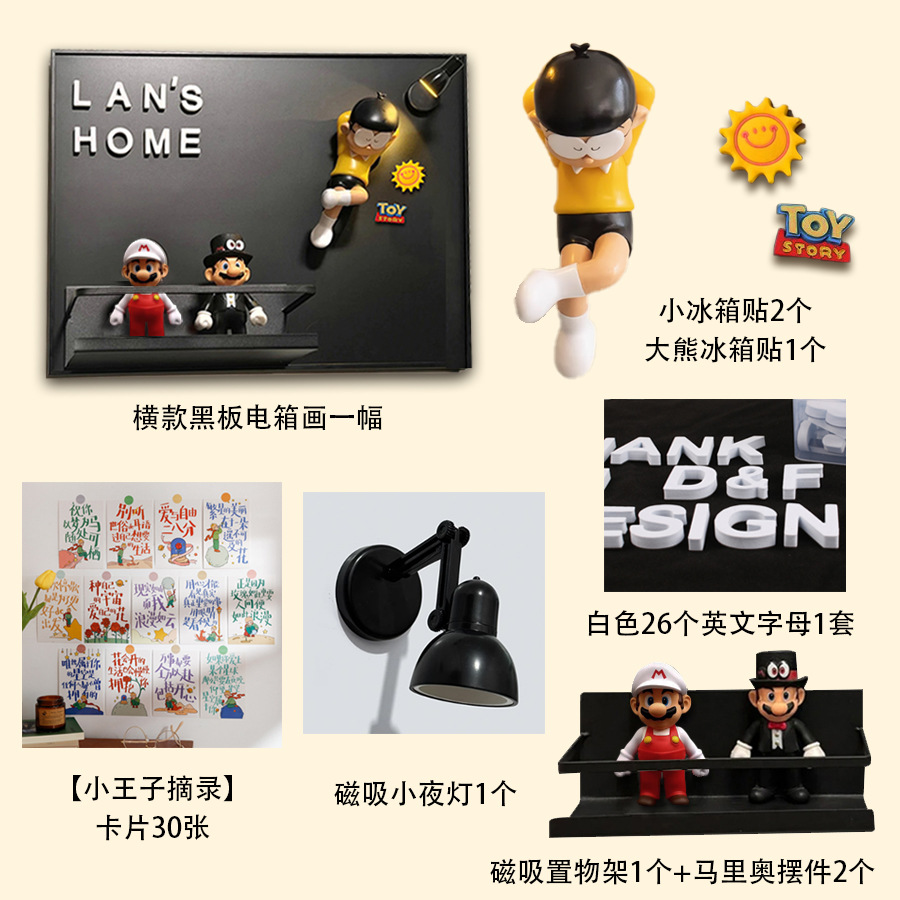 • 가로 인쇄 + 큰 곰 냉장고 자석 + 검은 빛 + 편지 + 선반 + 마리오 2개 + 어린 왕자 카드 + 작은 냉장고 자석 2개