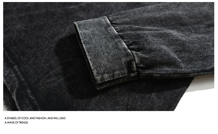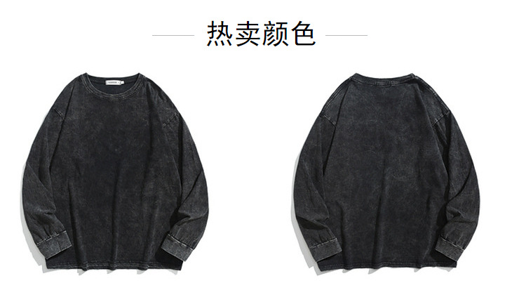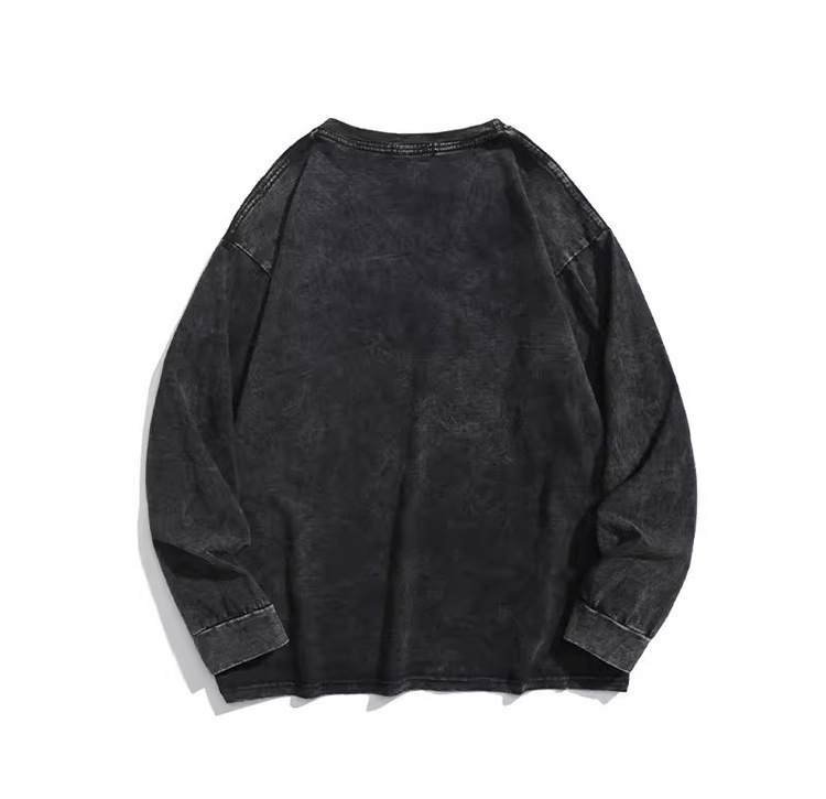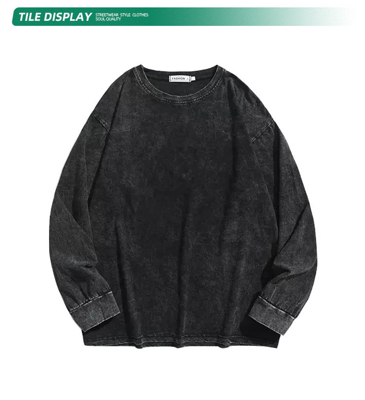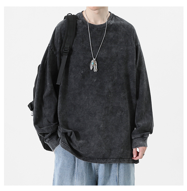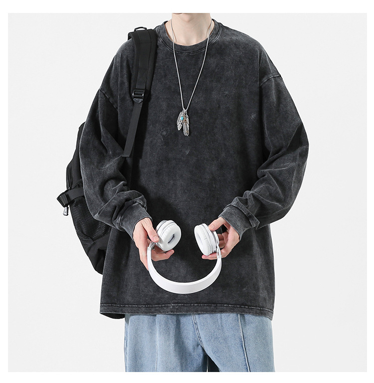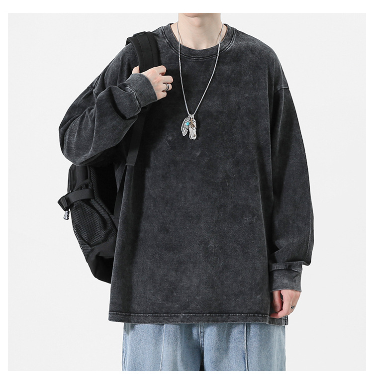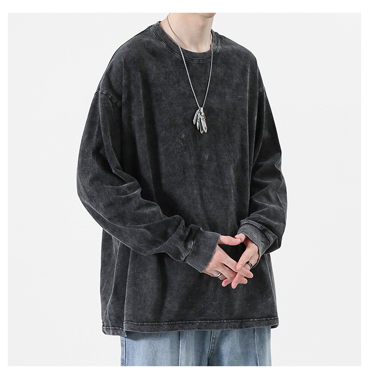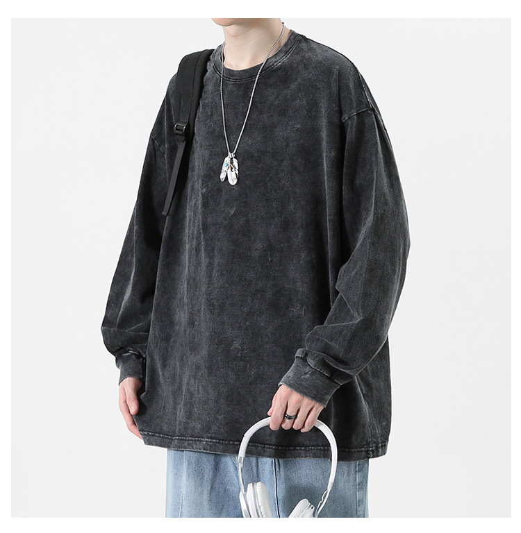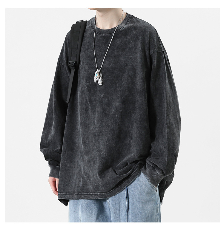 순면 하이 스트리트 워싱 디스트레스드 긴팔 티셔츠 남성 봄, 가을 트렌디 레트로 오버사이즈 힙합 캐주얼 루즈 탑