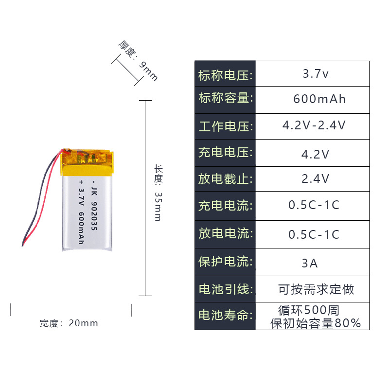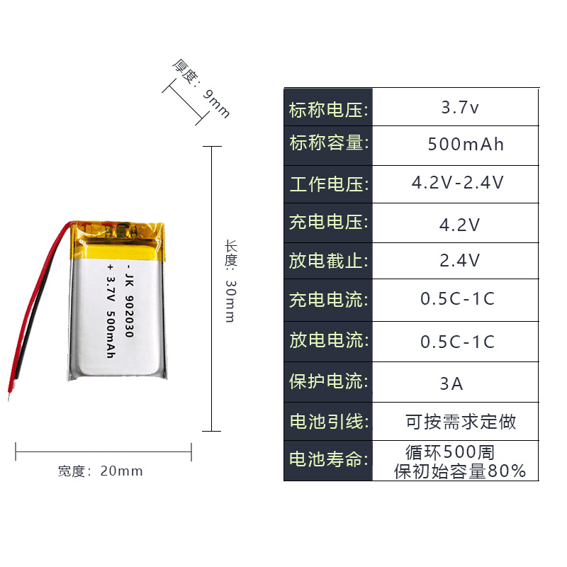 • 902030-500mAh 배터리 + 보호 보드 콘센트