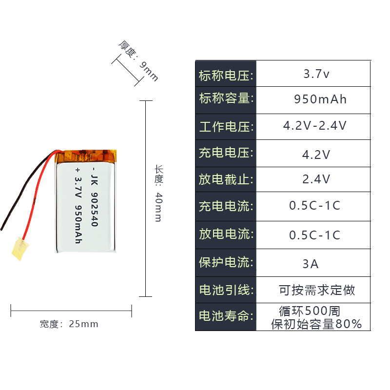 • 902540-950mAh 배터리 + 보호 보드 콘센트