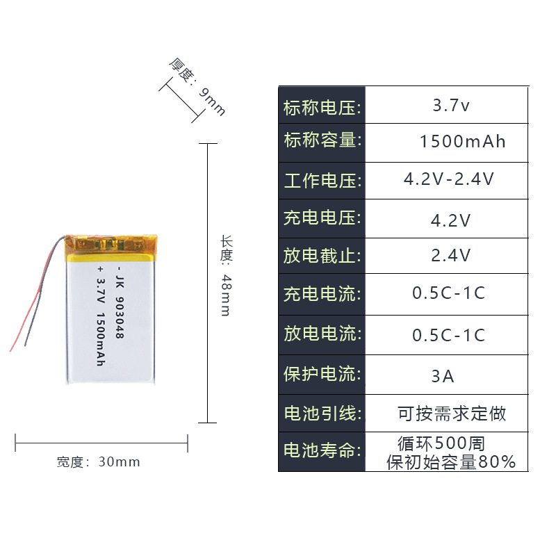 • 903048-1500mAh 배터리 + 보호 보드 콘센트